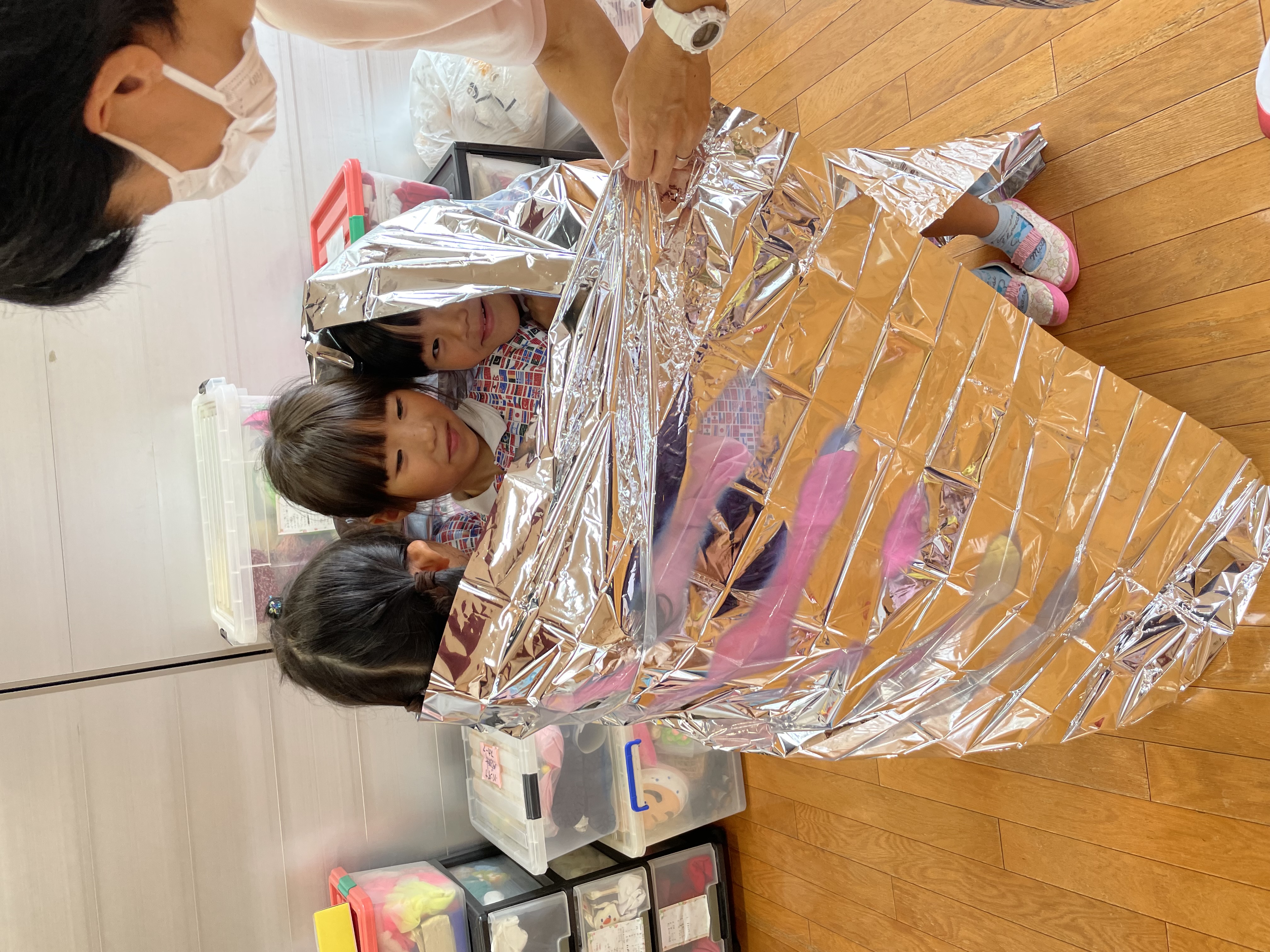 地震・津波の訓練はしっかり頭を守って隠れる事が出来ました。今回はまもるんボックスについても