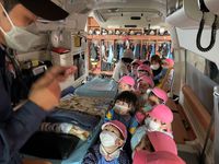 消防署では、消防車・救急車の見学、機材なども実際に触らせてもらいました。