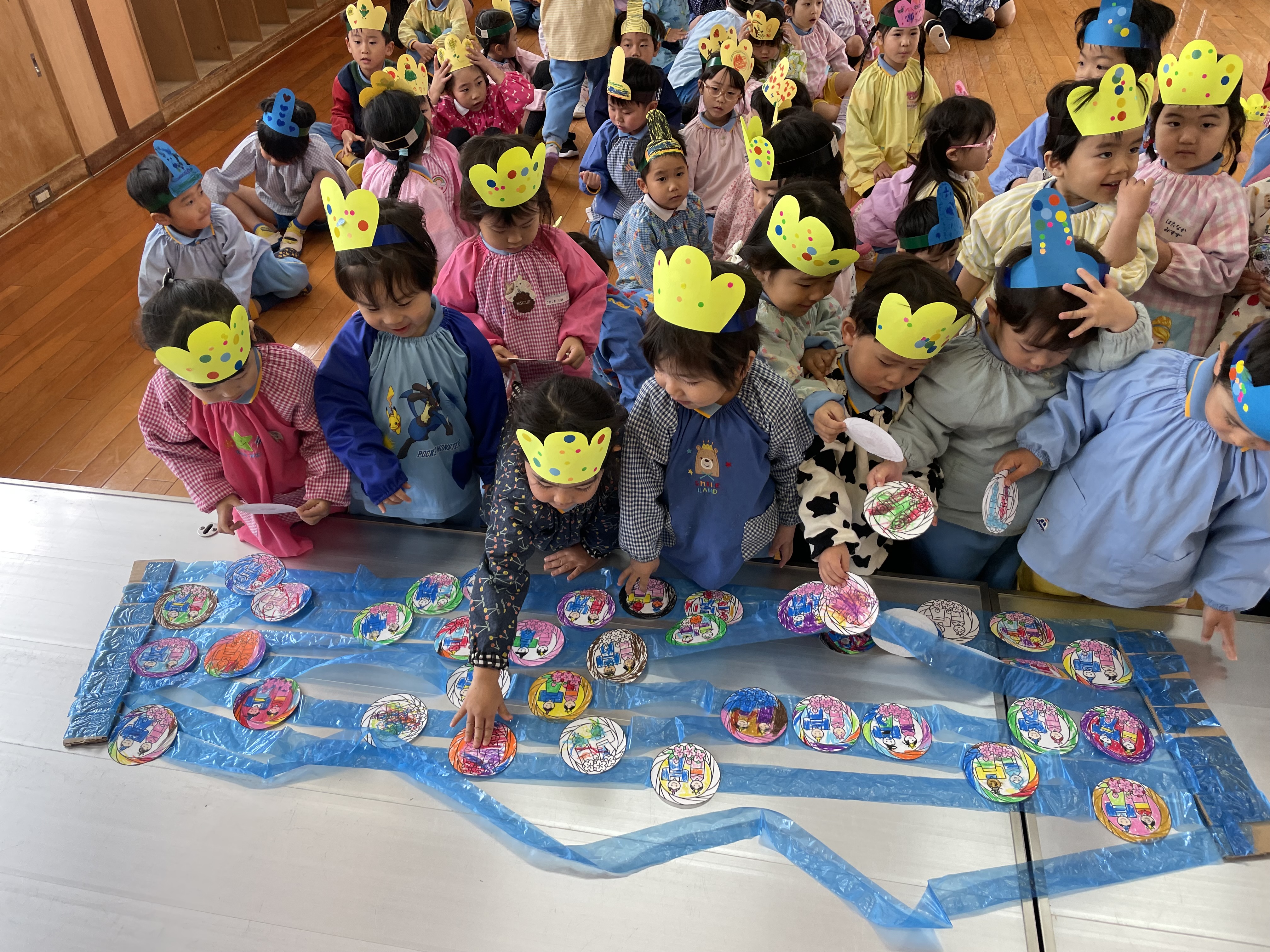 すずらんテープで作った川にお子様方が描いたひな人形を流してみました。