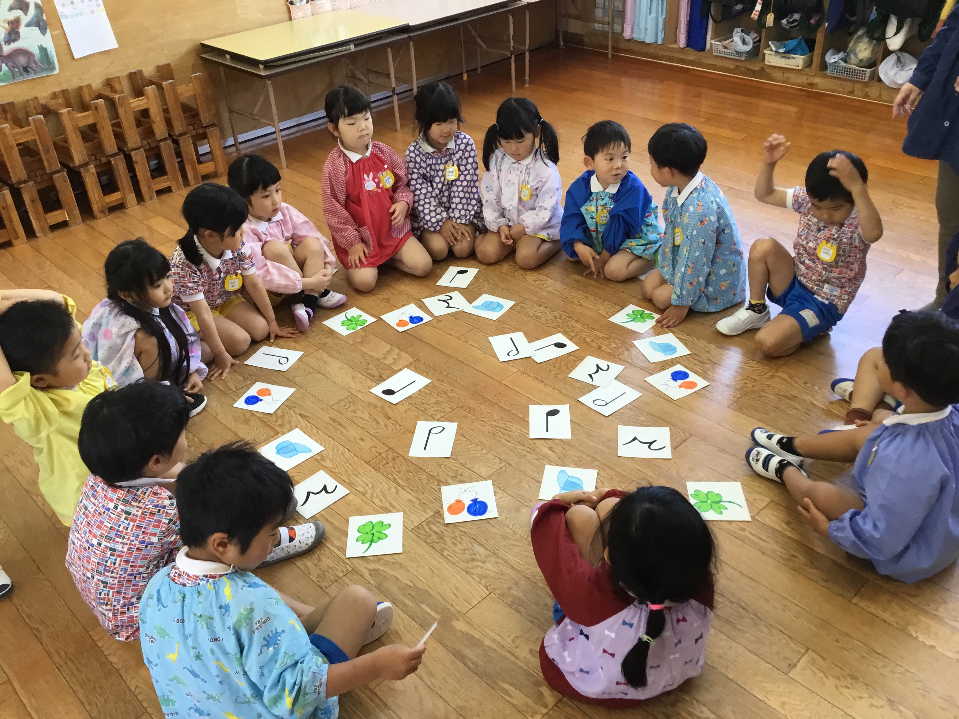 ピーターパンさんは歌やリズム打ち体操をどんどん進めていきます!最後の音符を使ってのかるたゲームが大好きです!