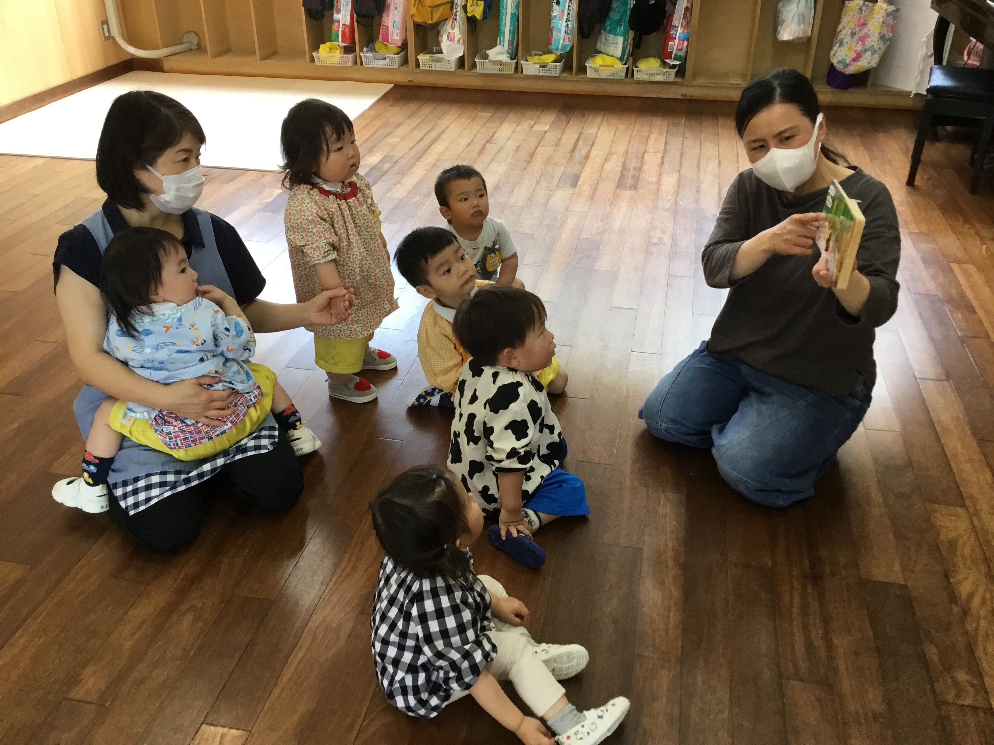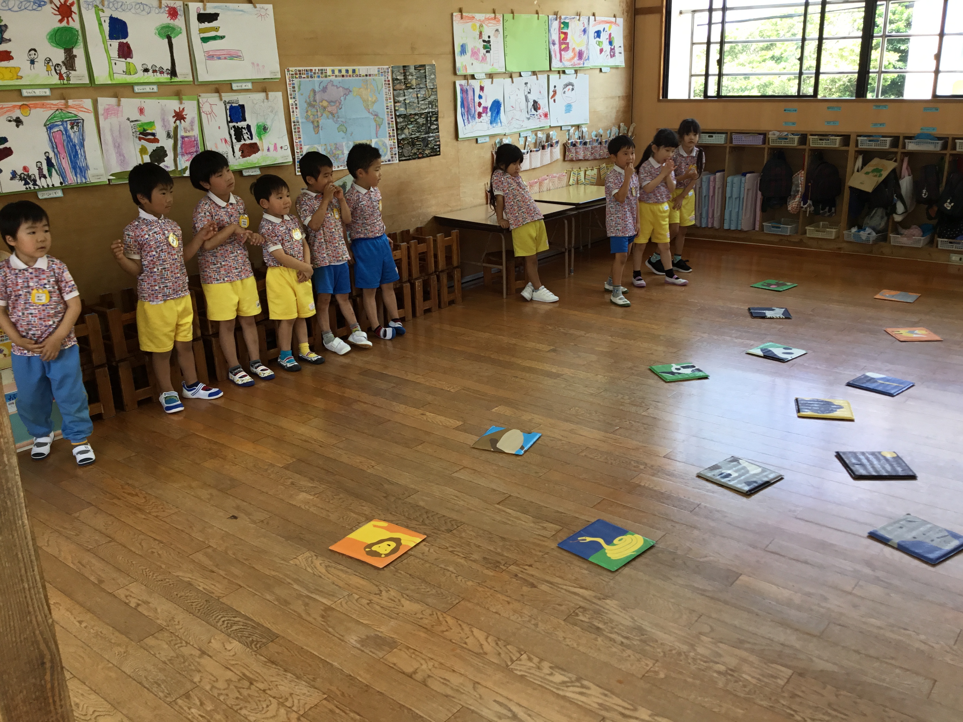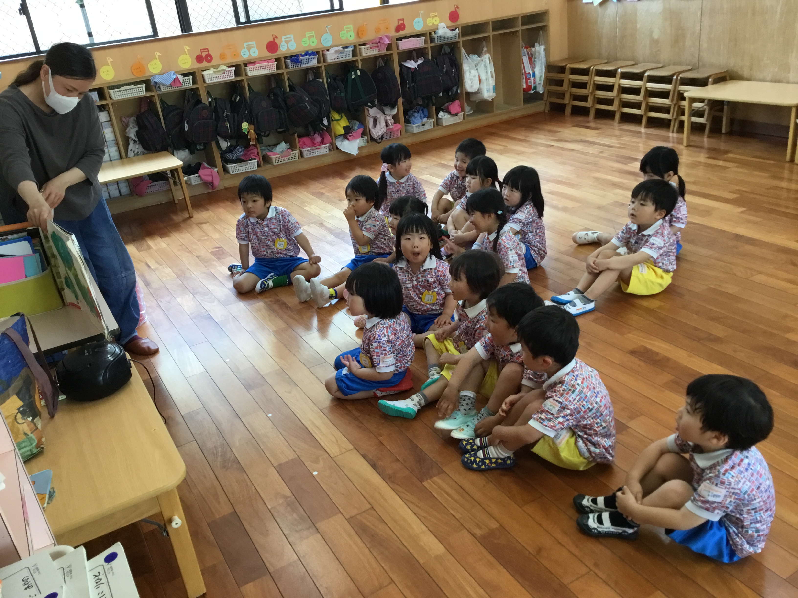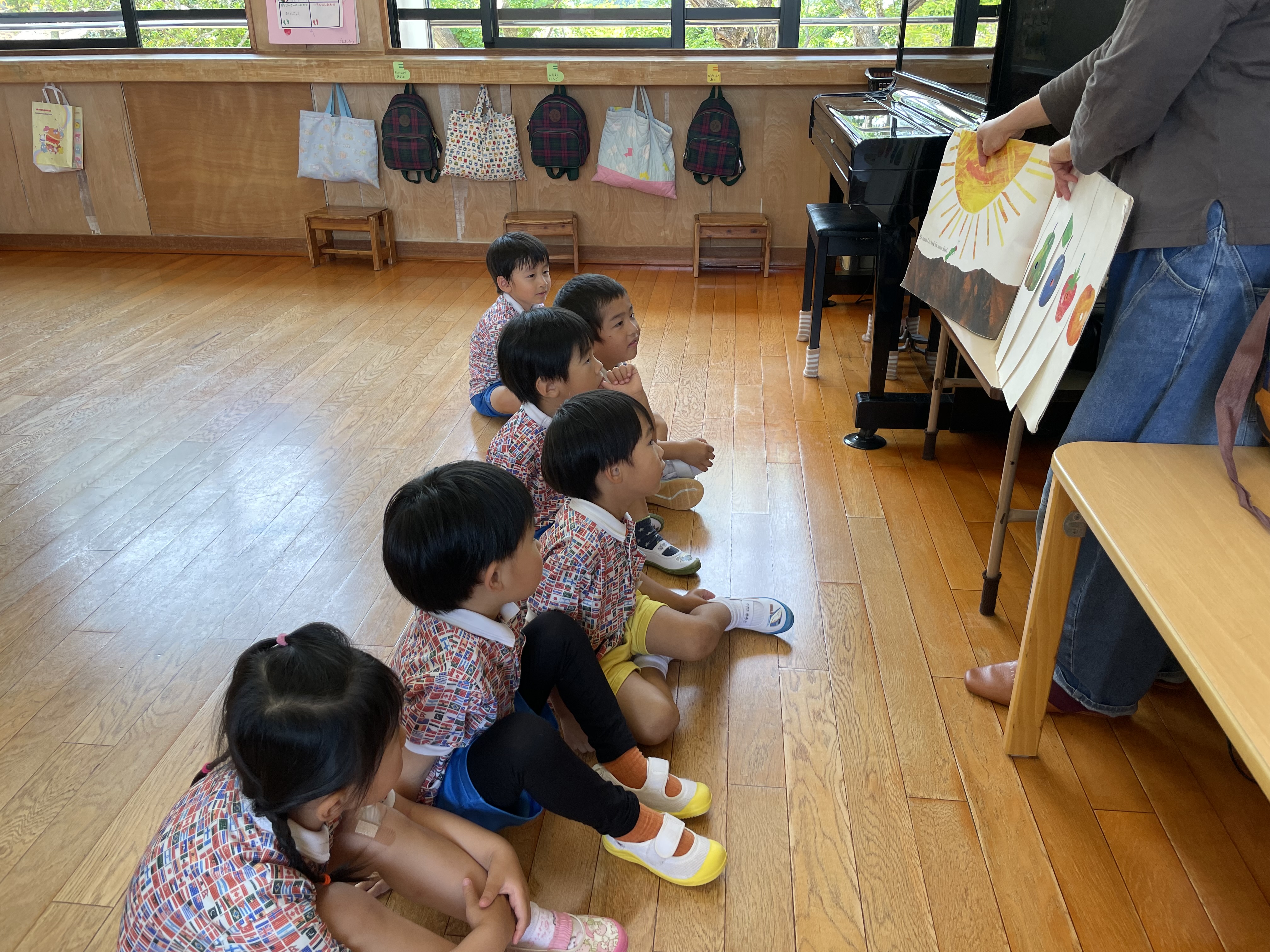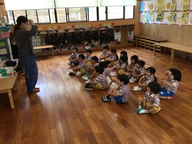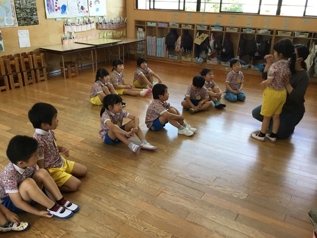今日はE・Eの日でした。あすか先生と元気な挨拶からのスタートでした。 「ハロ~?」「グッモ~二~ン?」と大きな声が聞こえてきました。 各ルーム、天気や色をあすか先生と一緒に発表し、年中年長さんは一人で発表するお子様もいました。 色カードを見て、ルームの中の同じ色を探すゲームをしたり、動物かるたもしたりしました。 絵本タイムではお子様方のリクエストに応えてくれたあすか先生! お気に入りは「はらぺこあおむし」でした! あっという間の時間でしたね。来月もお楽しみに~(^^)/ See you again~