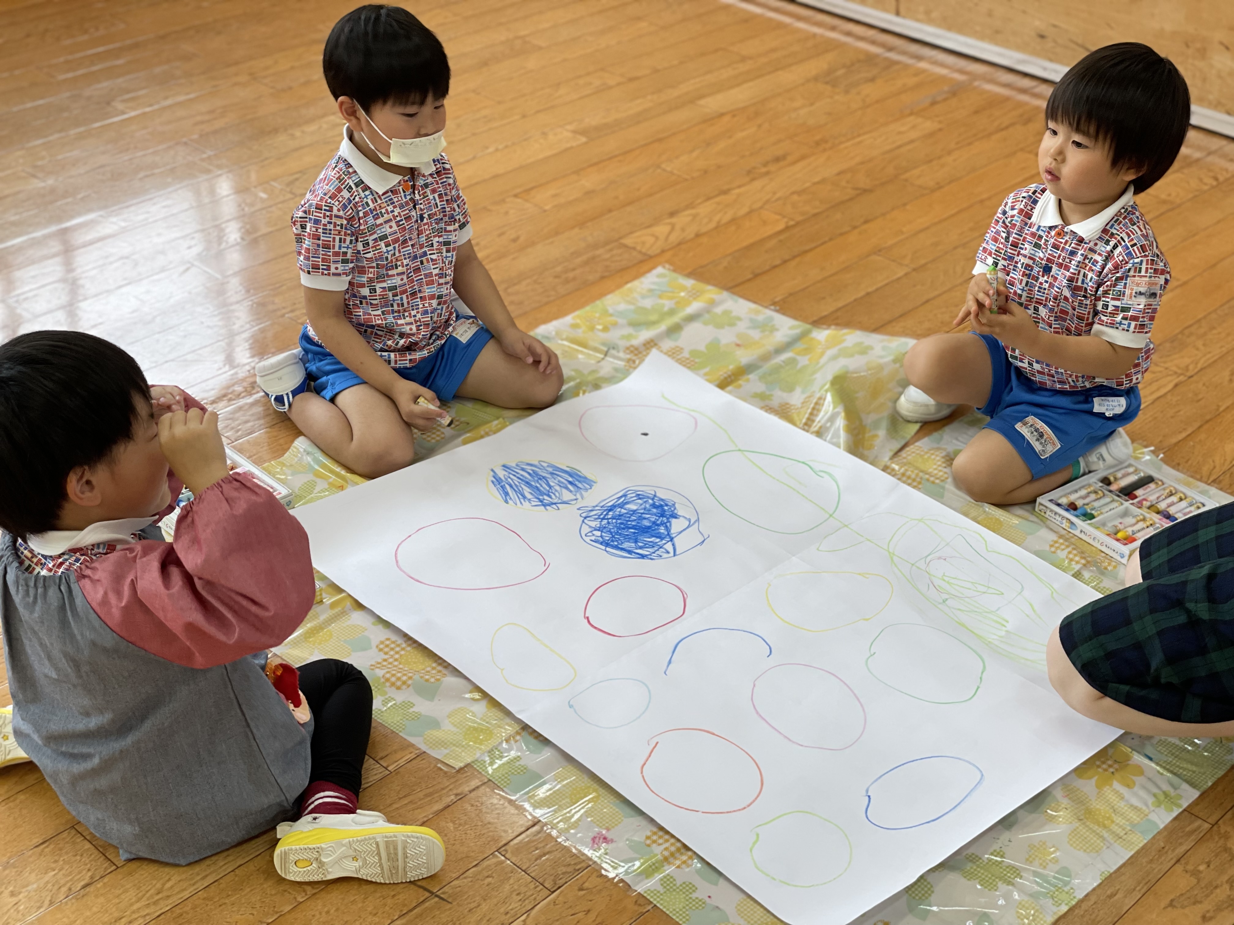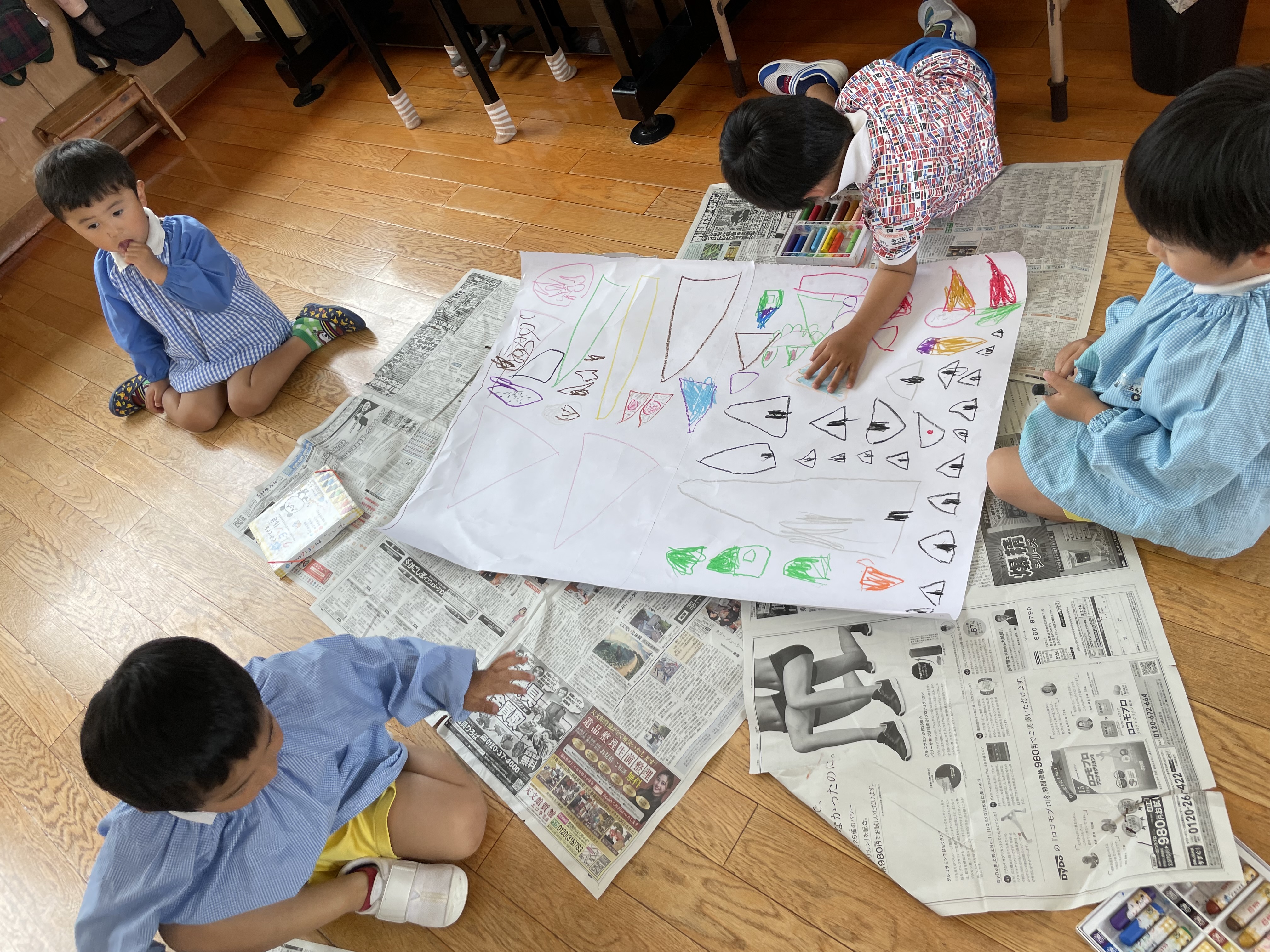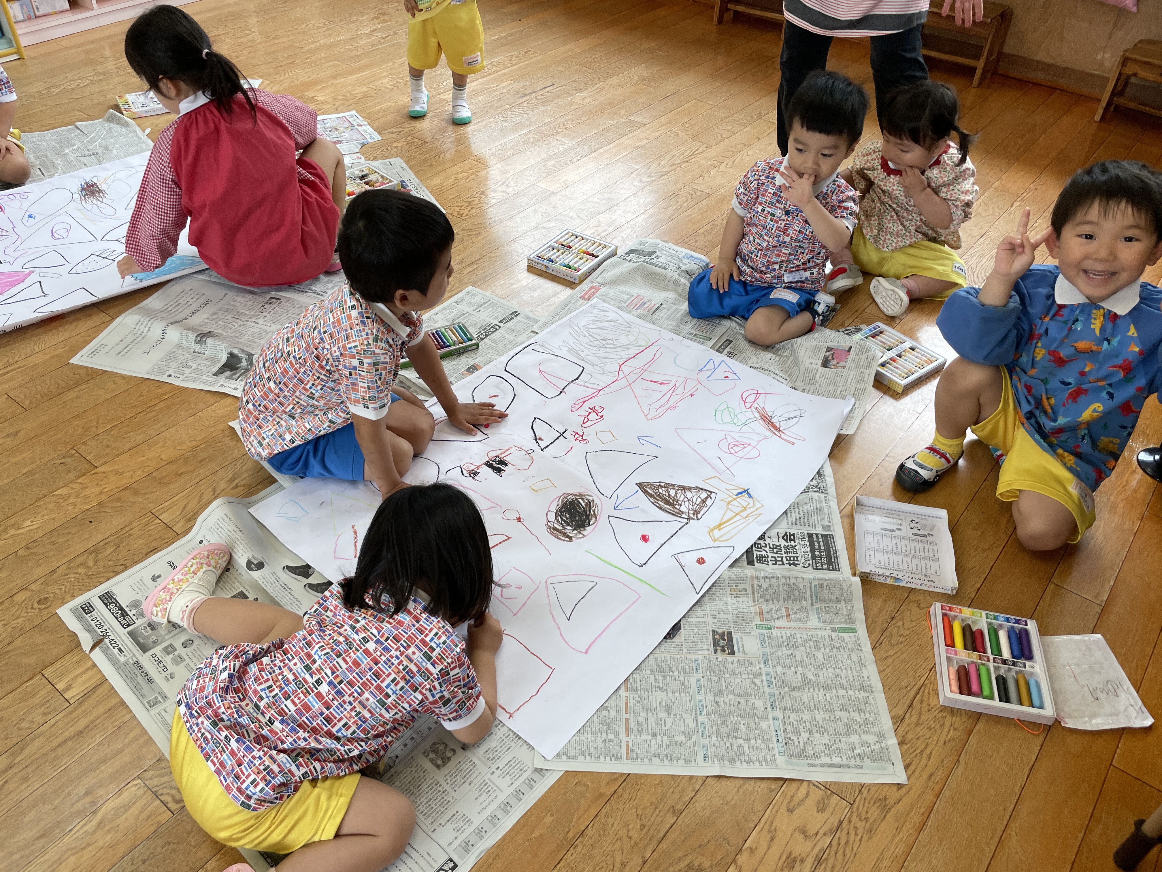 年長さんが先に形を描き、そこからいろ~んな物を想像してお絵かきしていました。