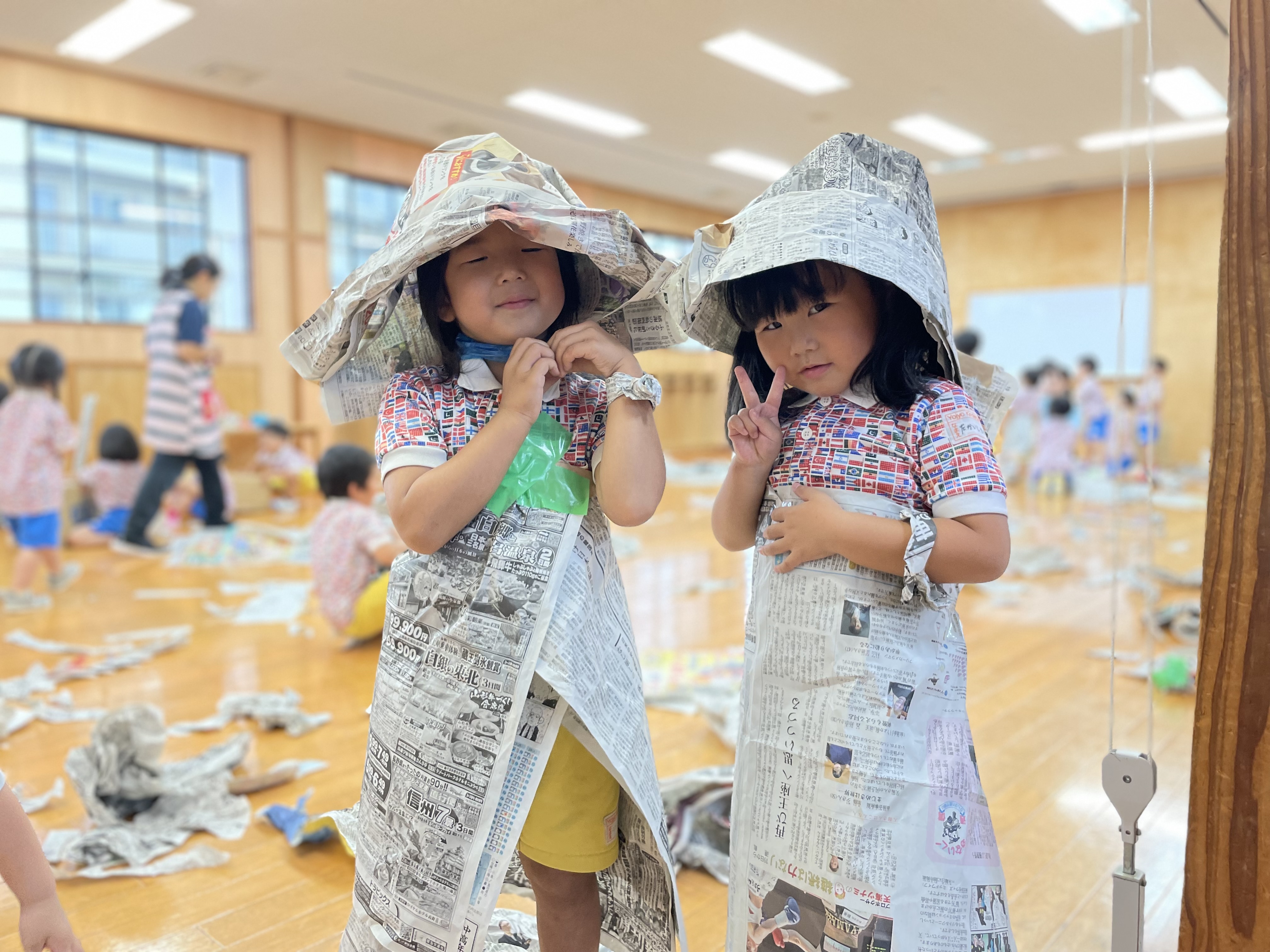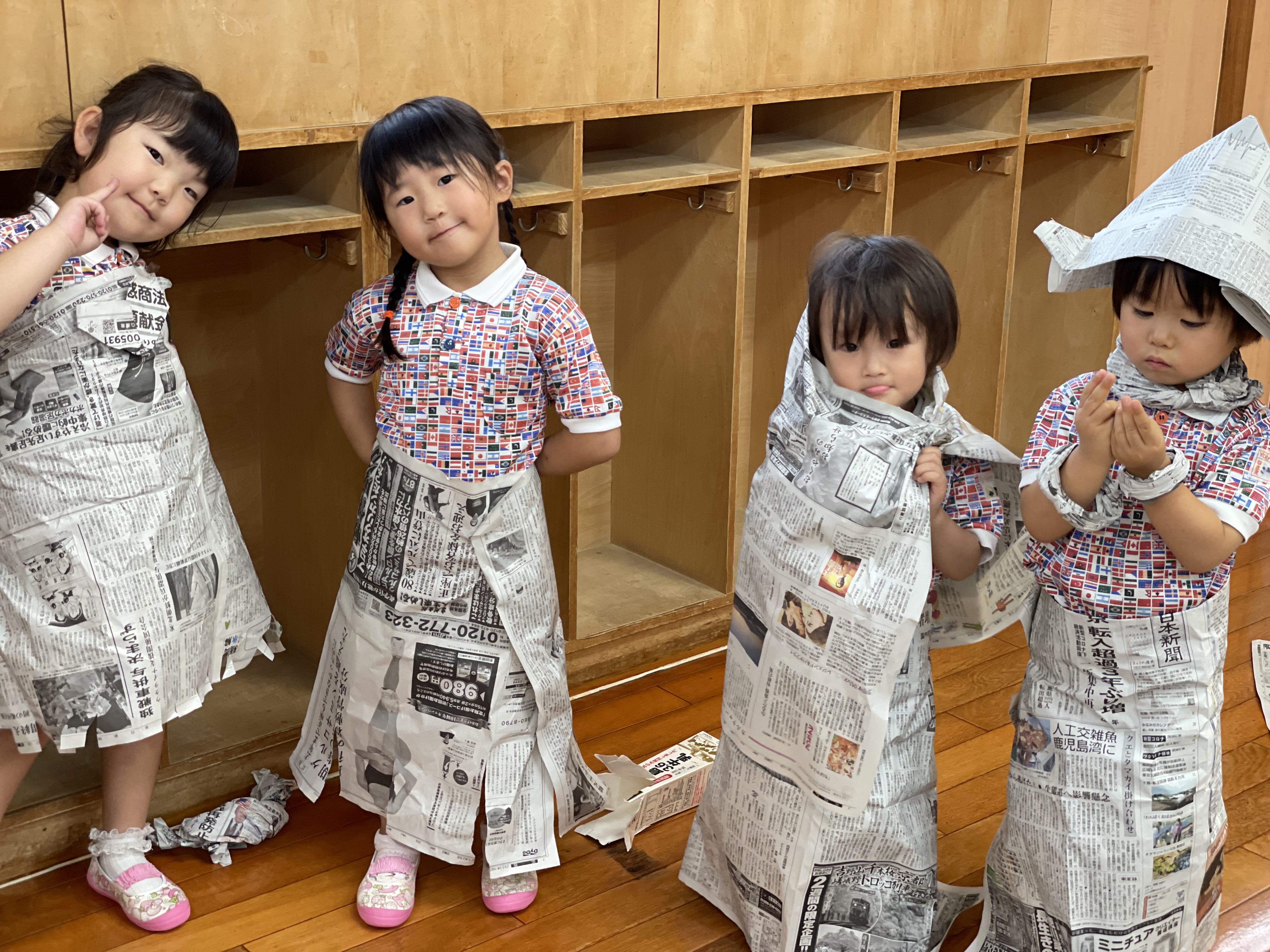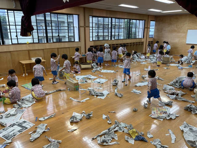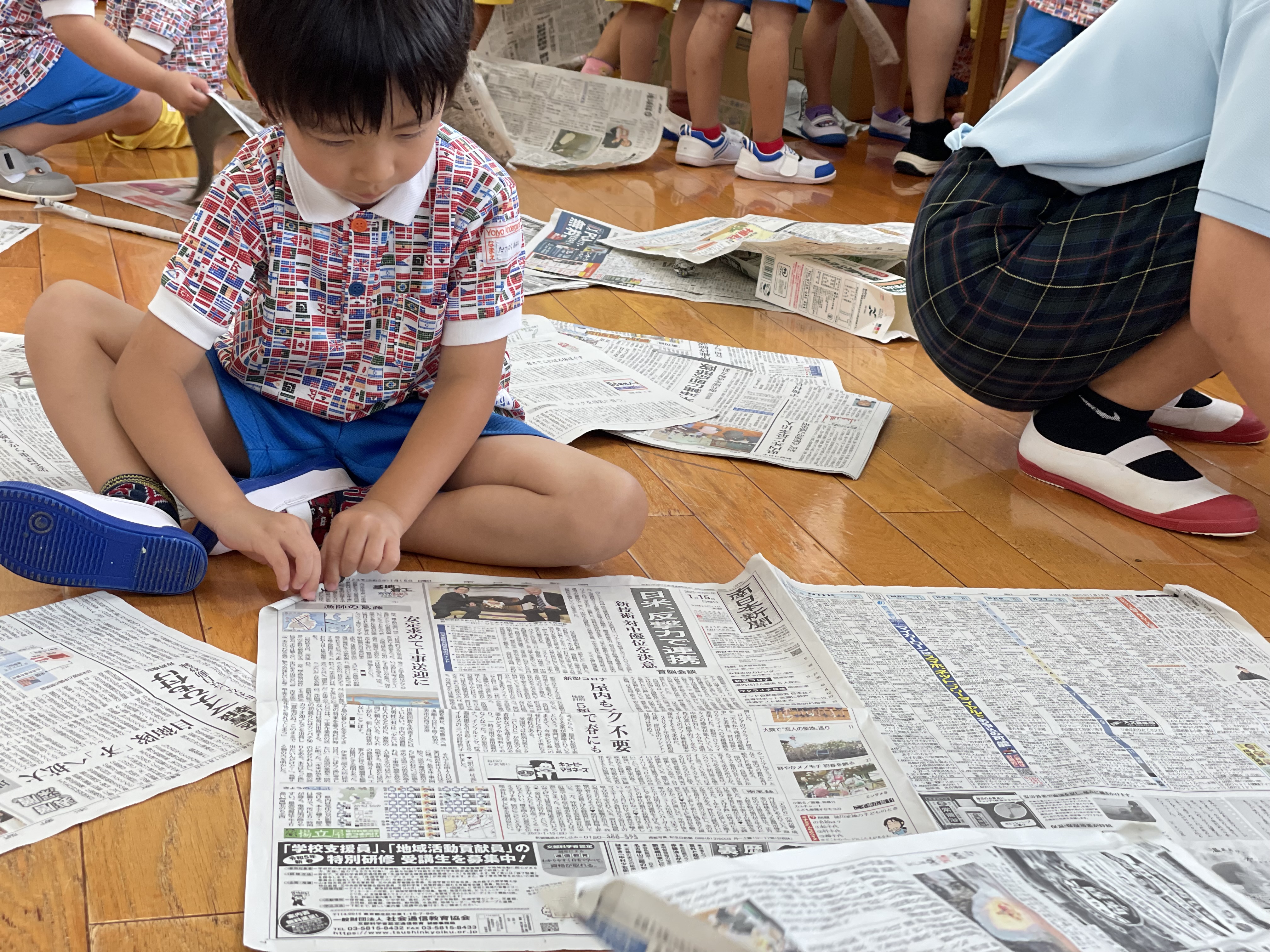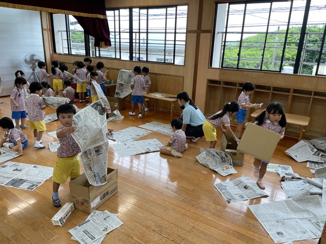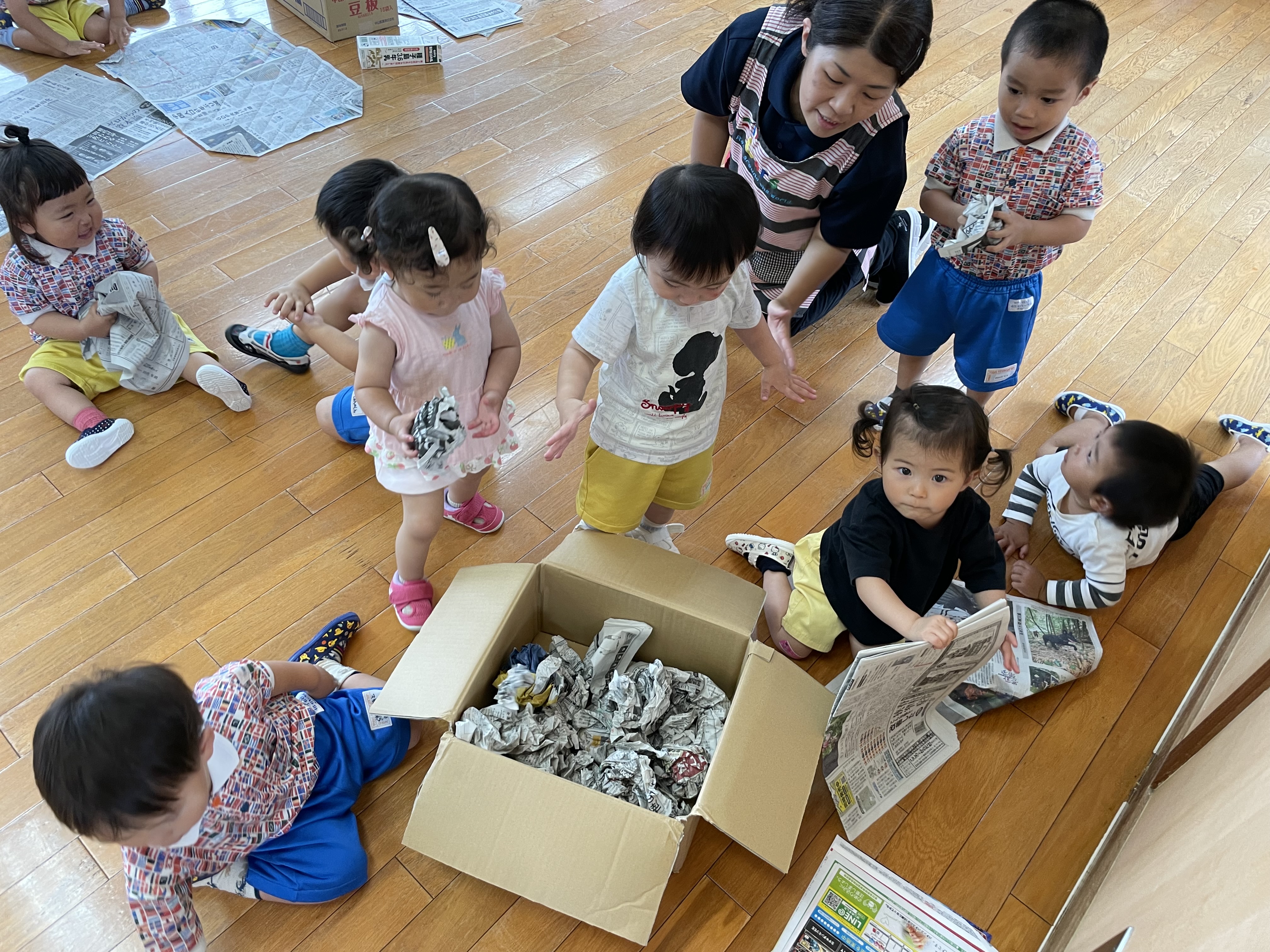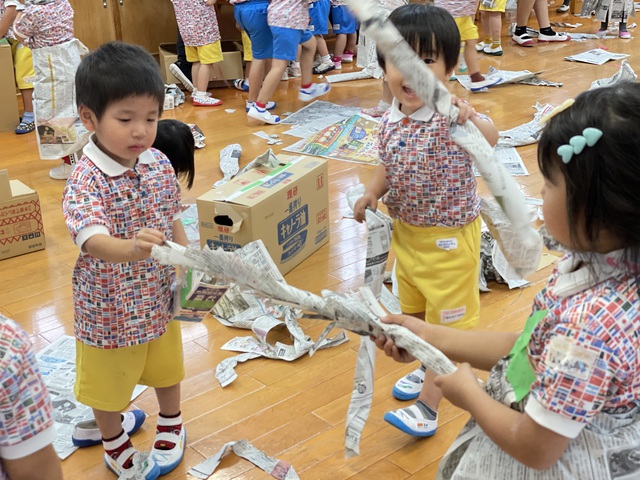 新聞紙を破る、引っ張る、ちぎる、丸める、段ボールや牛乳パックも使って色々なものを作り出す!