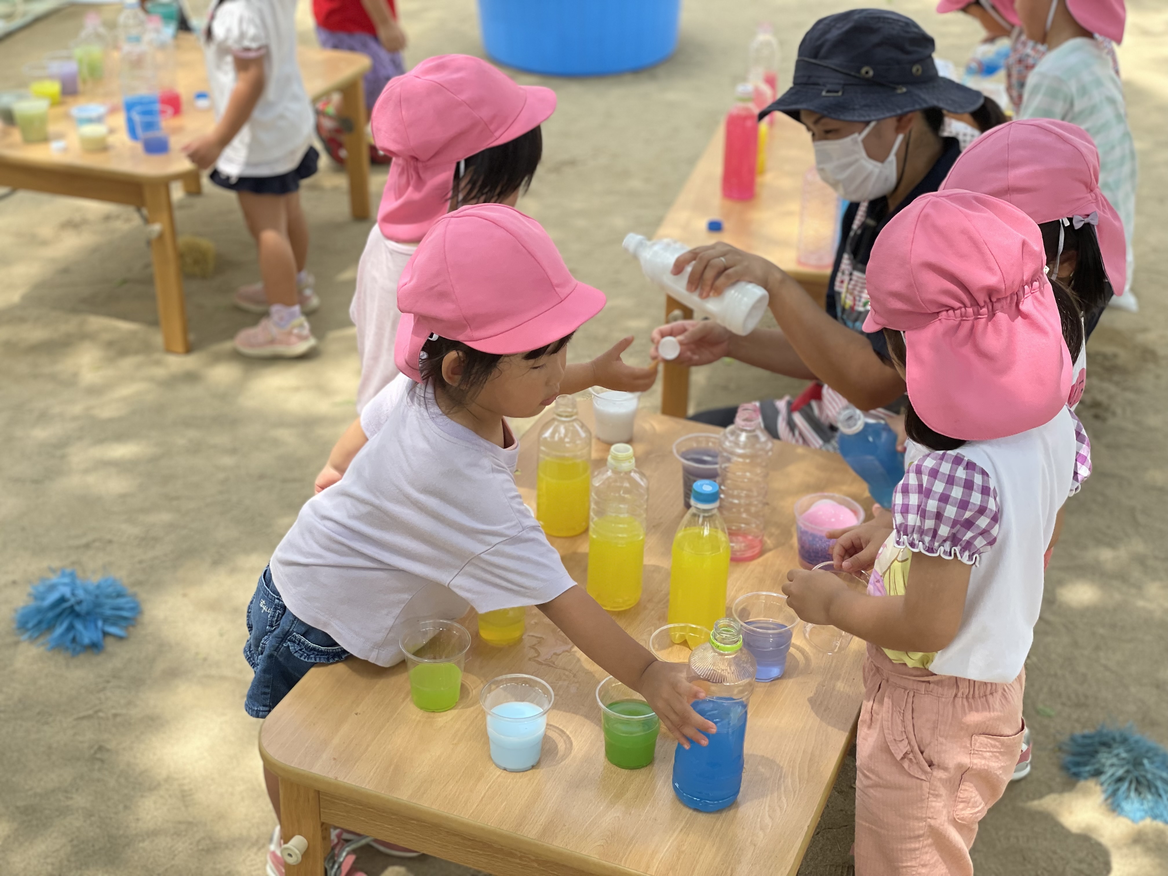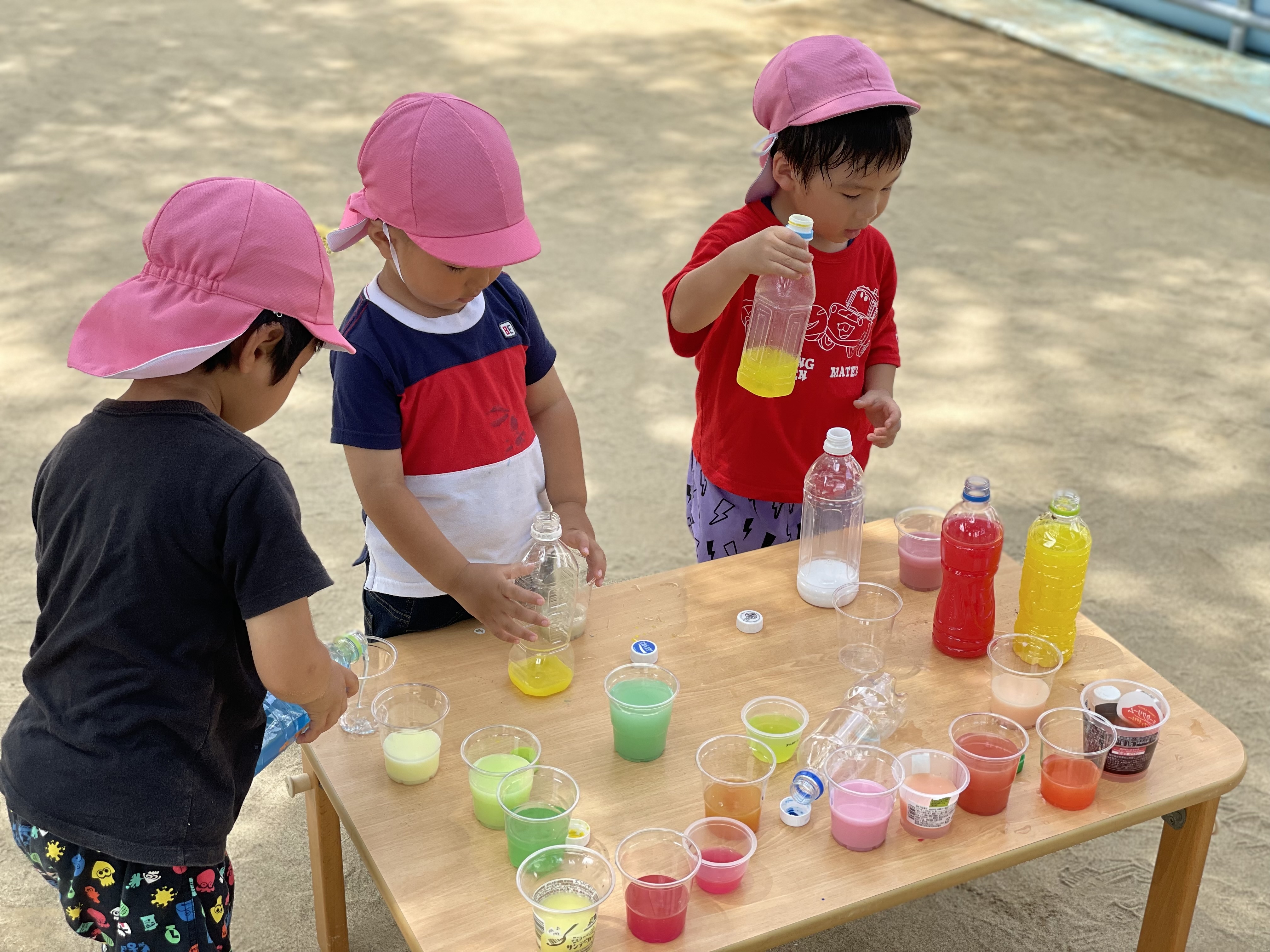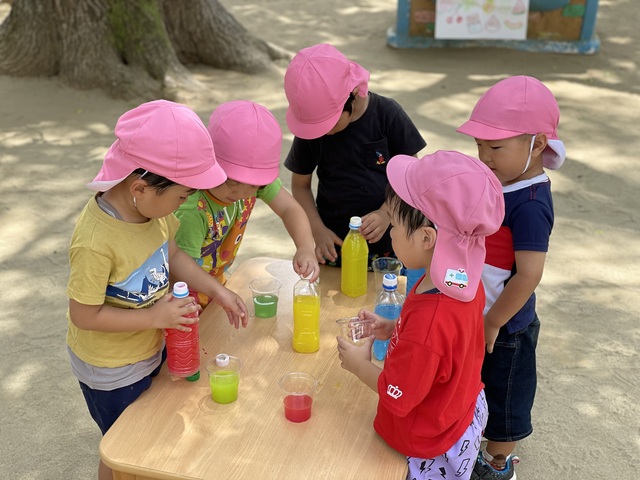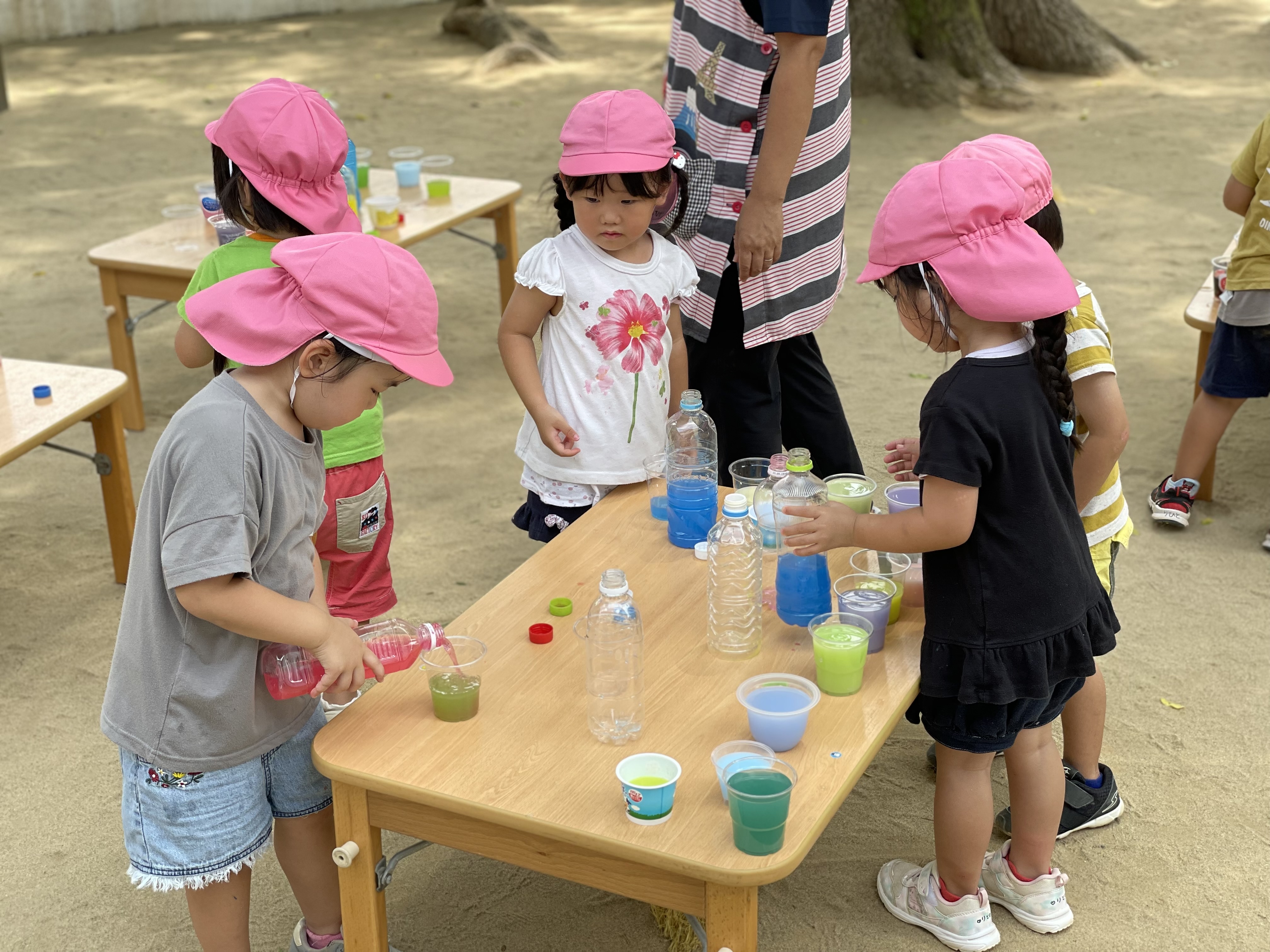 午後は色水遊び。沢山の色水を作ってコップに入れてかんぱ~い!