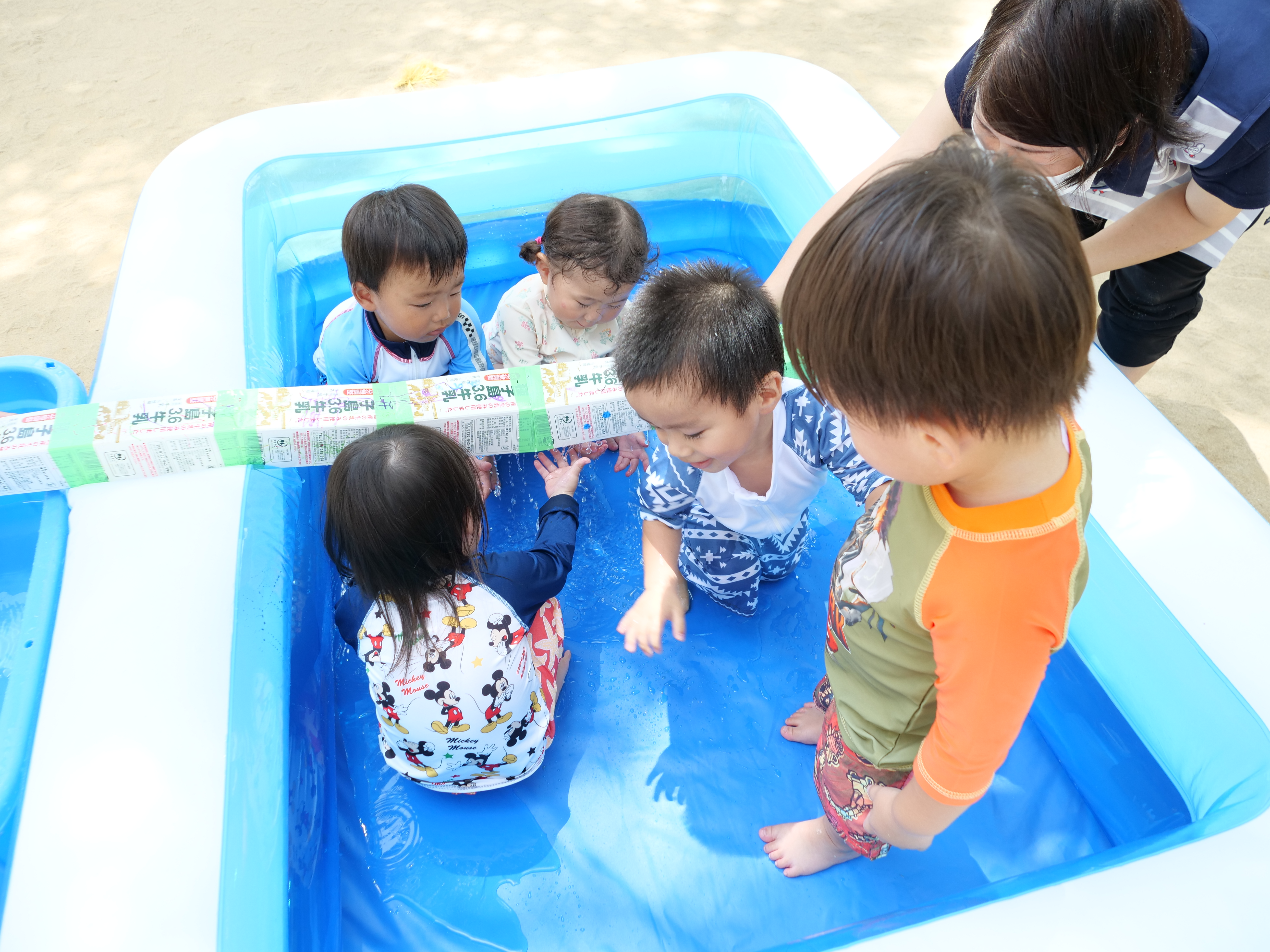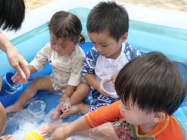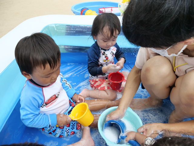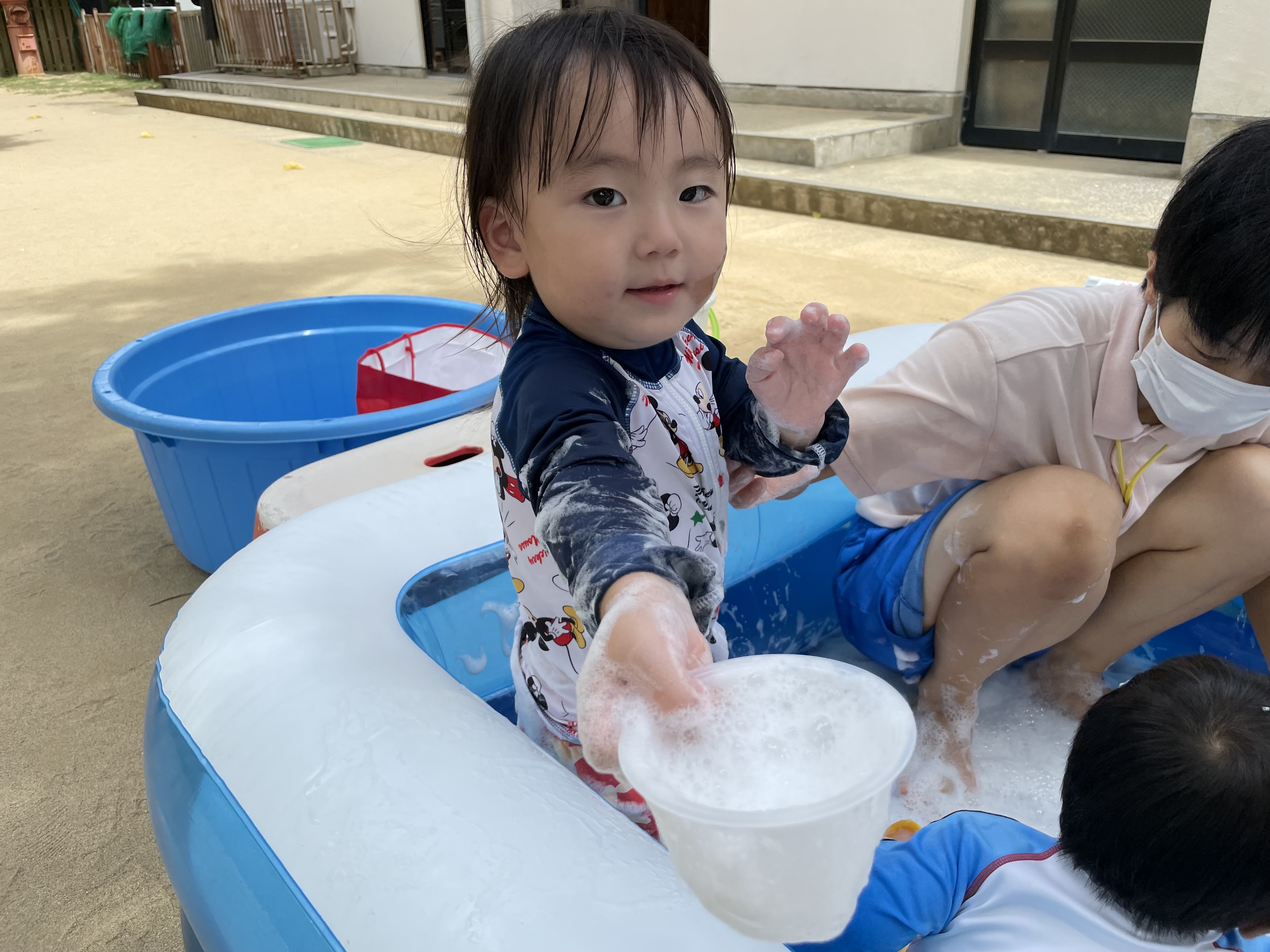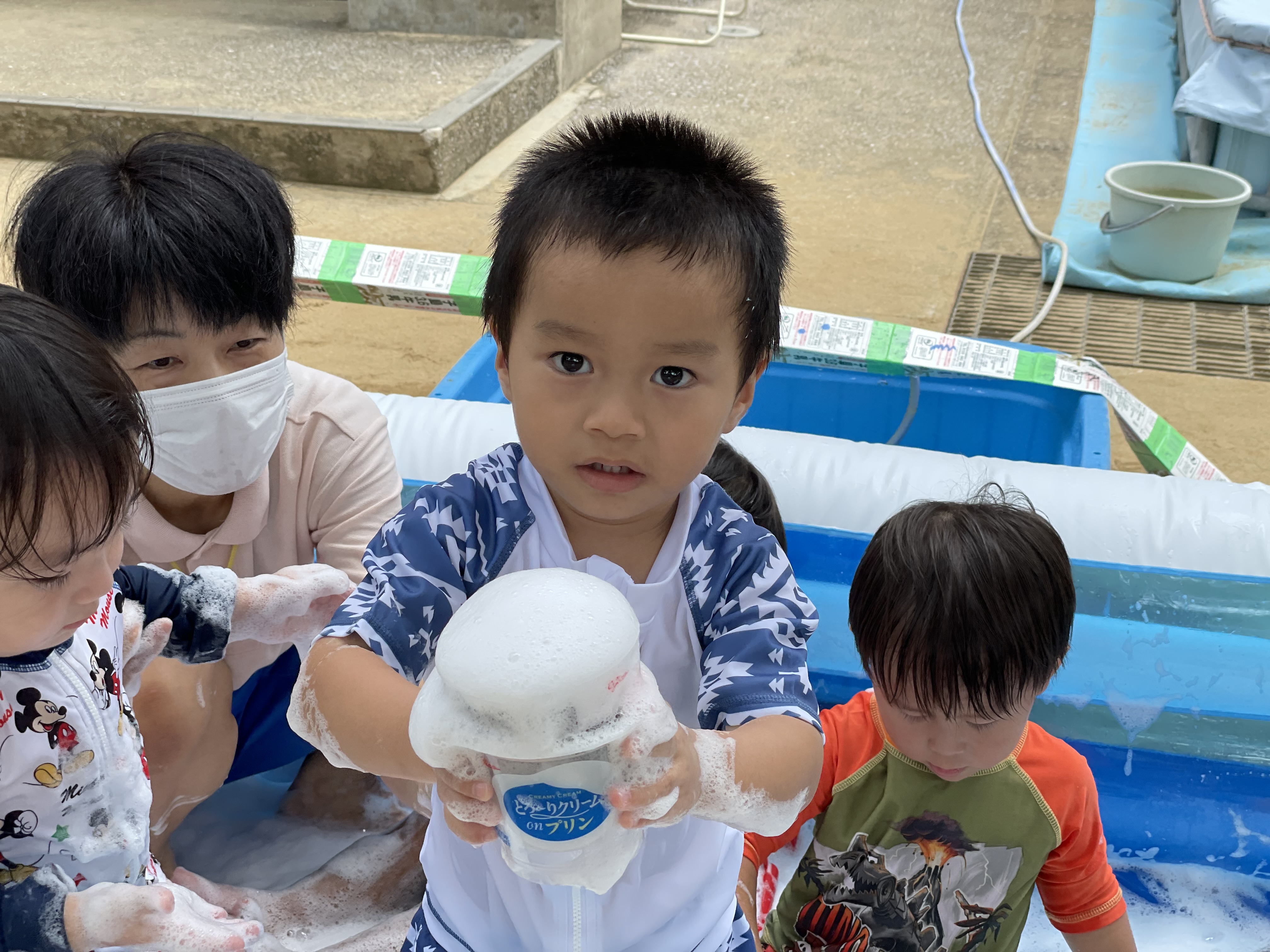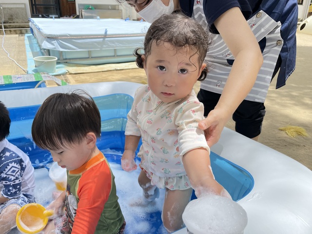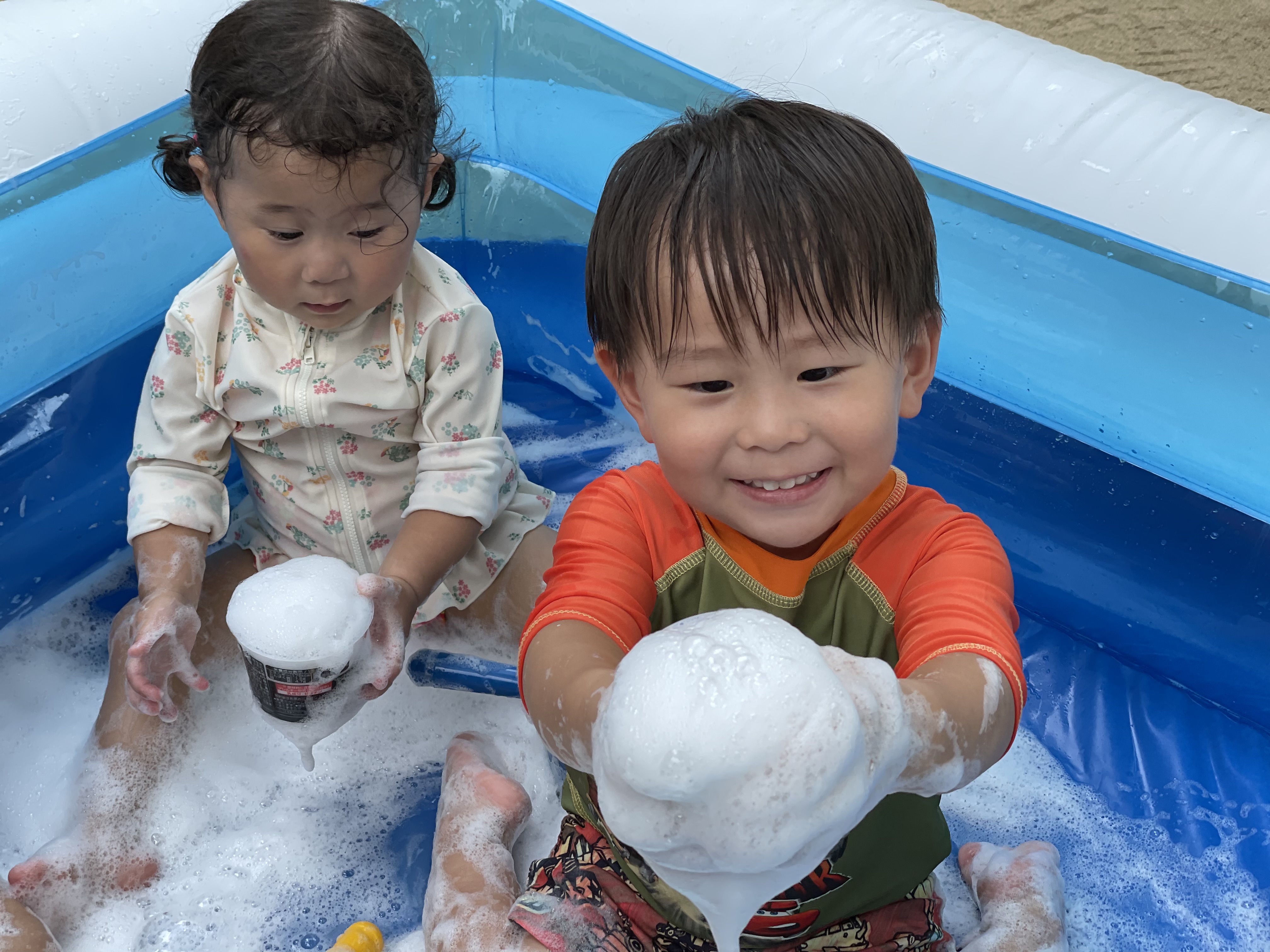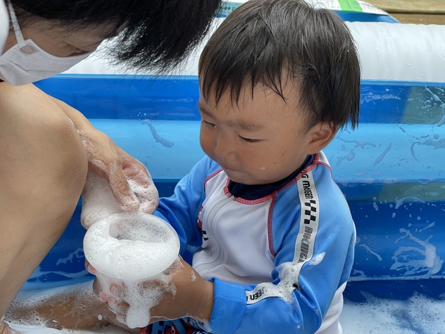 そして、そのあとは大好きなあわあわ~!!プールの中で泡あそび!