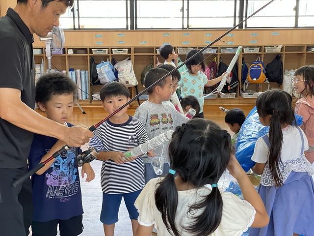 幼稚園では魚つり大会。賢治先生が本物の釣り竿を持ってきてみんなで釣ってみました。