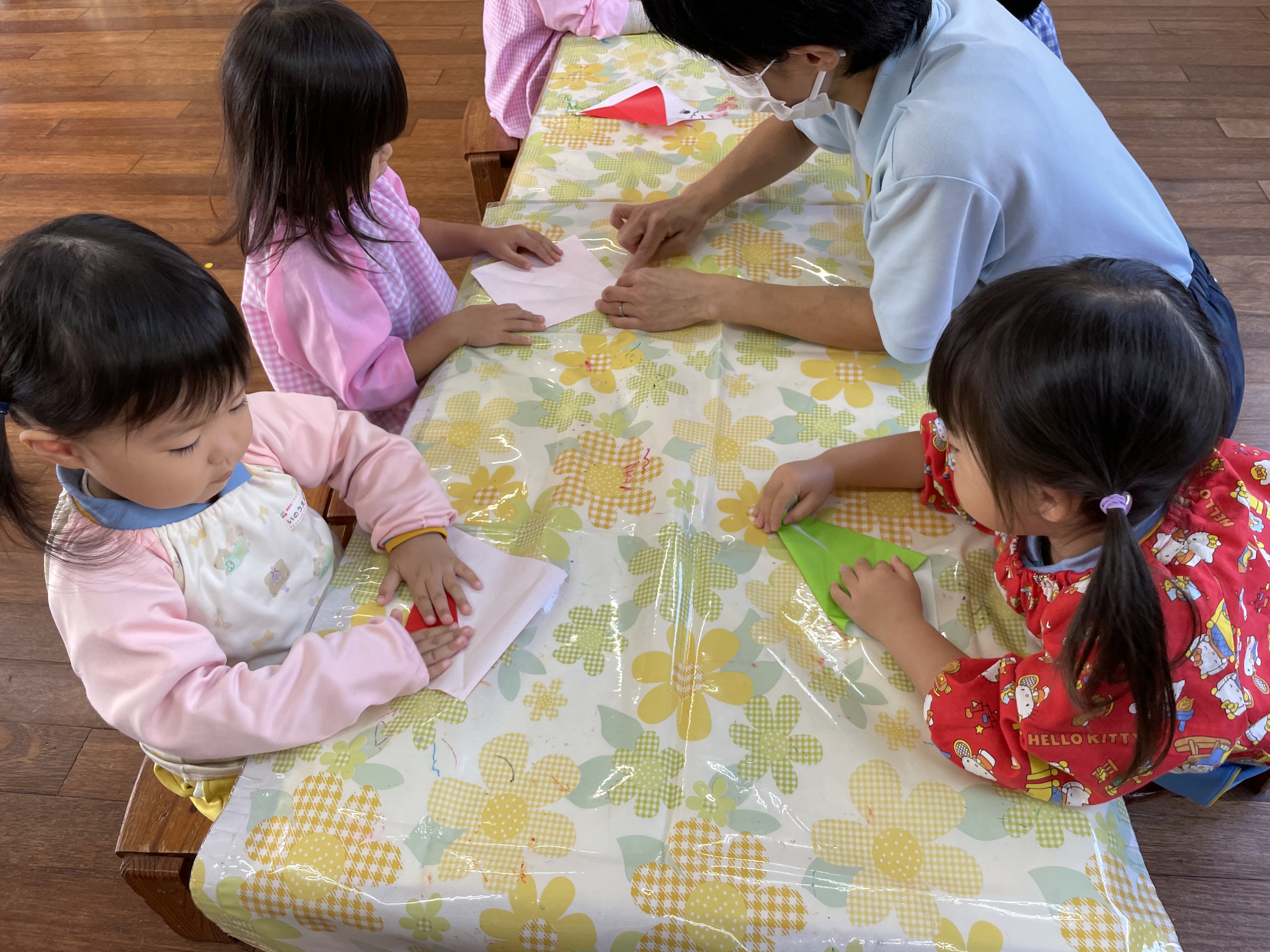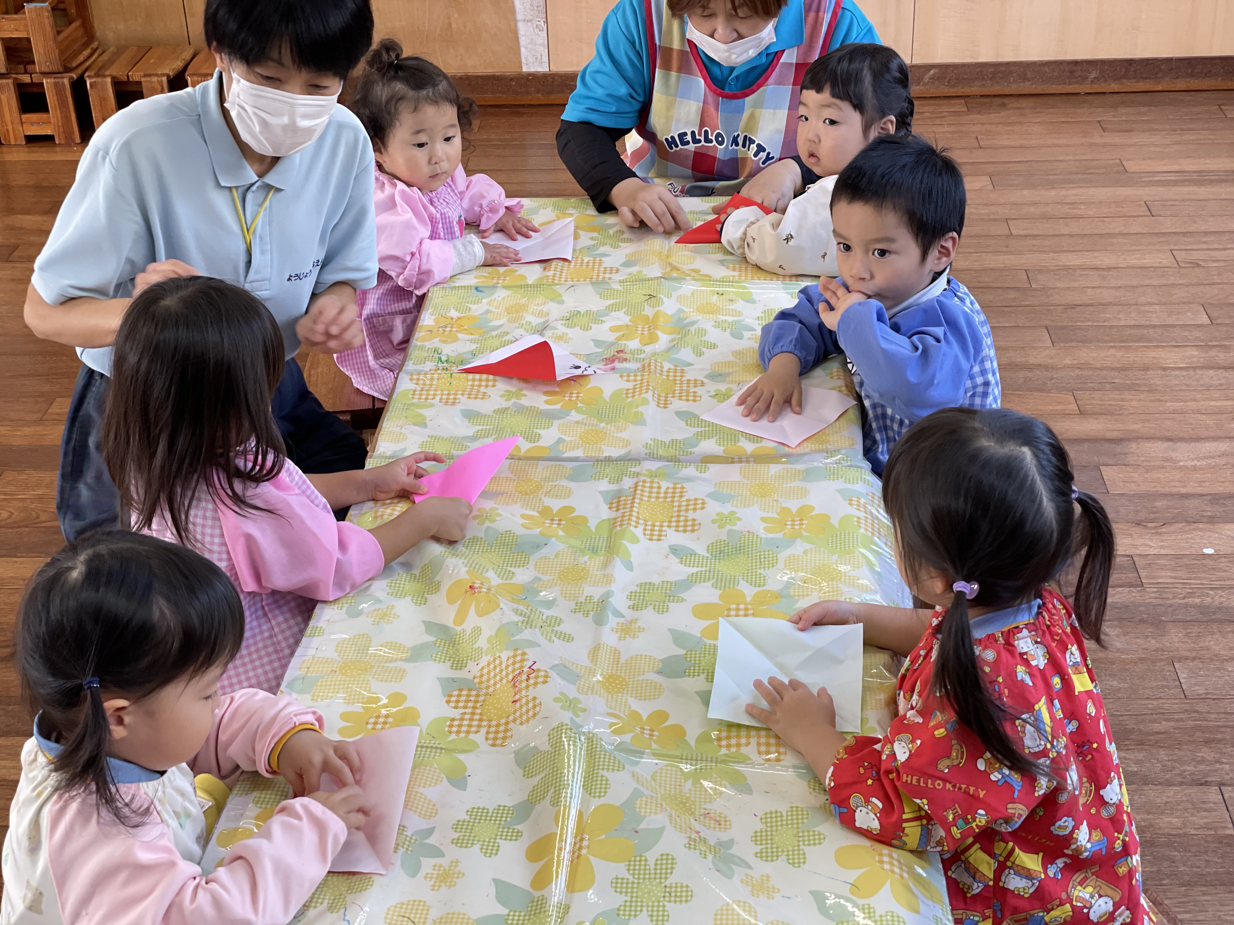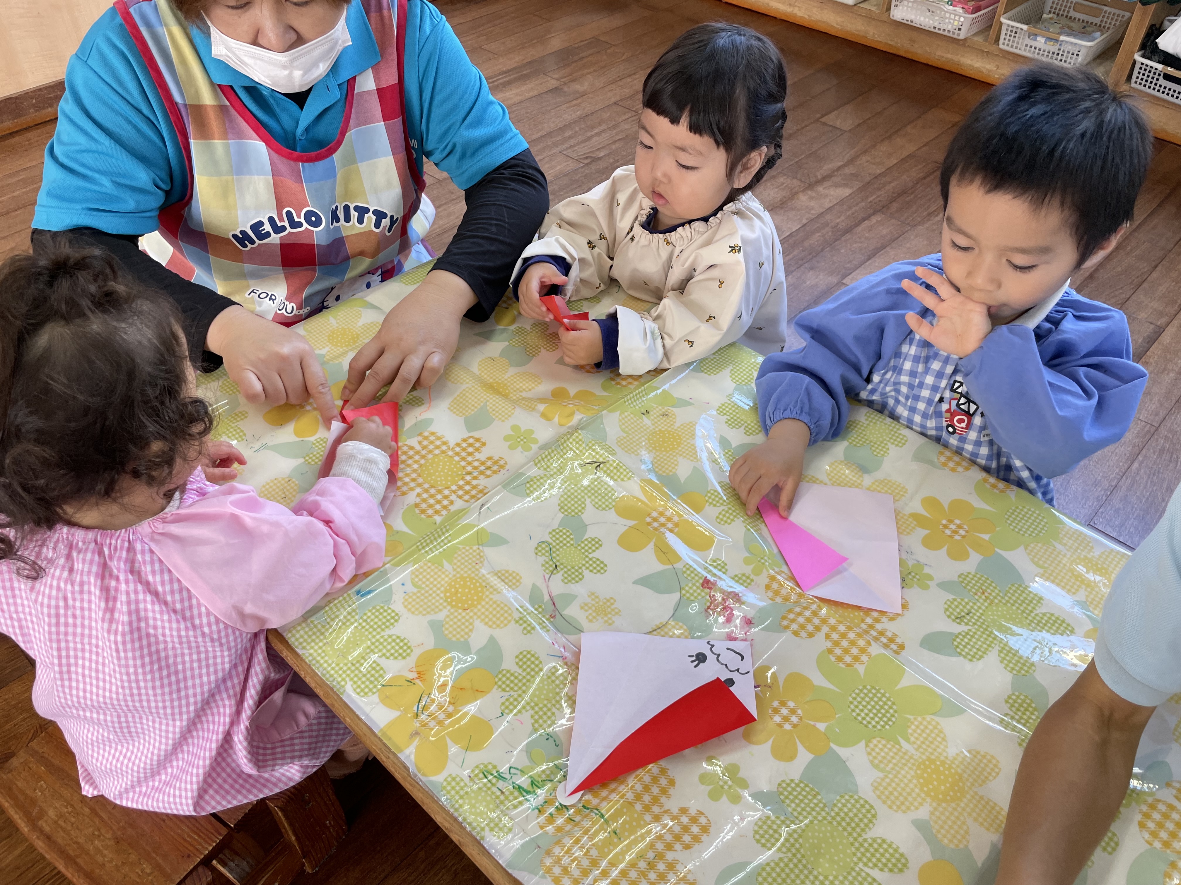 バンビさん・・・折り紙でサンタさんを作りました。サンタさんの色は自分で決めました。