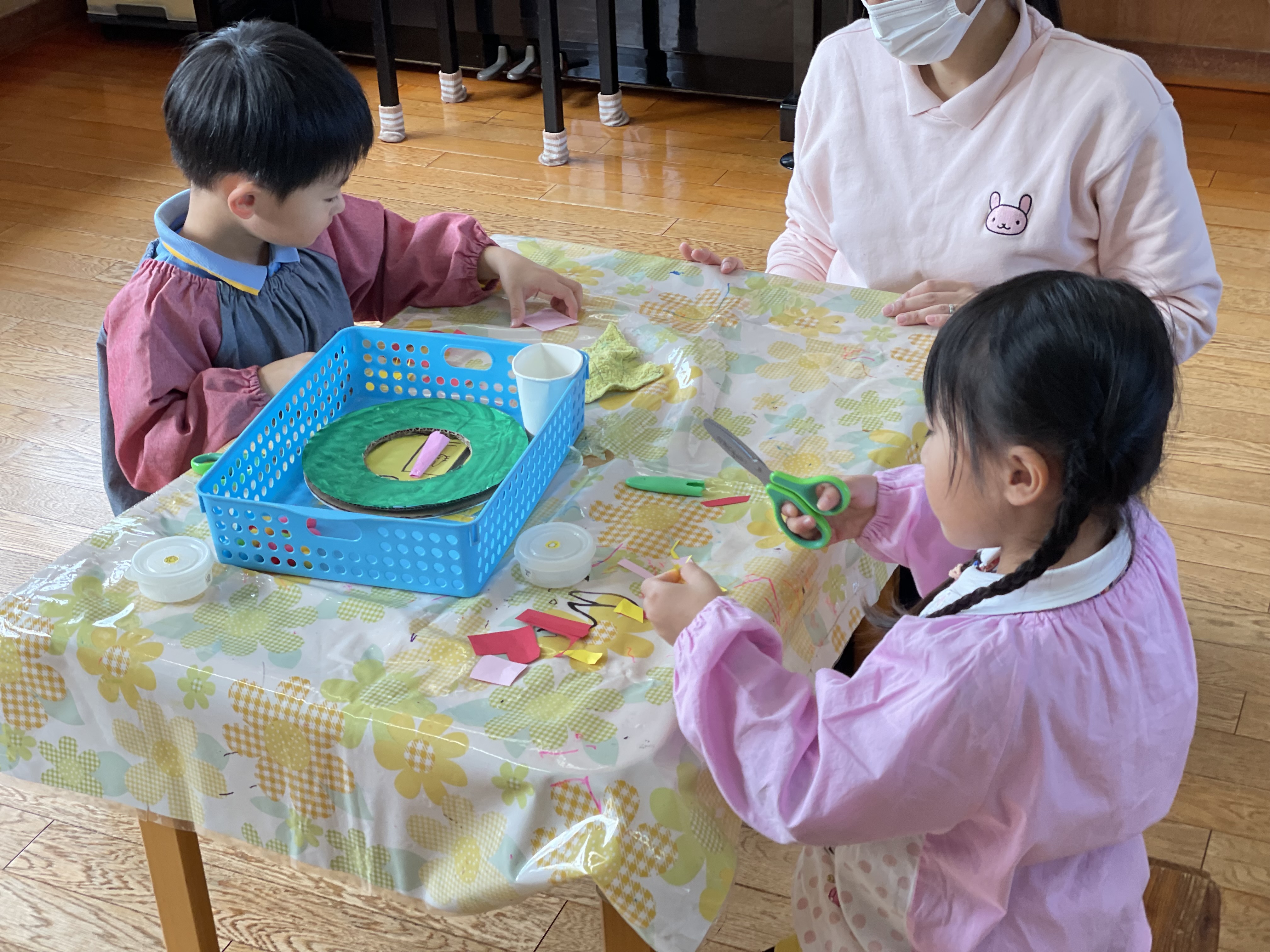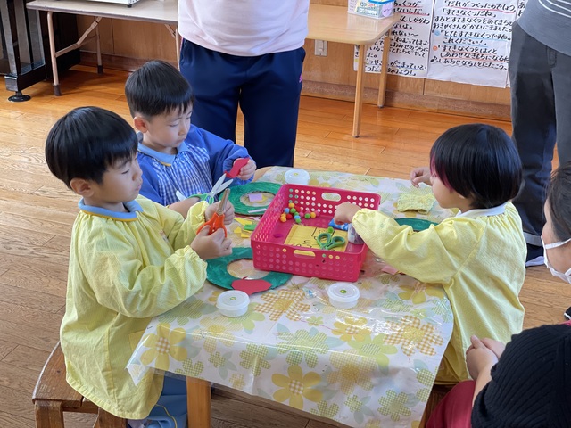 アラジンさん・・・クリスマス製作 リース作りをしました。飾りも上手に切って貼り合わせて