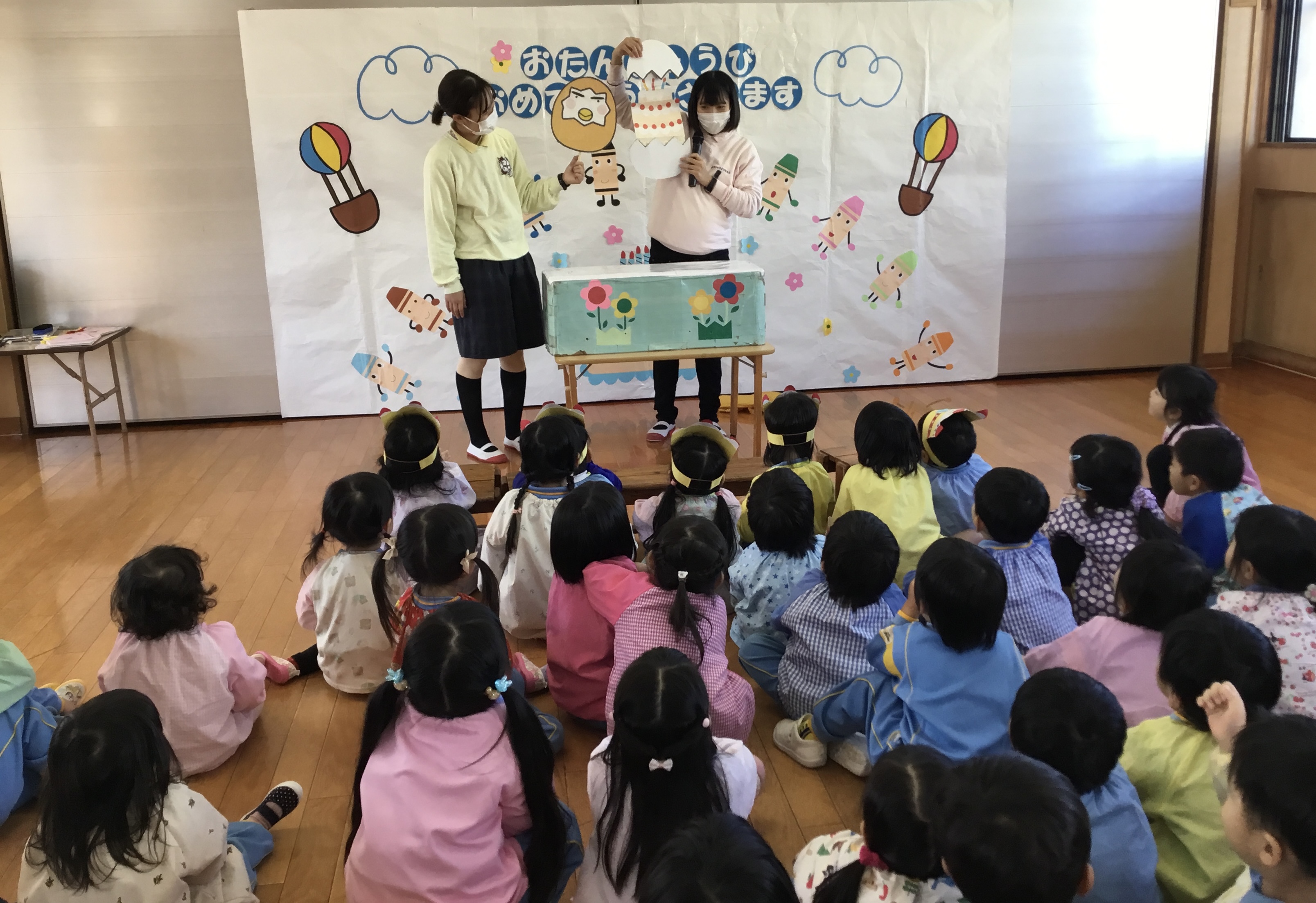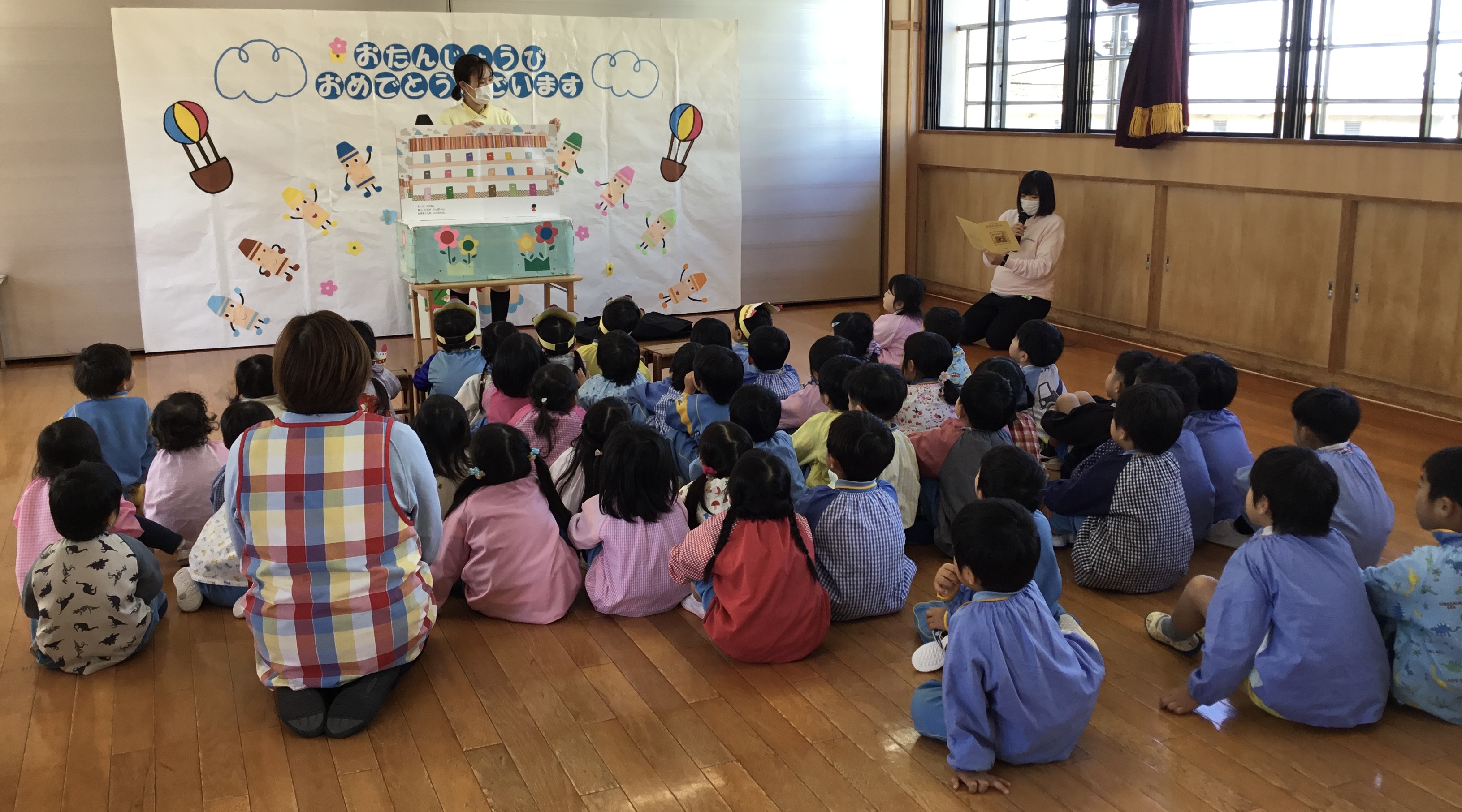 職員からのプレゼントは、大型絵本「とんとんとん」「たまごにいちゃん」でした。