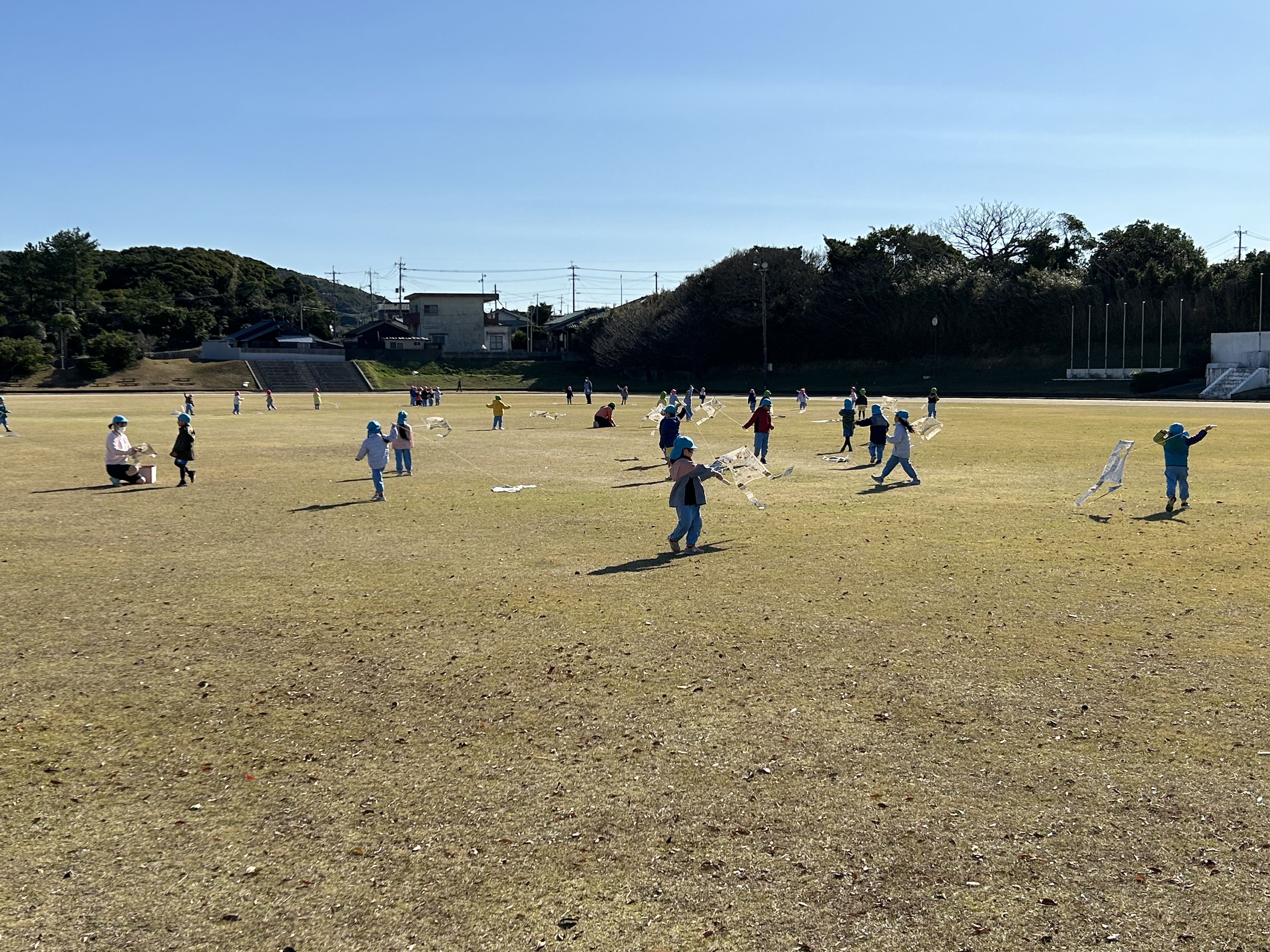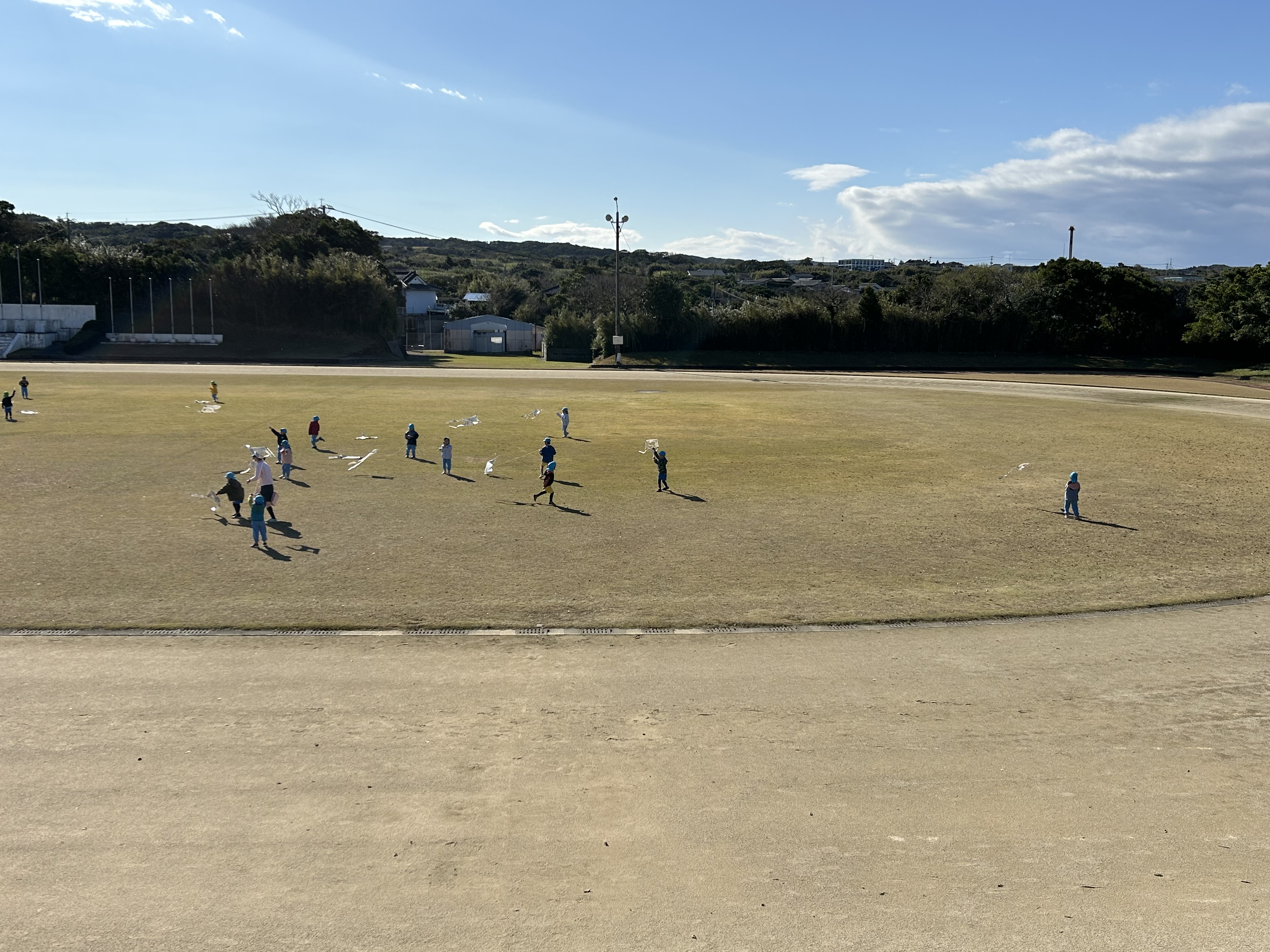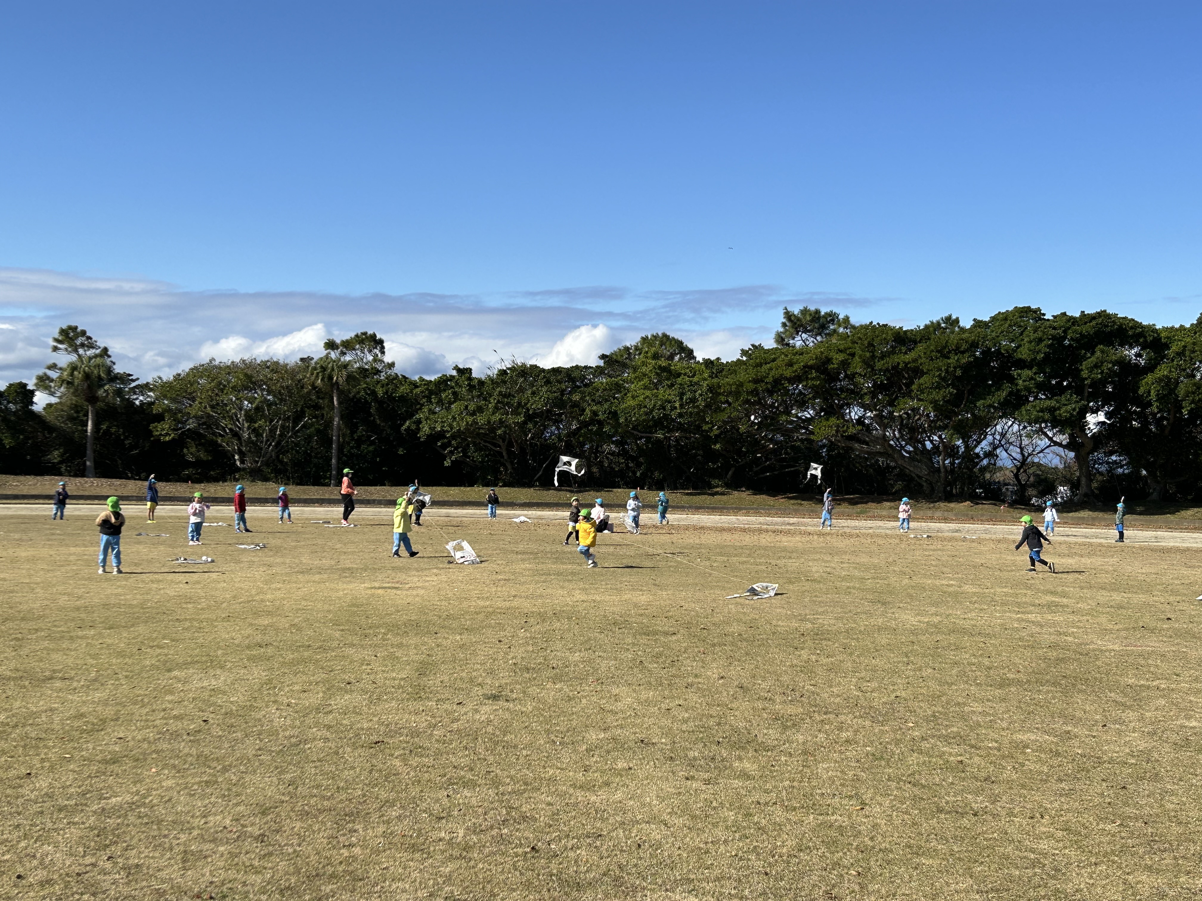 自分たちで作った凧を走ったり風をよんだり?!しながら楽しんでいました。