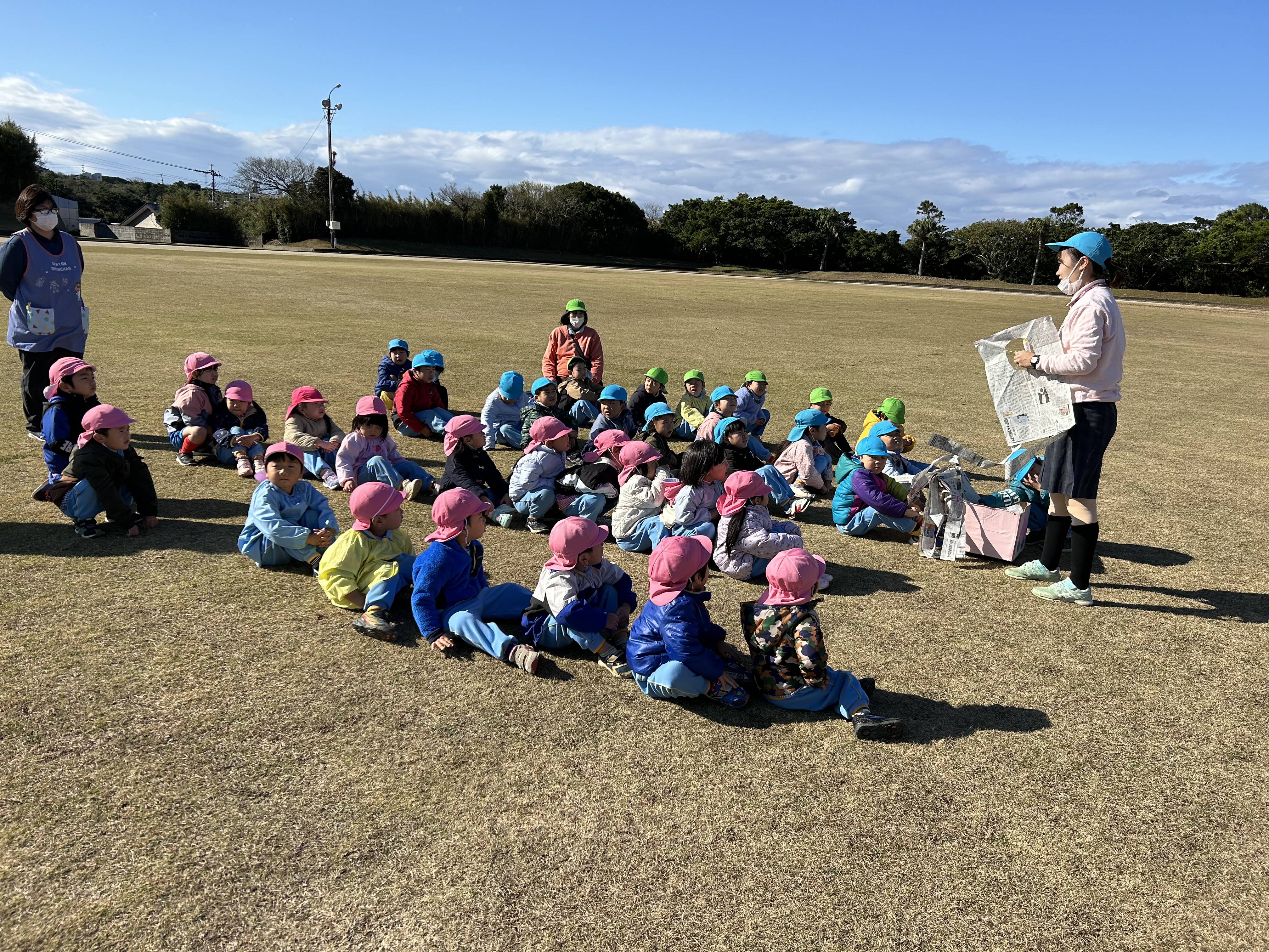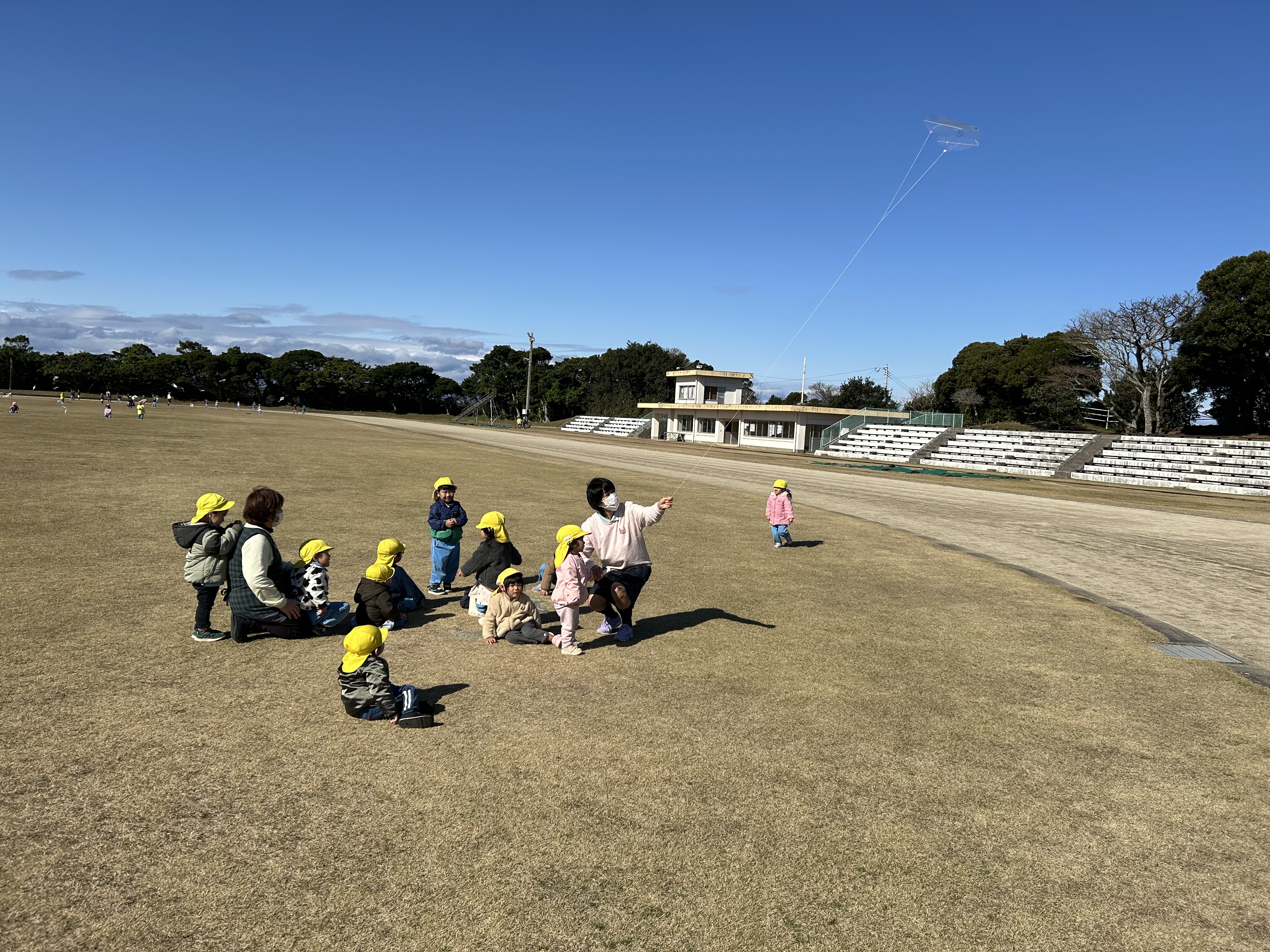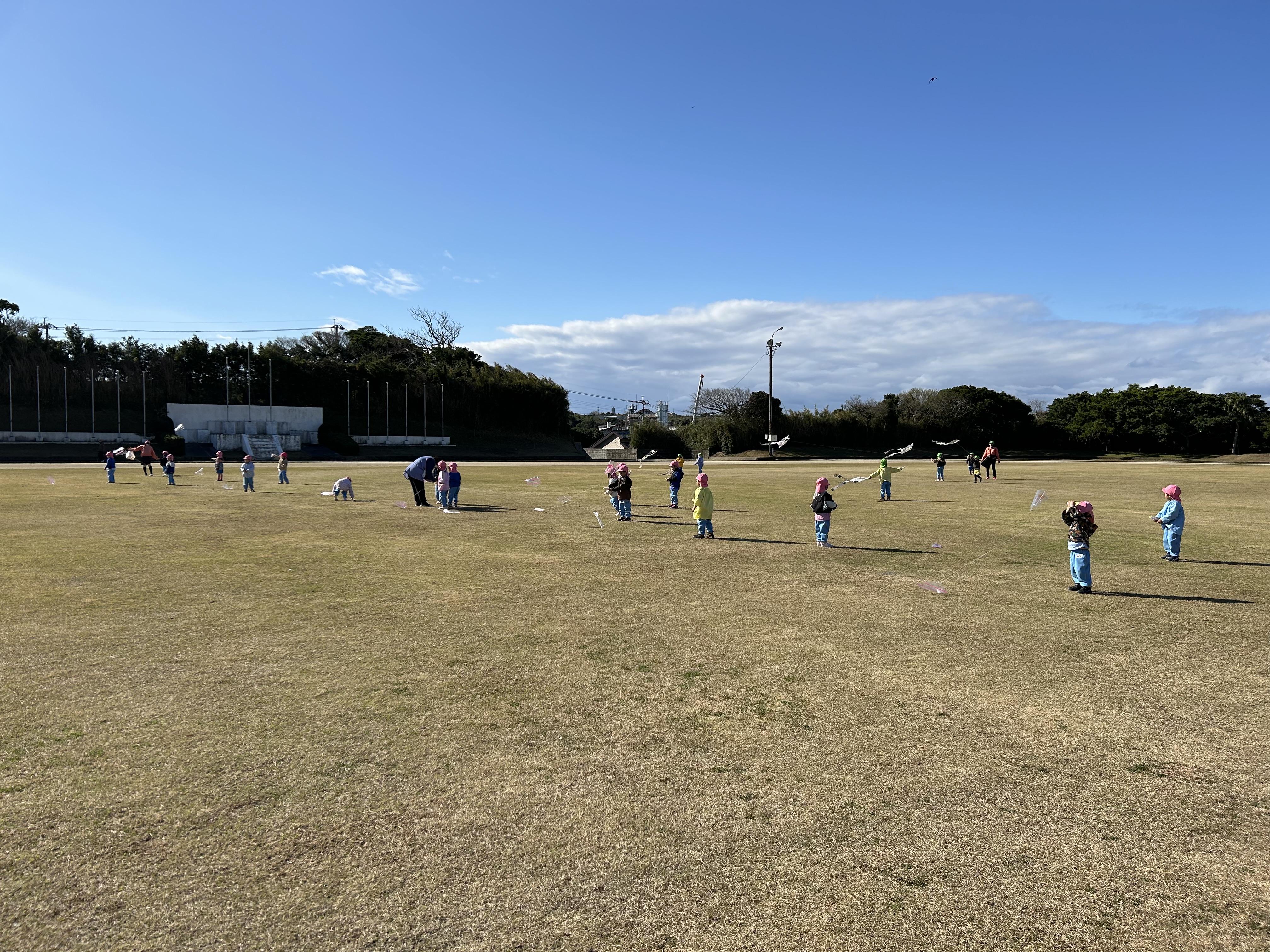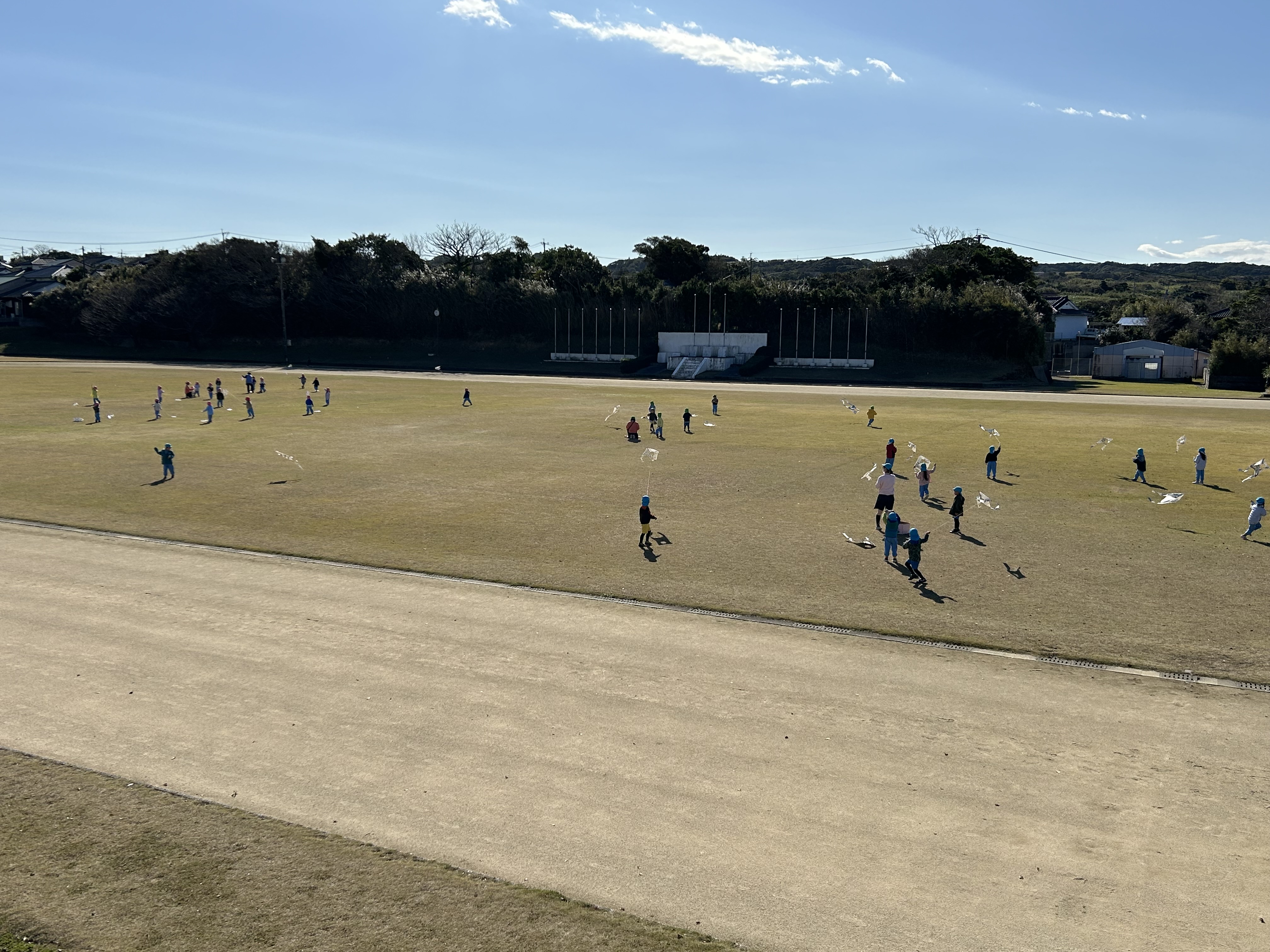 自分たちで作った凧を走ったり風をよんだり?!しながら楽しんでいました。