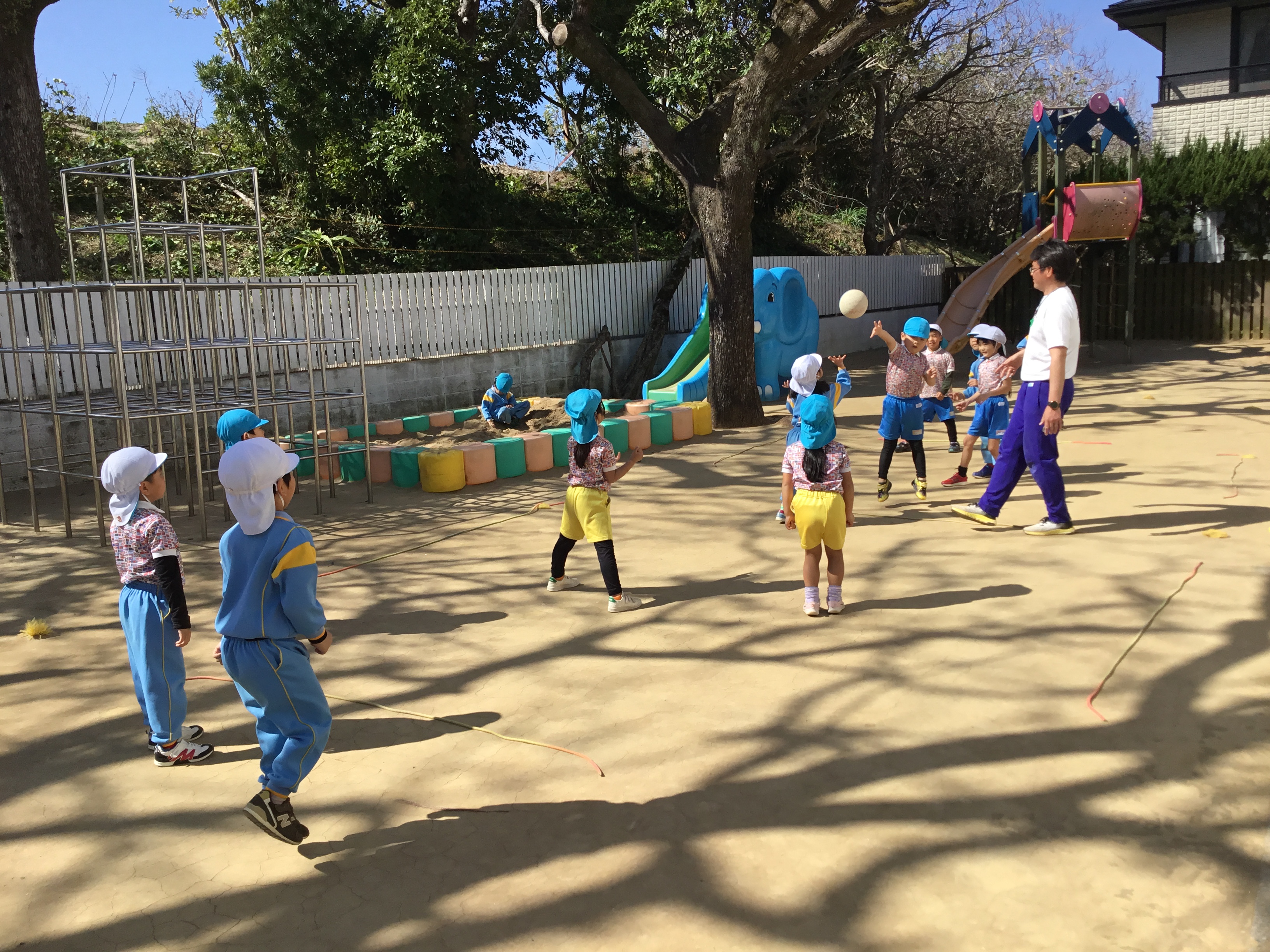 鉄棒では逆上がり。ボールでは投げ方を教わり、中当てゲームを楽しみました。