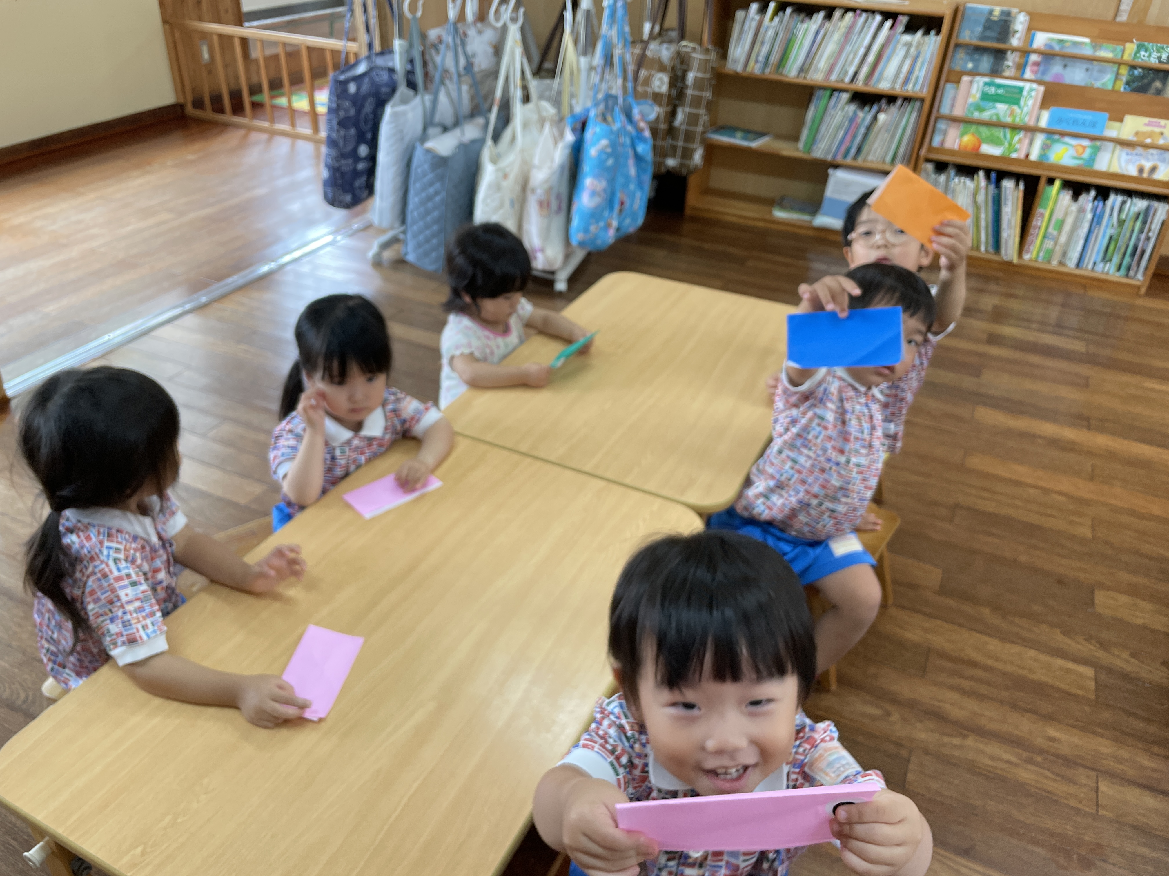自分の好きな折り紙を選んで「はんぶんこ~」「こんにちは~」と言いながら、