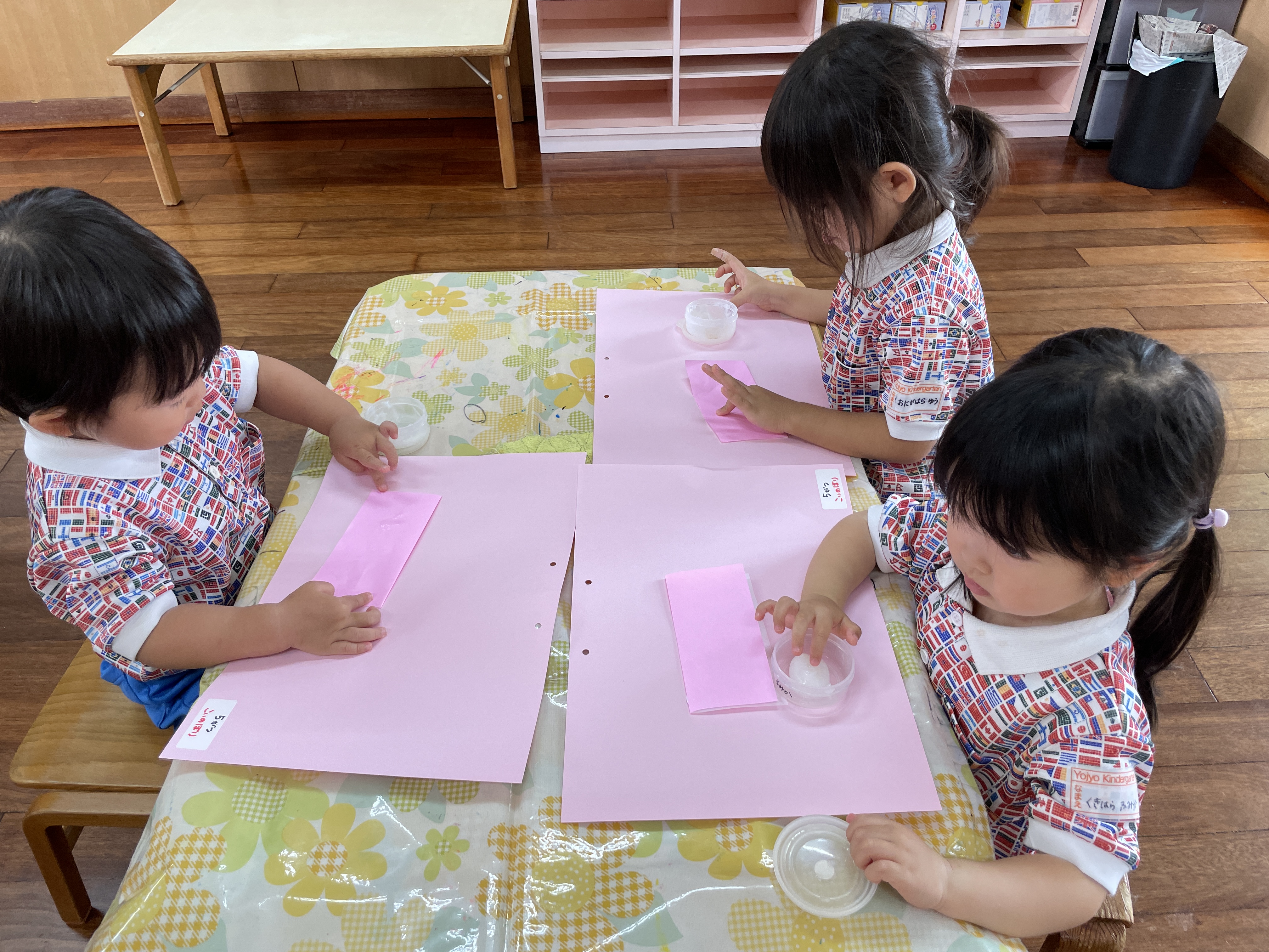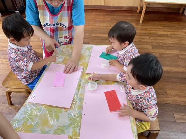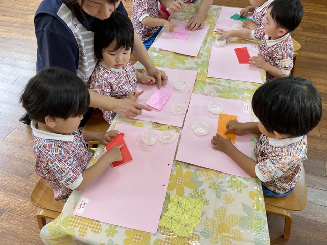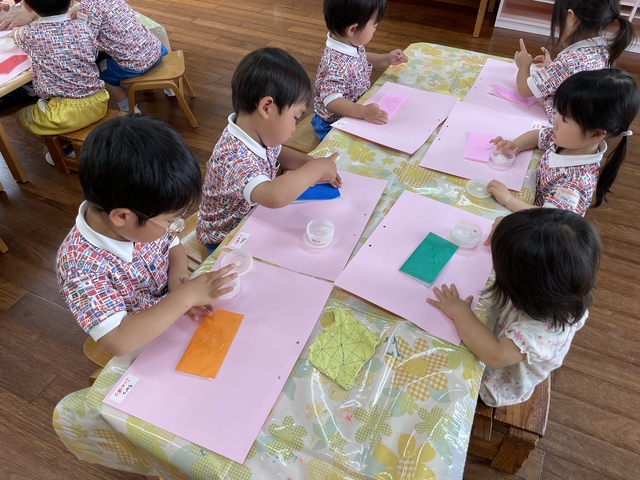 その後に折り紙にのりを付けて画用紙にぺったんこ!