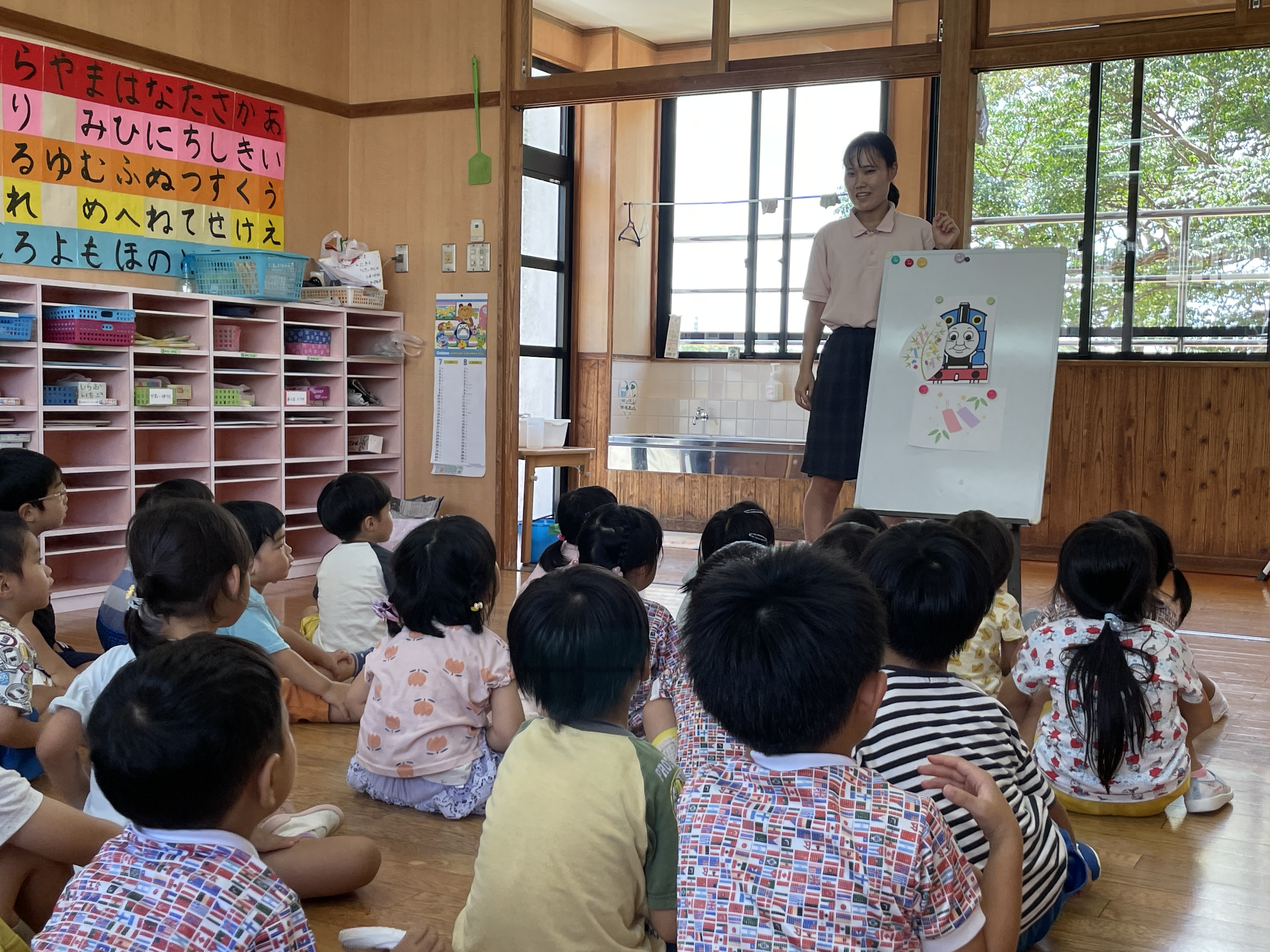 終業式では1学期の行事を振り返ったり、夏休みのお約束をしました。(バンビさんは午睡中でした)