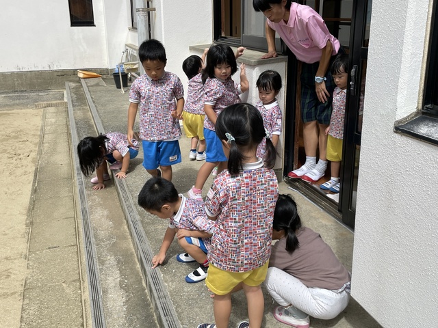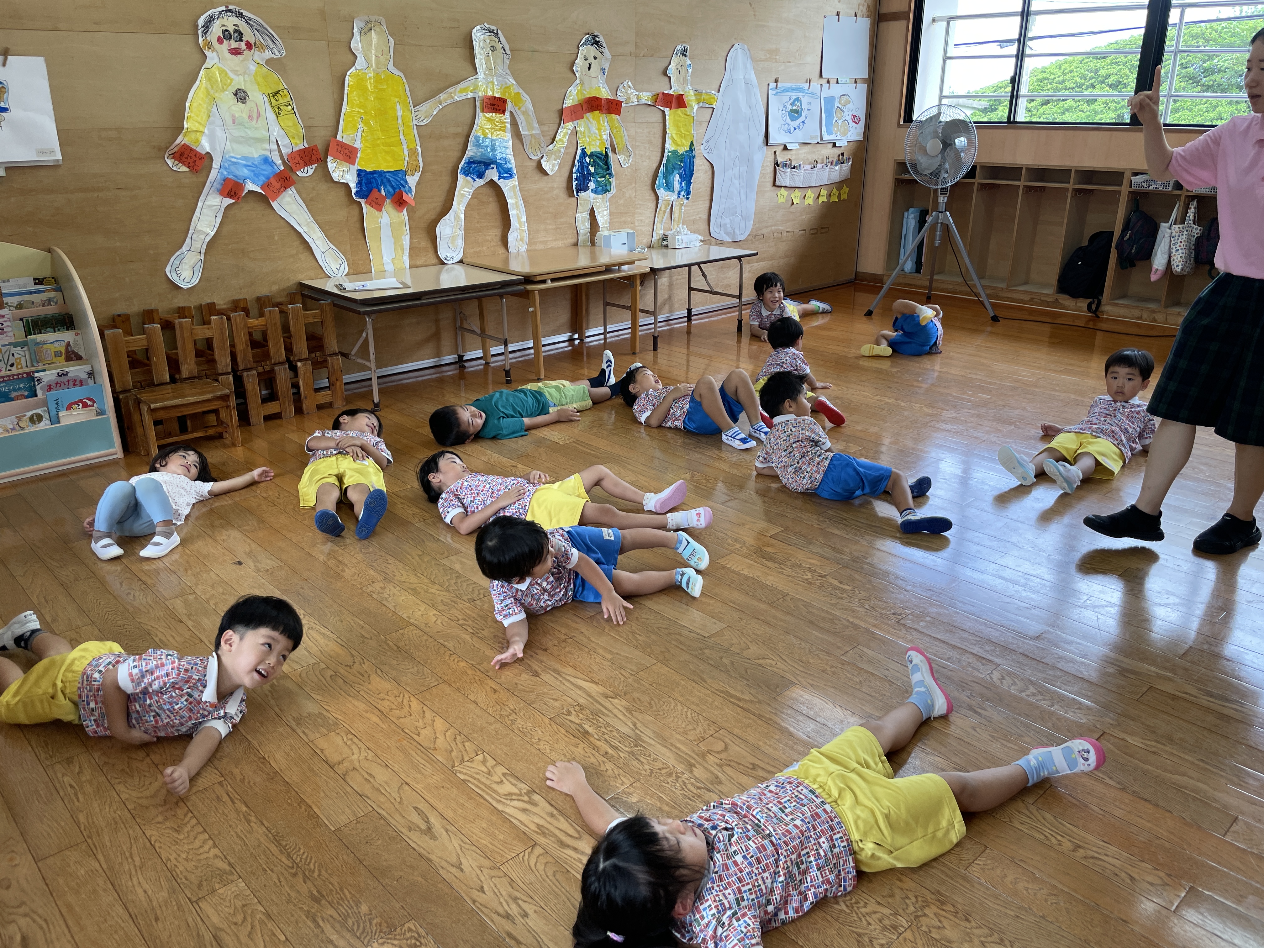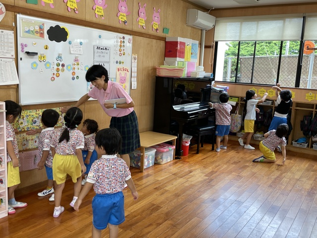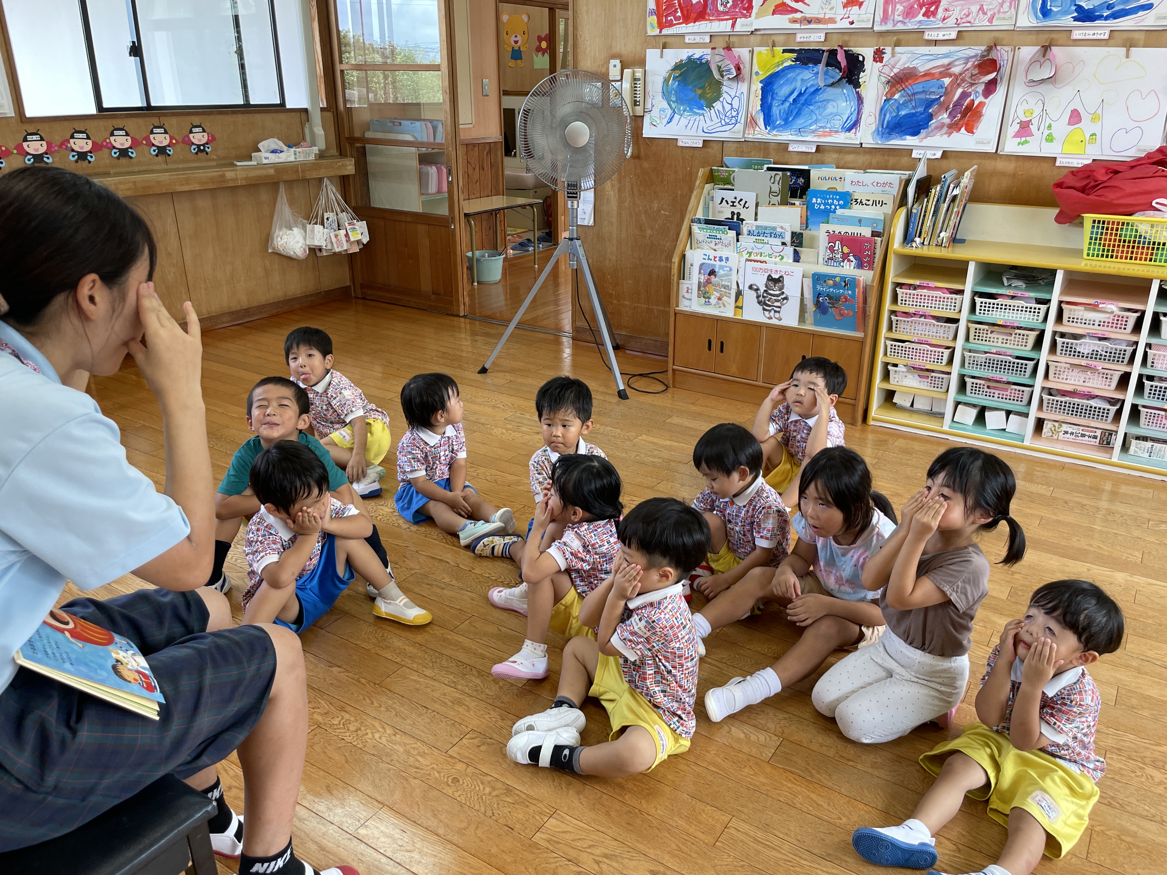 おじいちゃんの真似を楽しんでいました。おへそにちなんでみんなでかみなりゲームを楽しみました。
