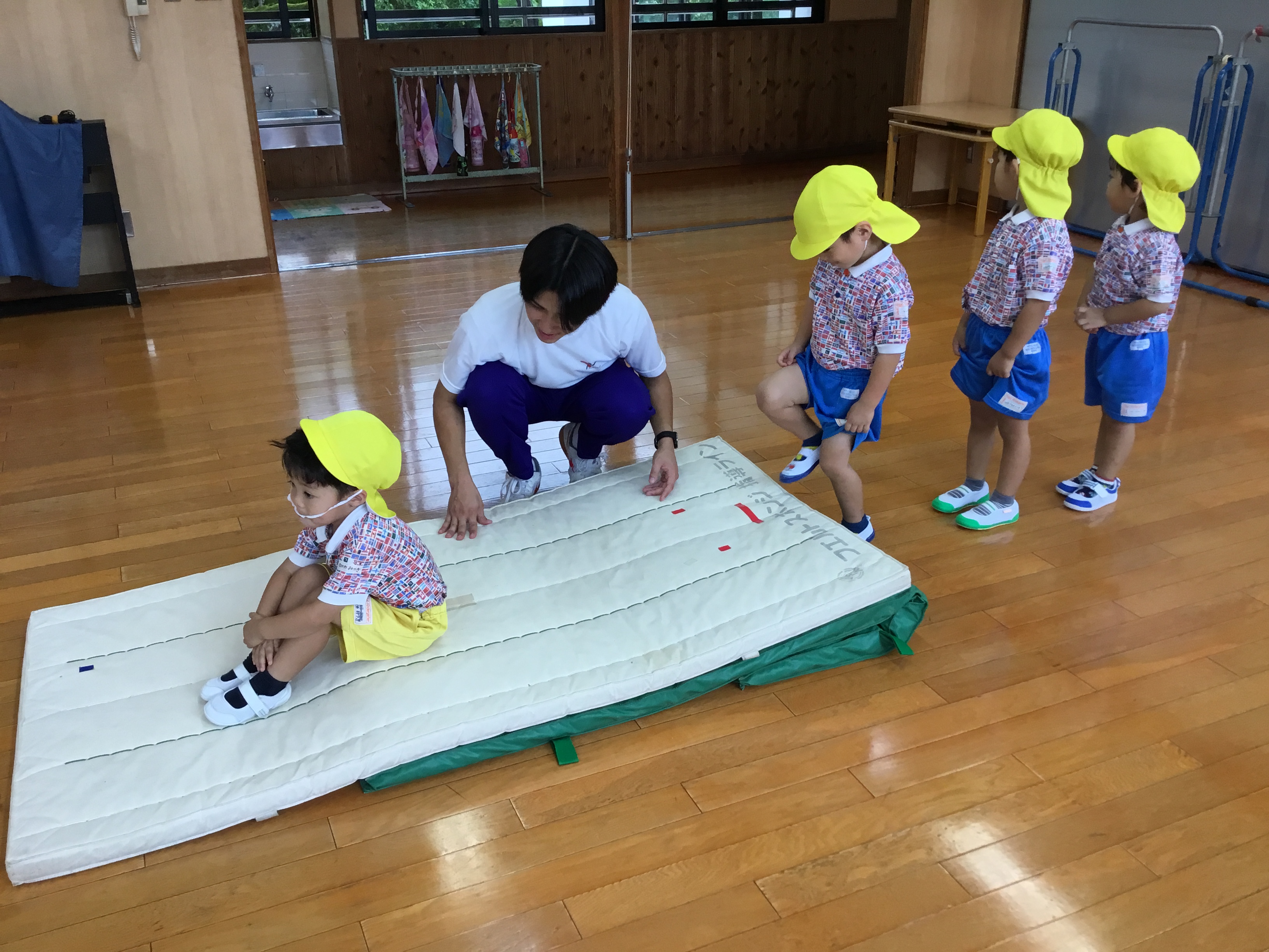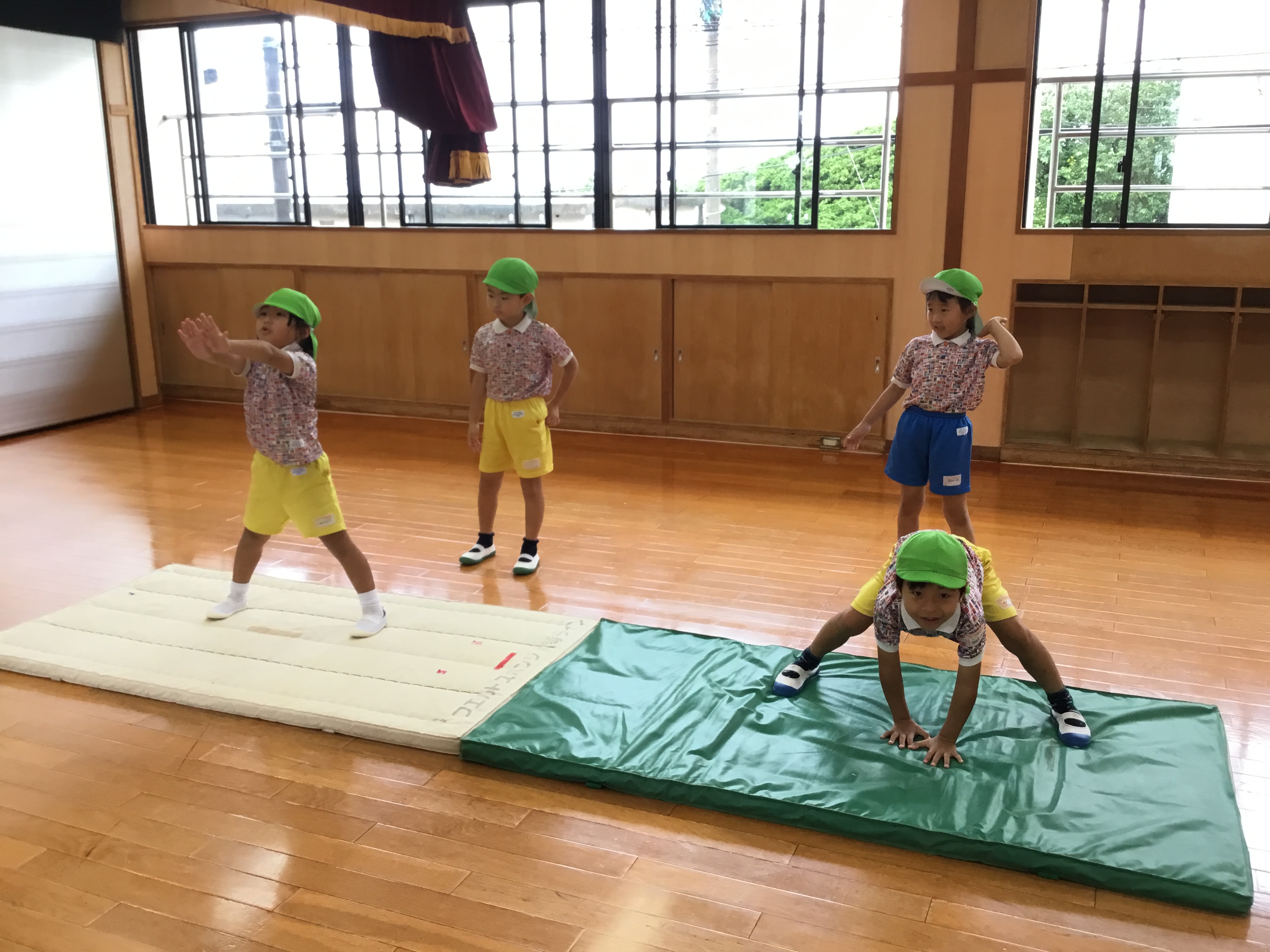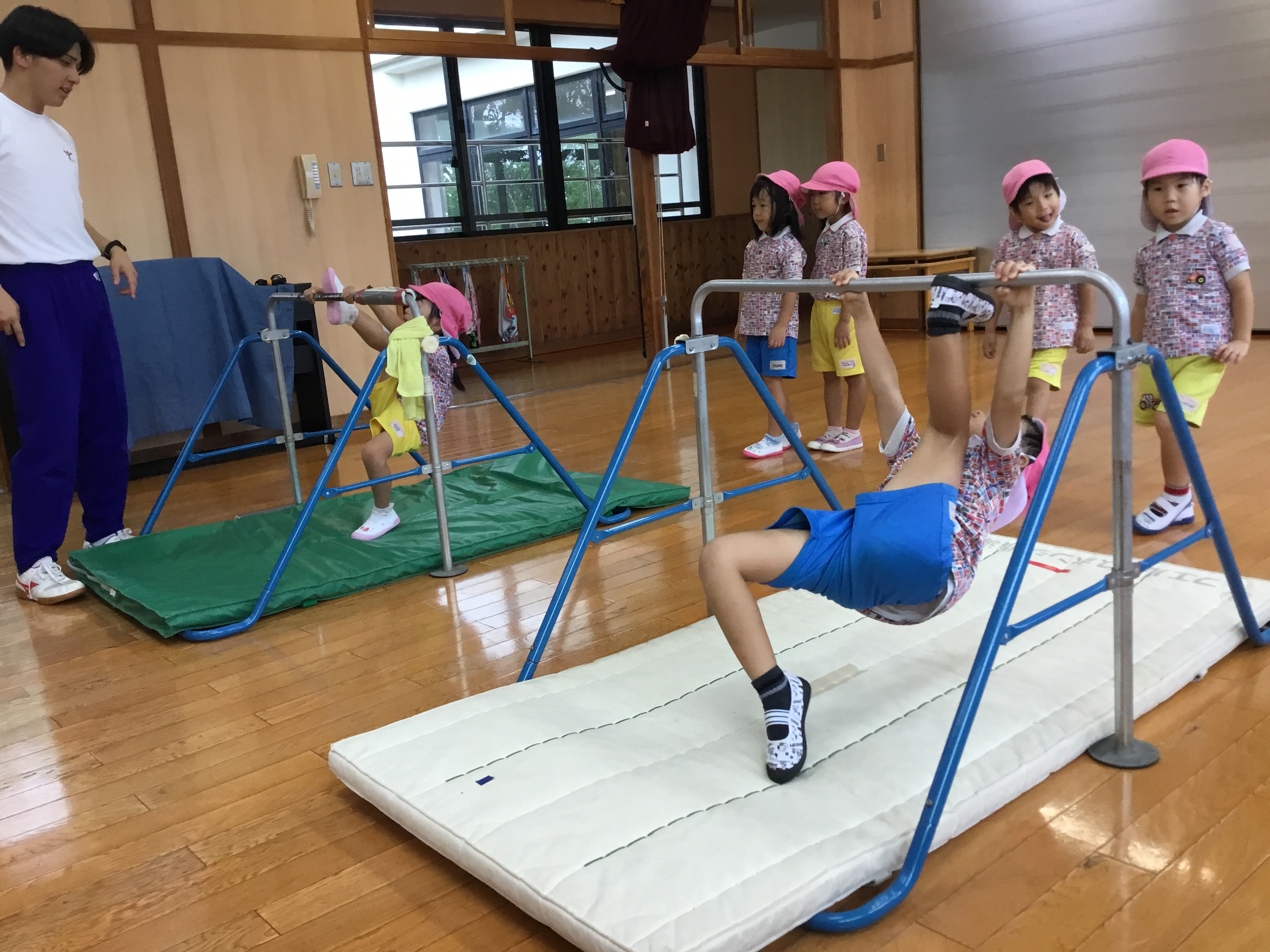 今日は雨天の為室内でマットや鉄棒を頑張りました!!!