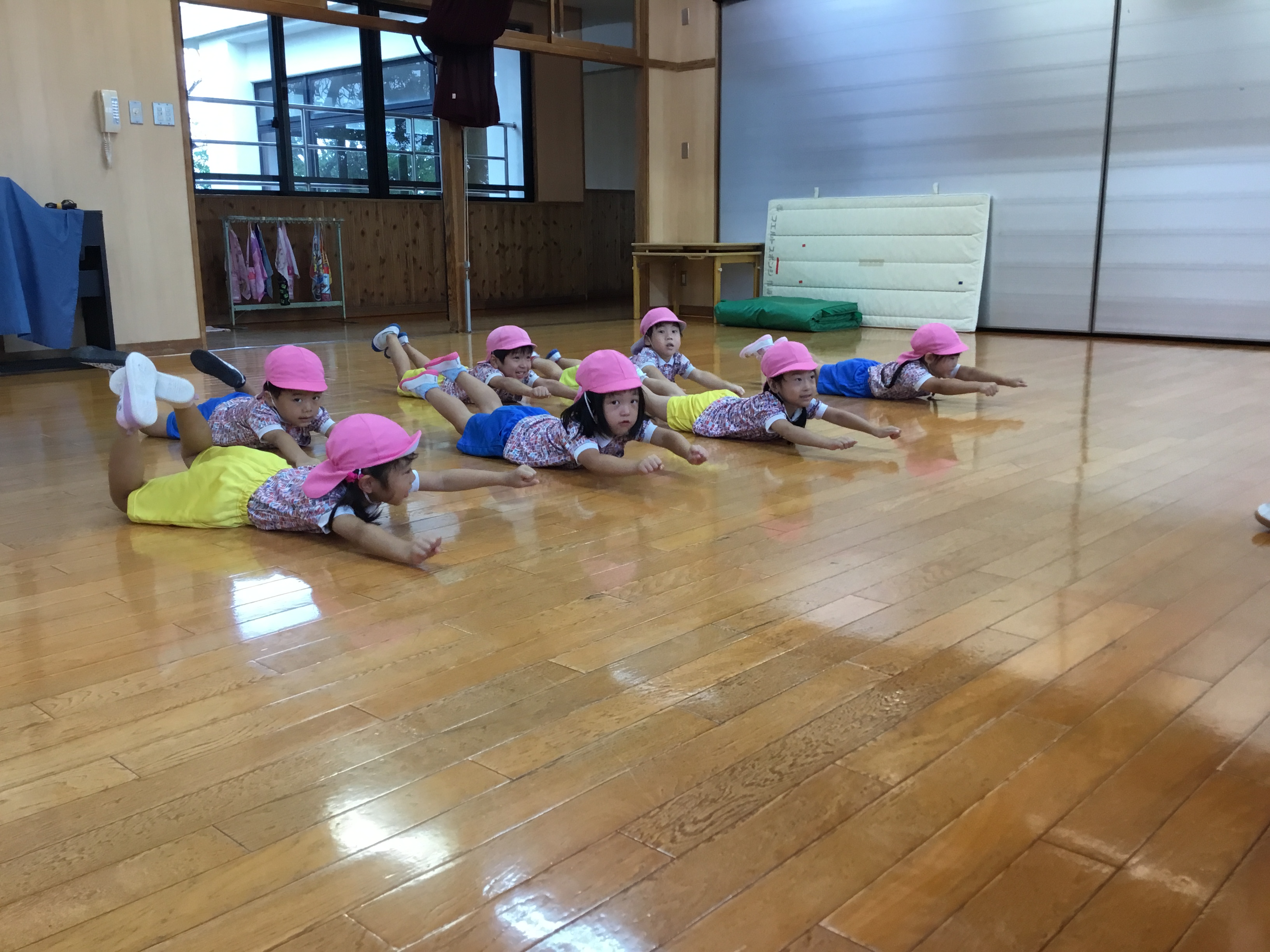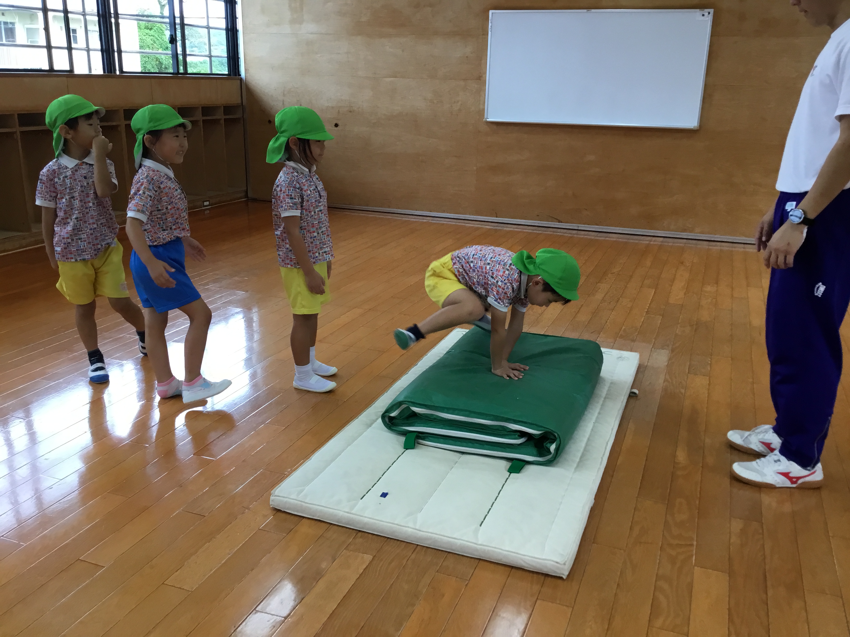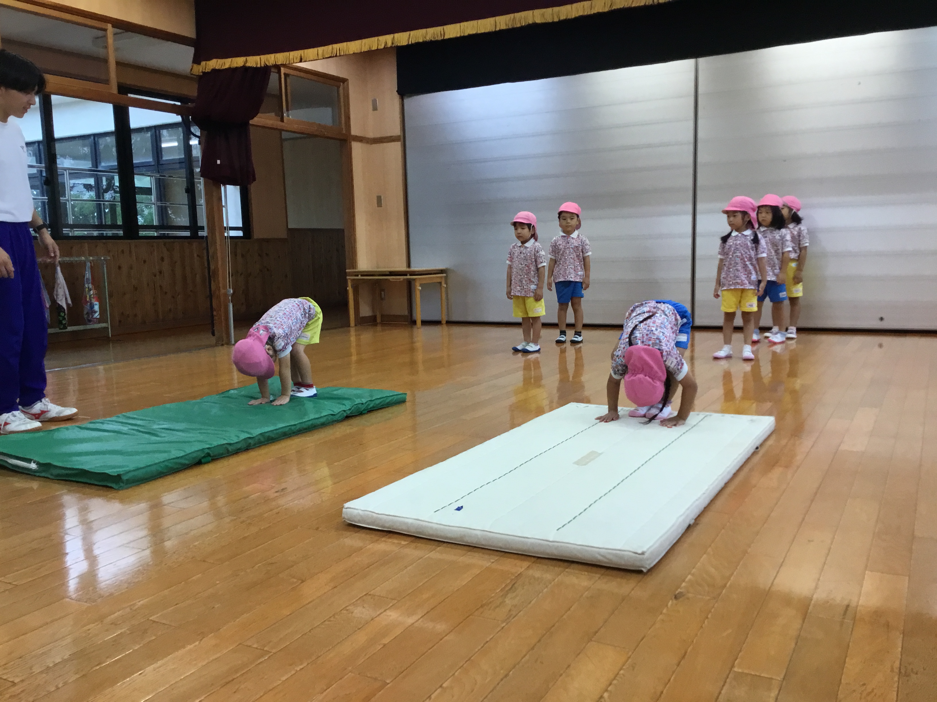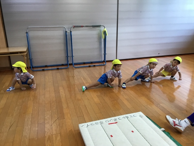 今日は雨天の為室内でマットや鉄棒を頑張りました!!!
