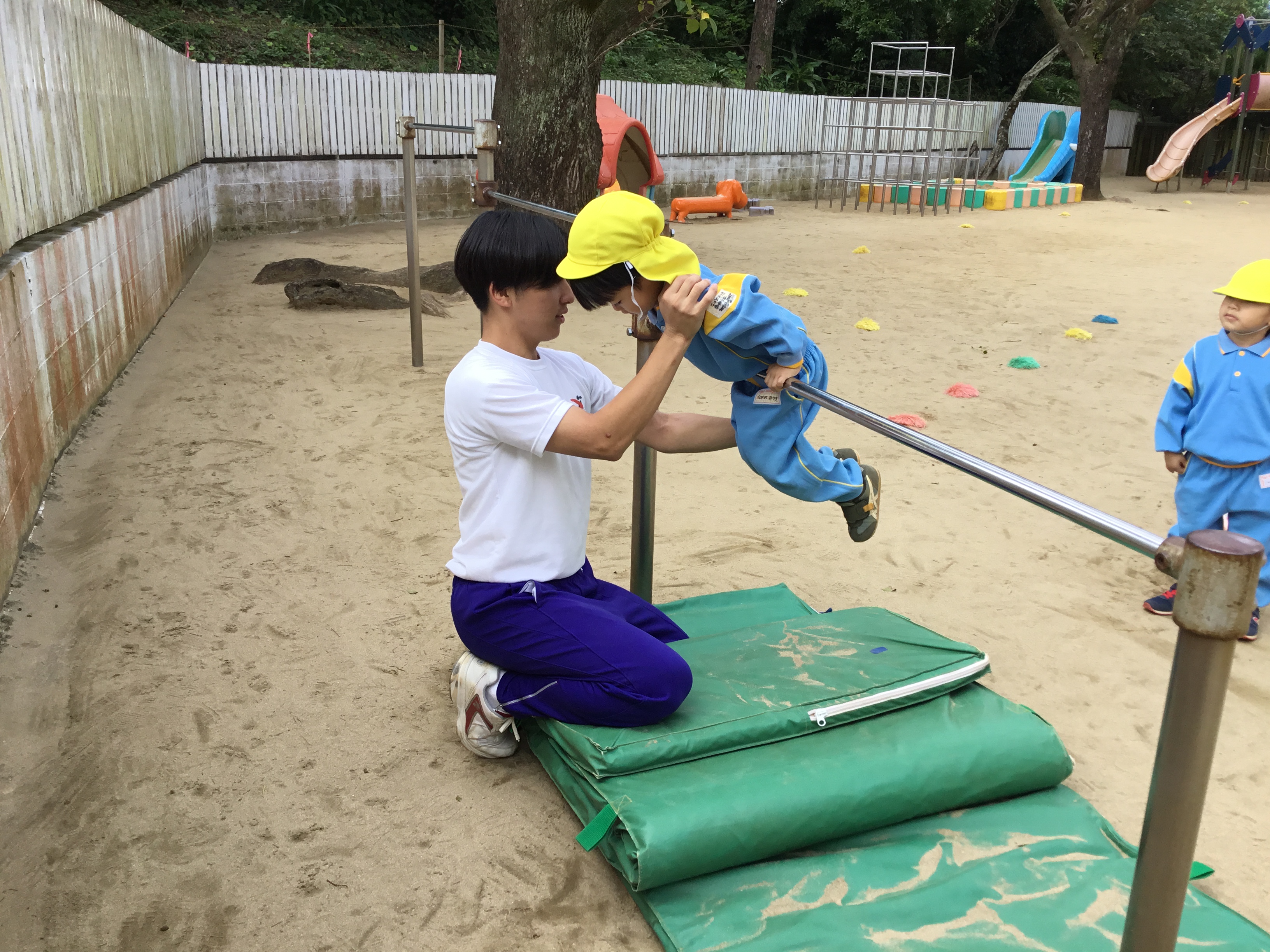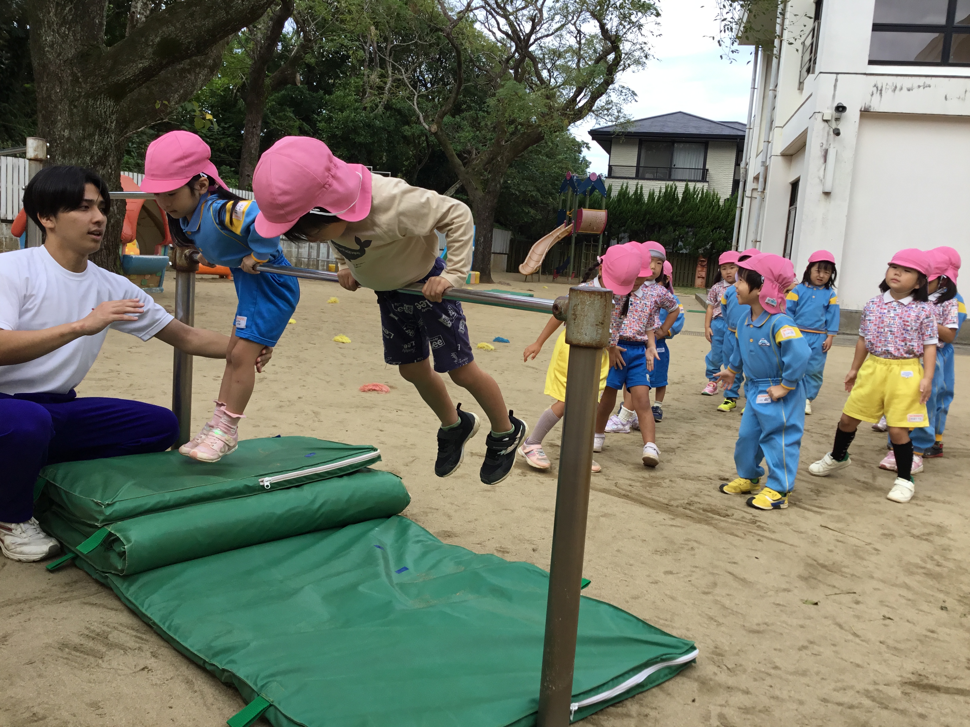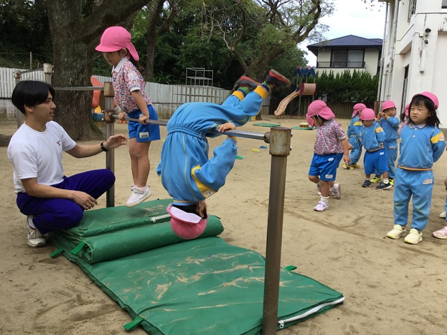 鉄棒では前回り、逆上がりの練習が始まりました。