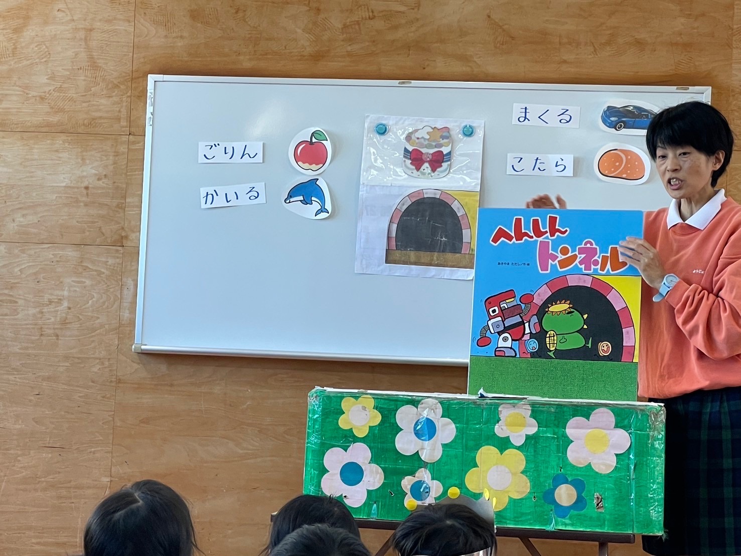 職員からのプレゼントは、大型絵本「へんしんトンネル」でした。