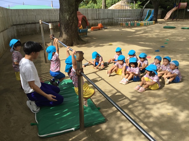鉄棒では前回りに向けて頑張りました。