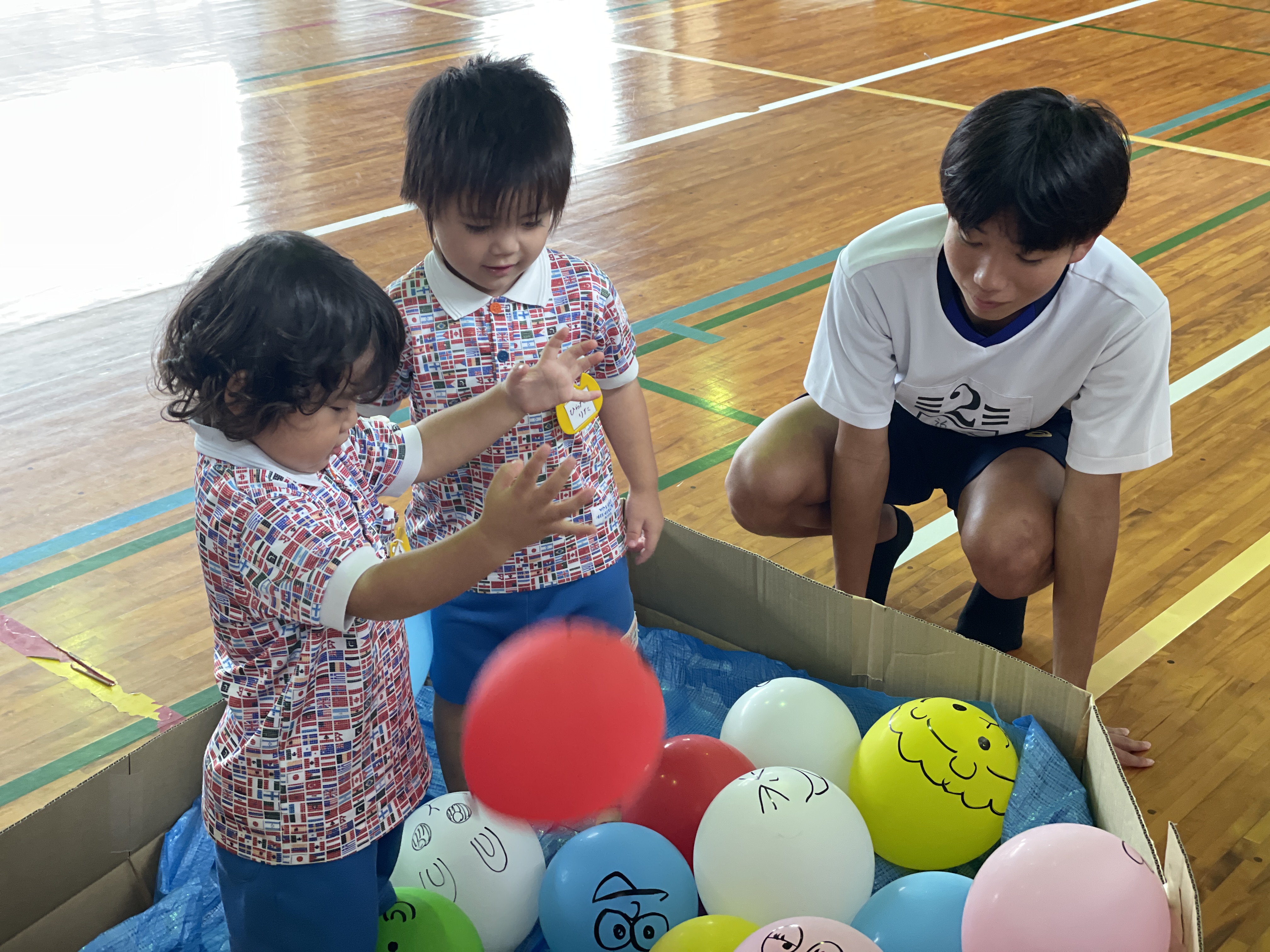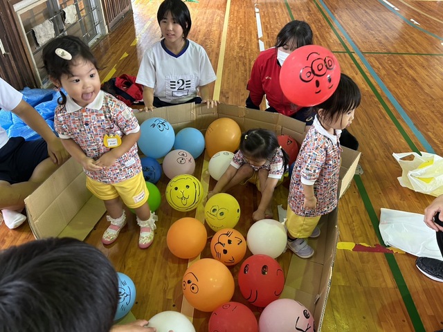 風船プールで遊んだり、モグラたたき、魚釣りなどを