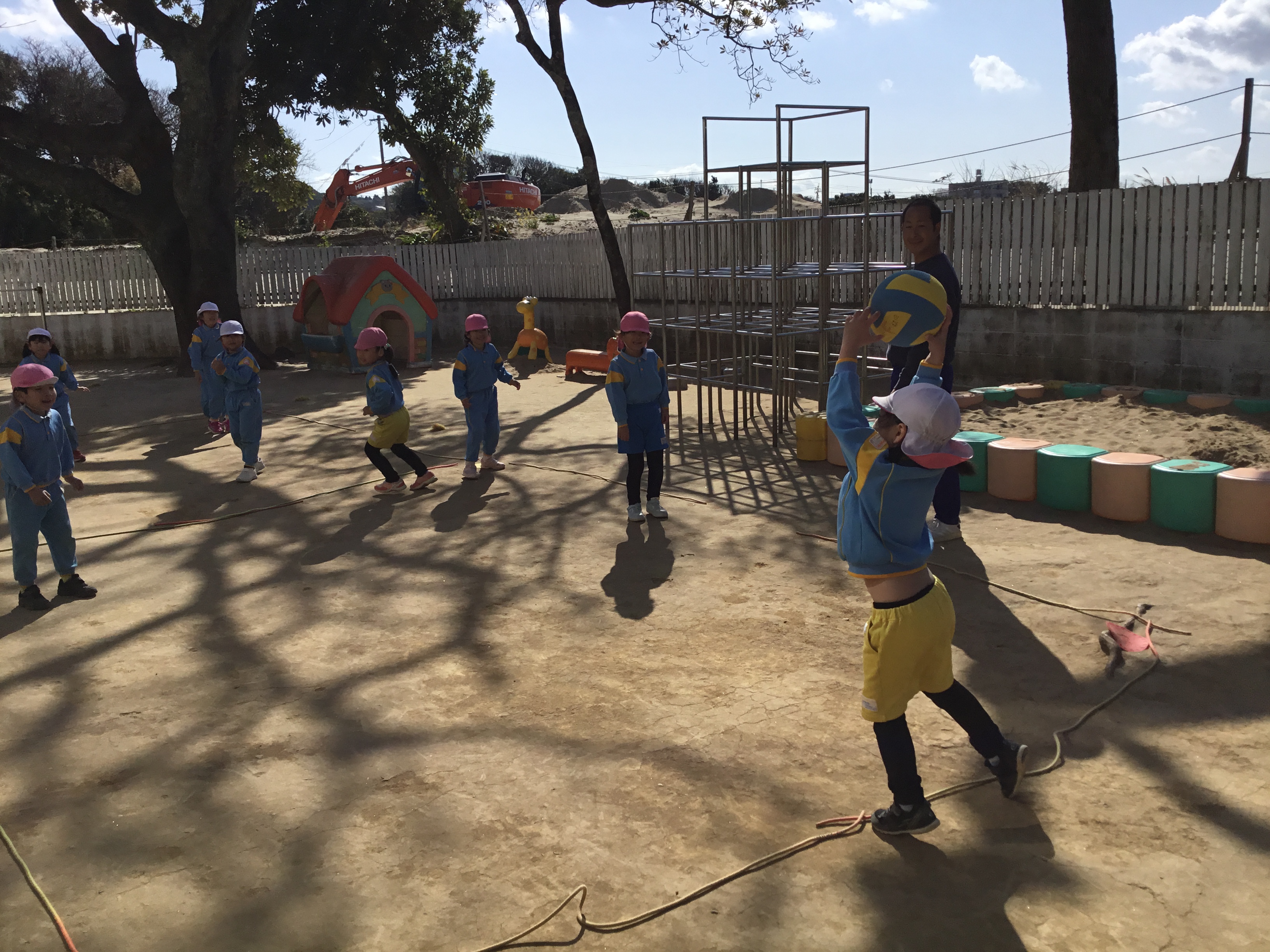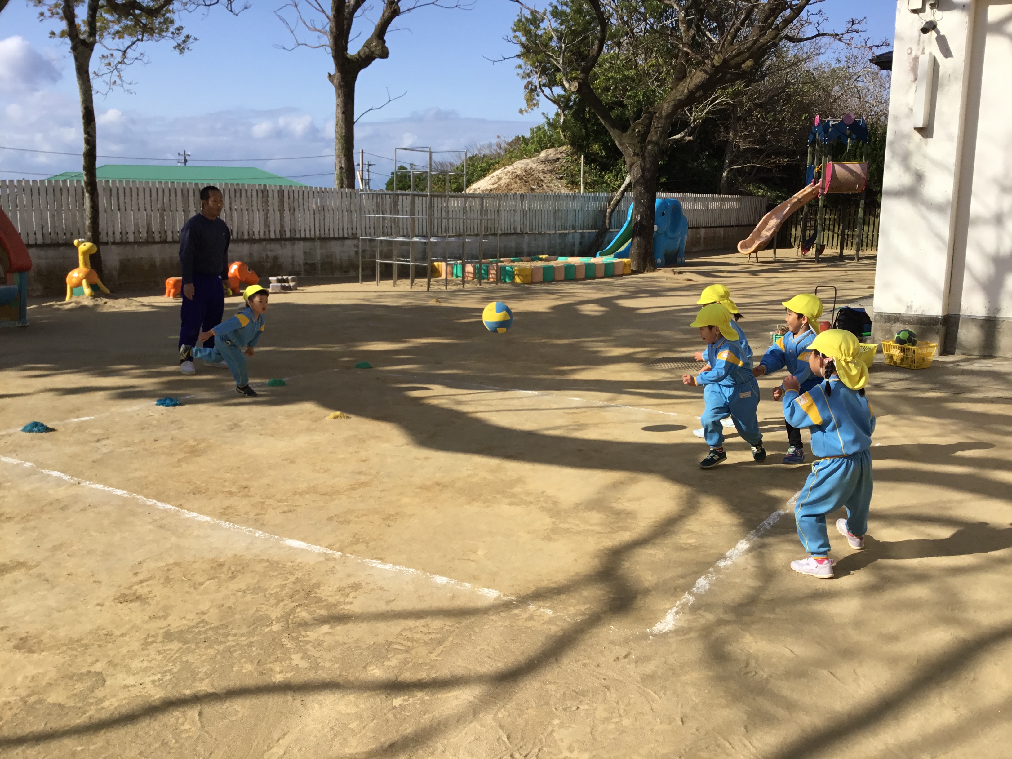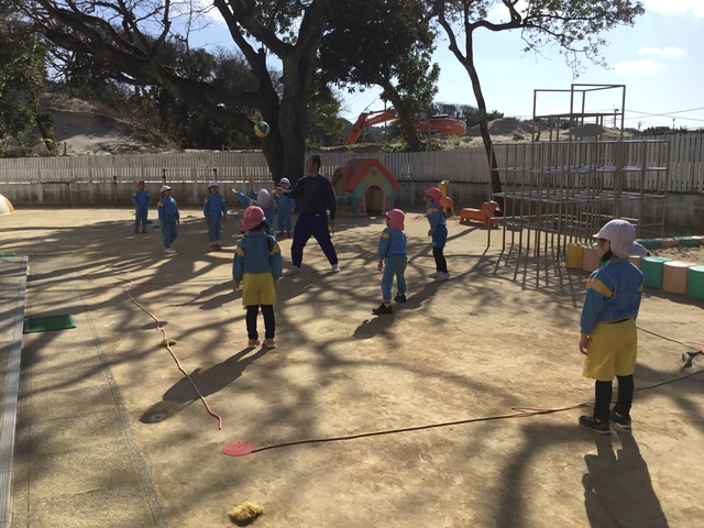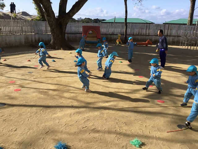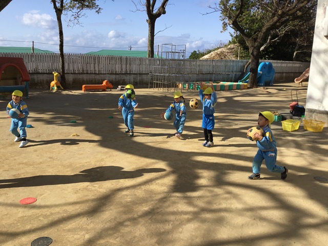 風が強い日でしたが、元気いっぱい園庭でスポーツタイムを