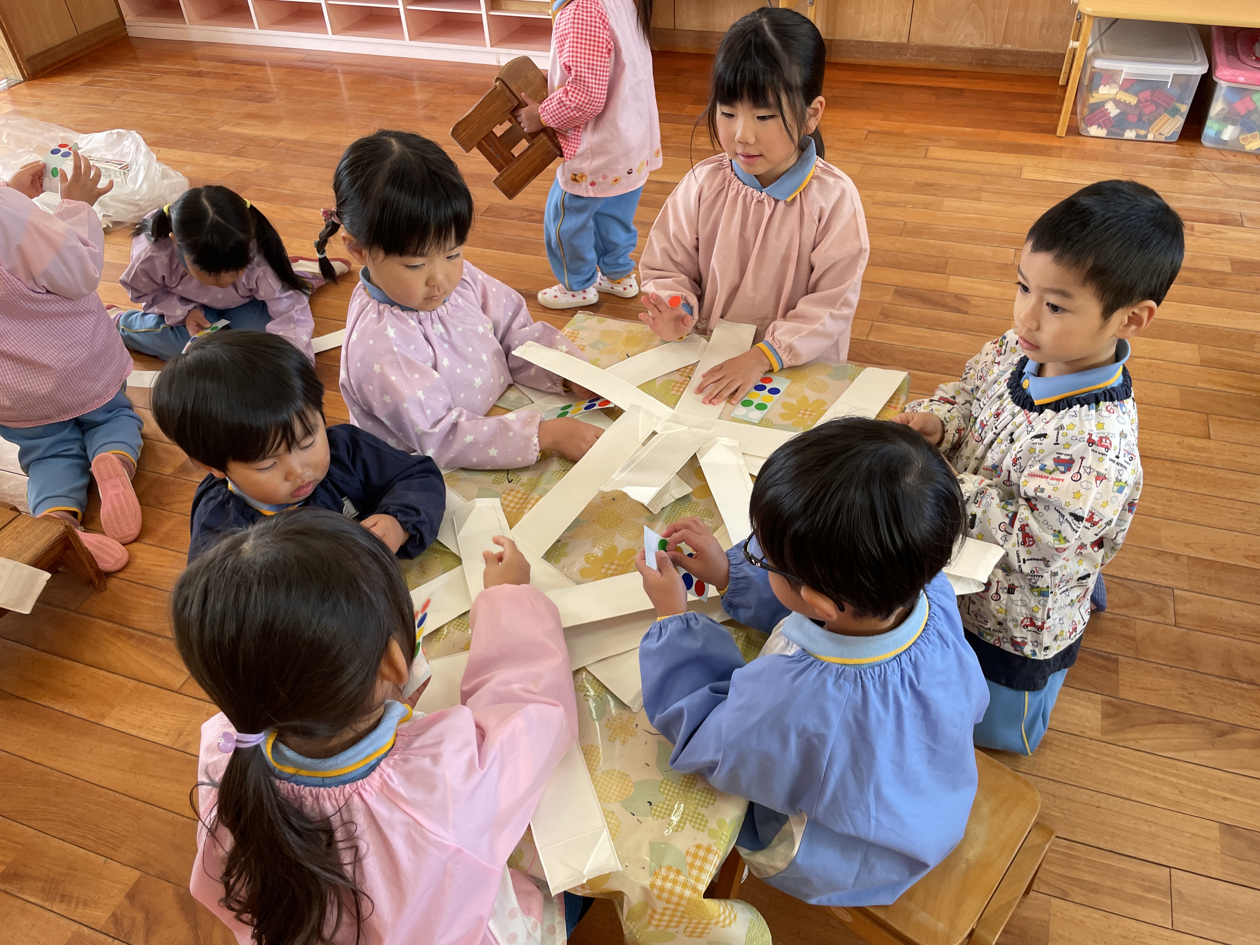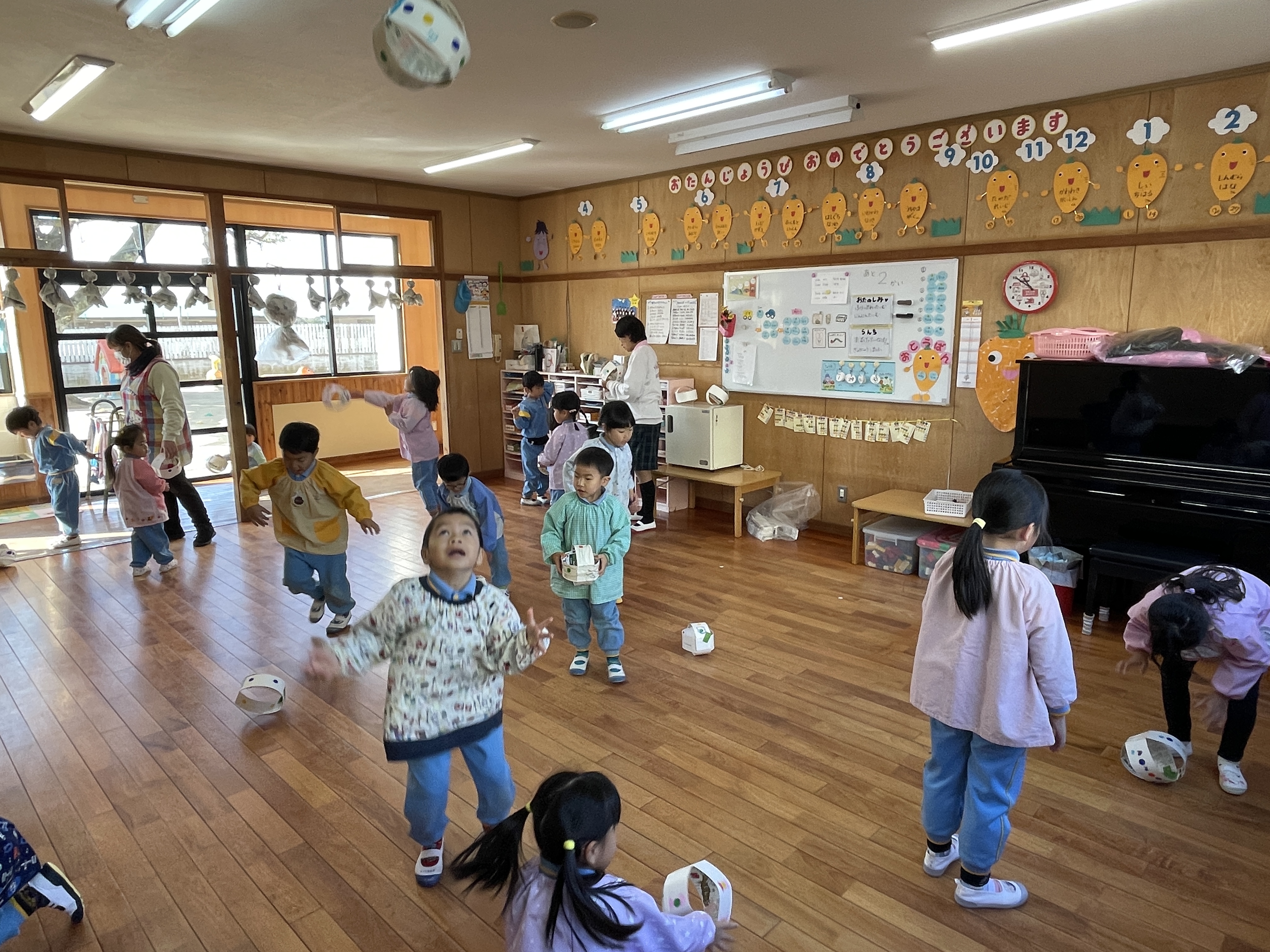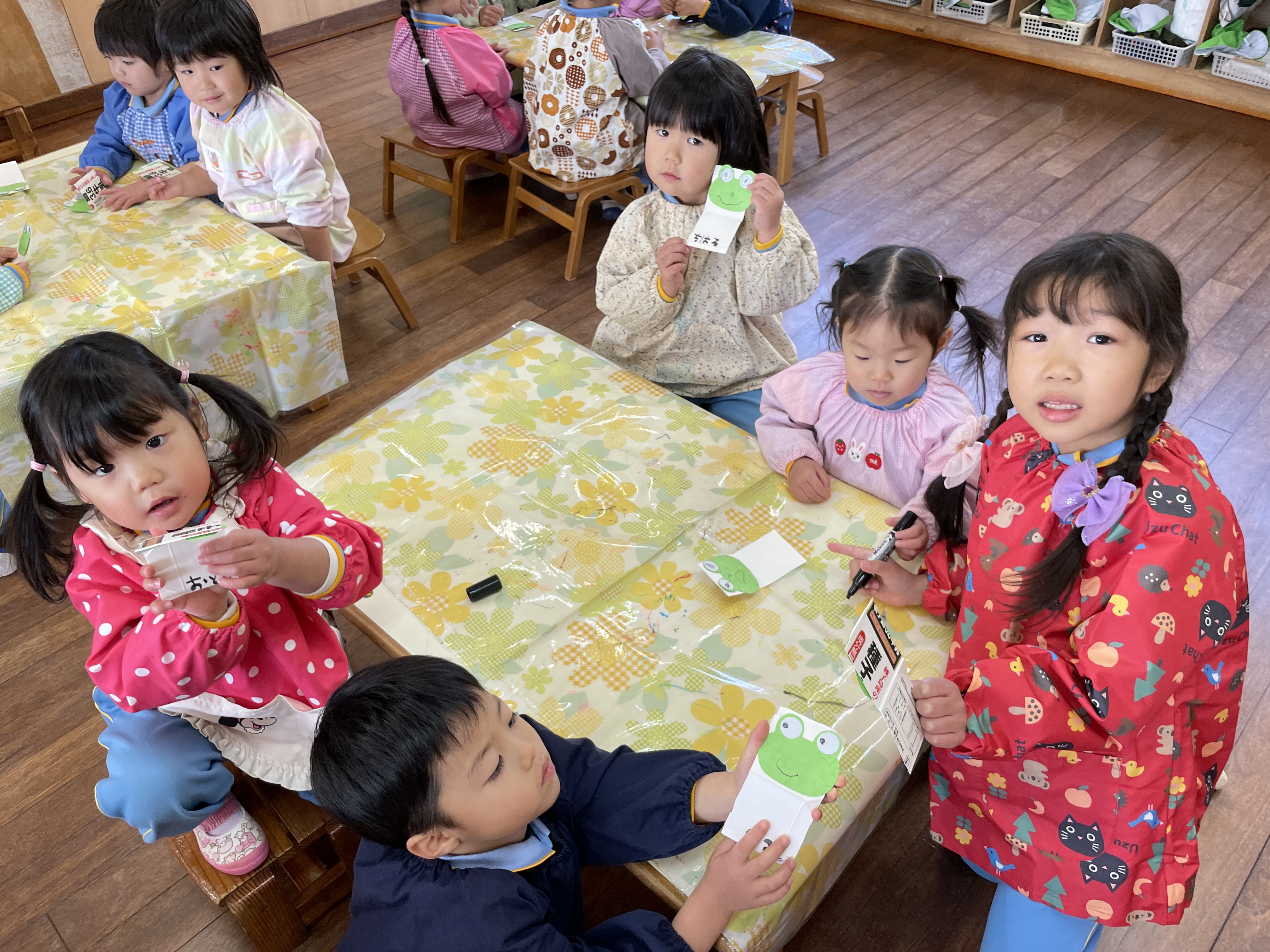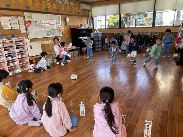 牛乳パックを使って、かえるピョンピョンチームとボールチームに分かれました。