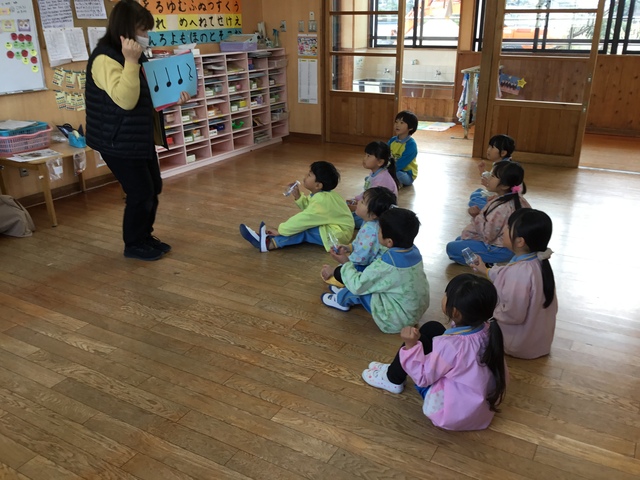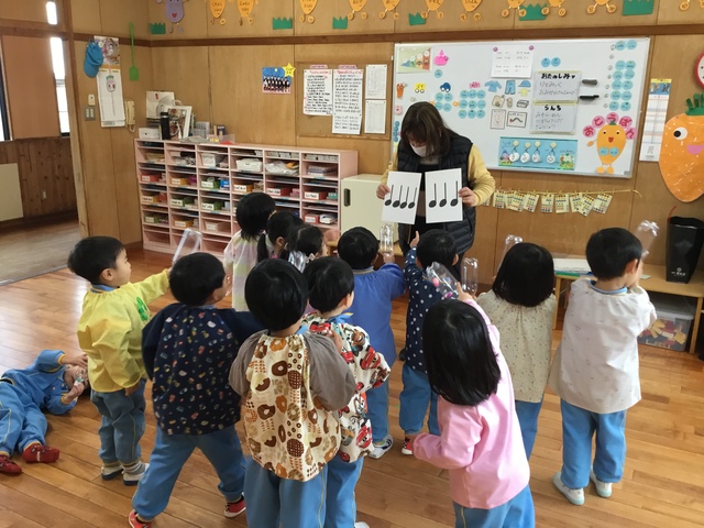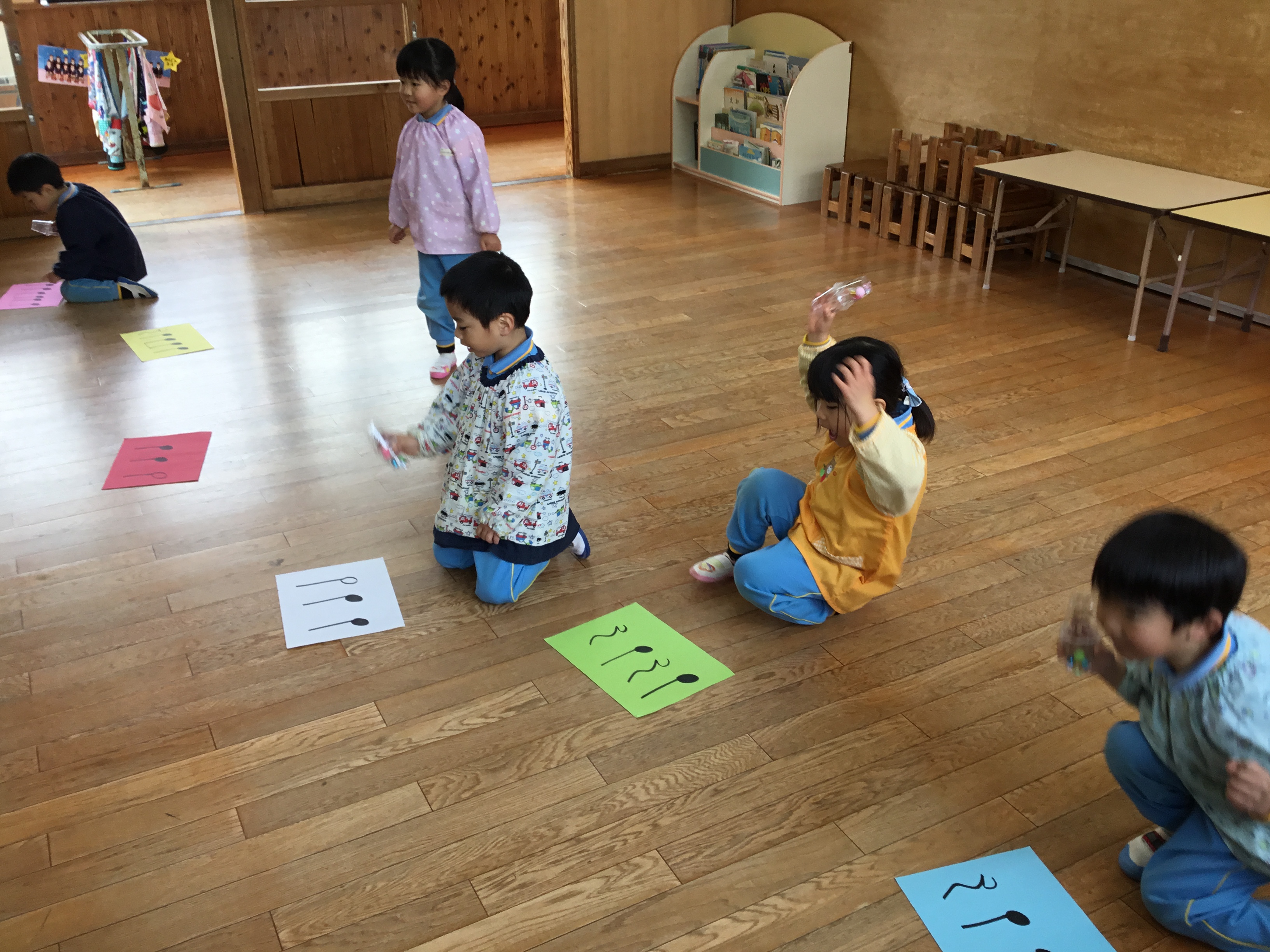 マラカスの音を鳴らしながら、リズム打ちをしたり、ピアノに合わせて