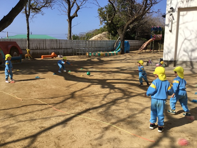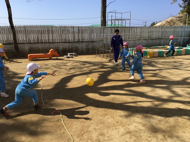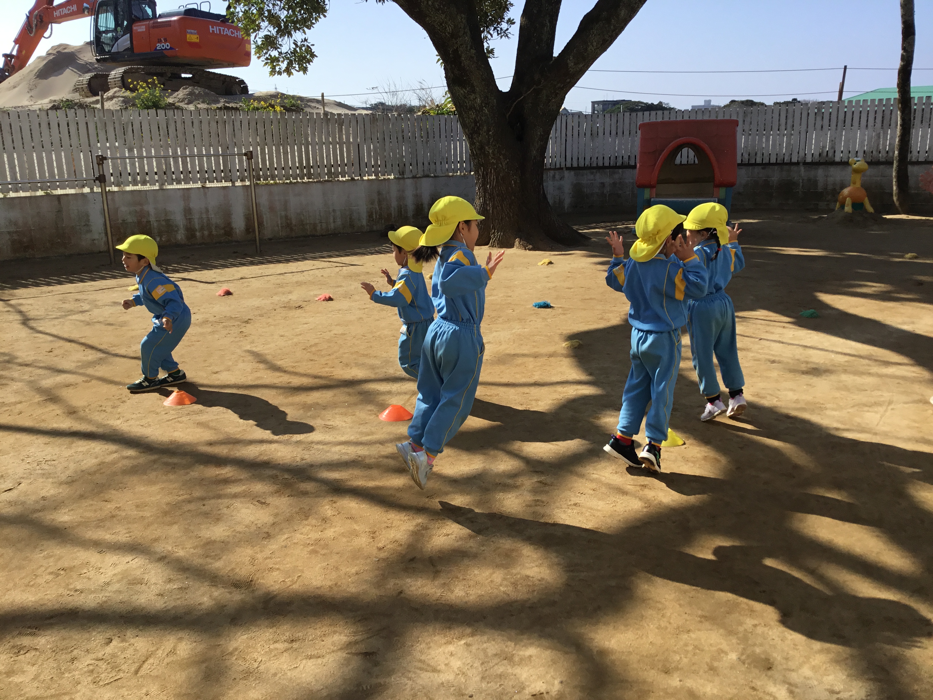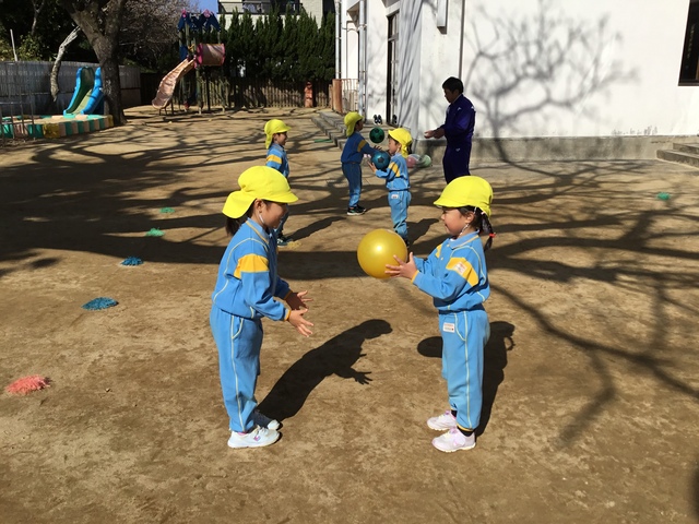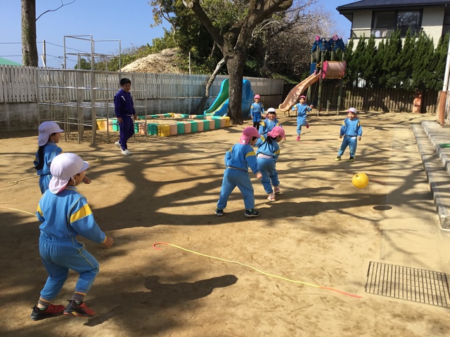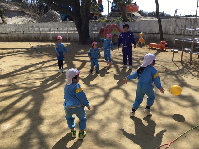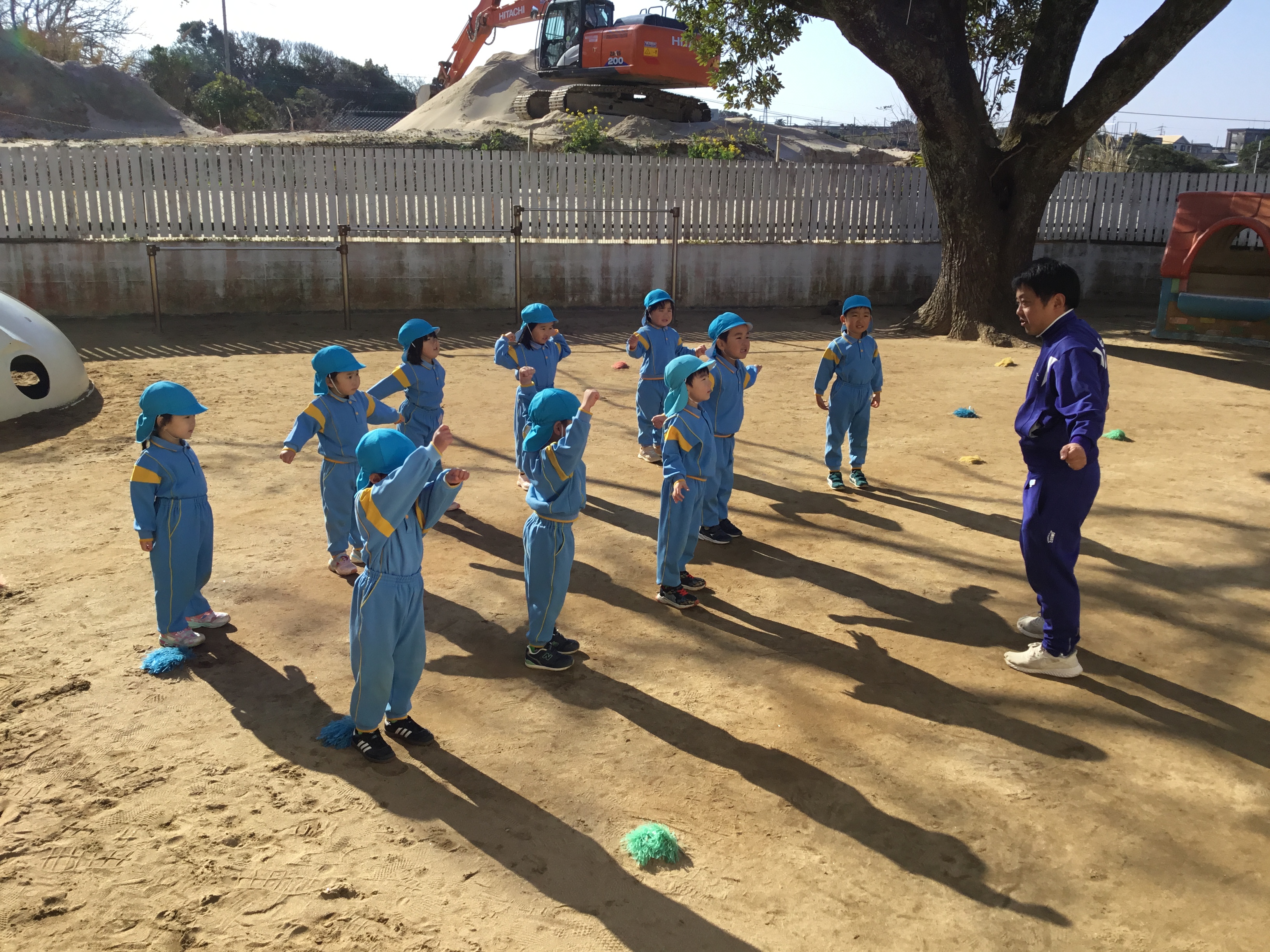 ぽかぽか陽気の園庭で元気いっぱいのスポーツタイムがありました。