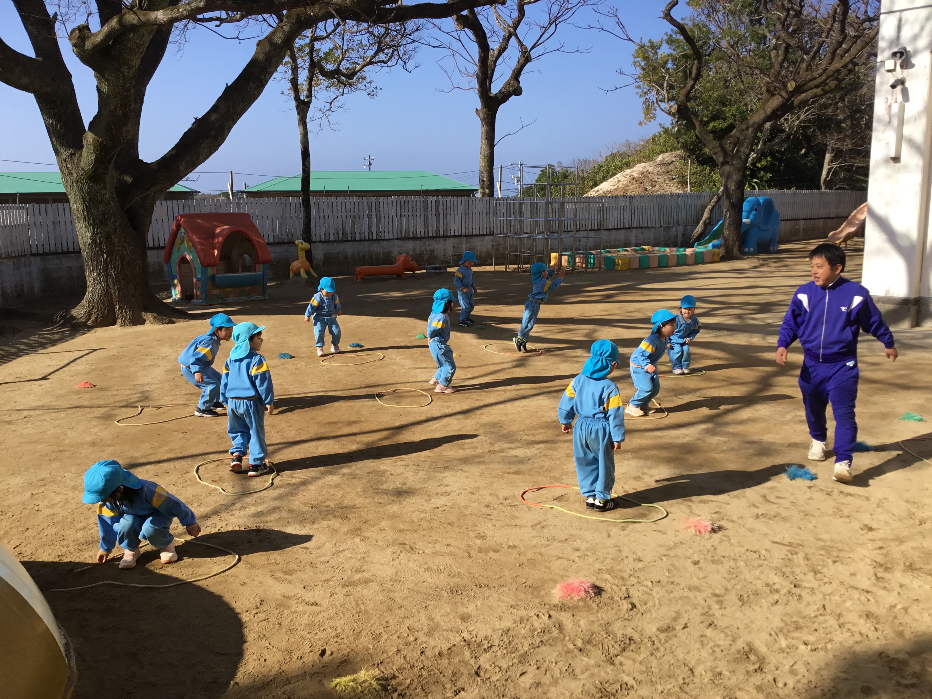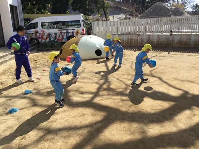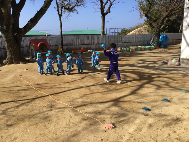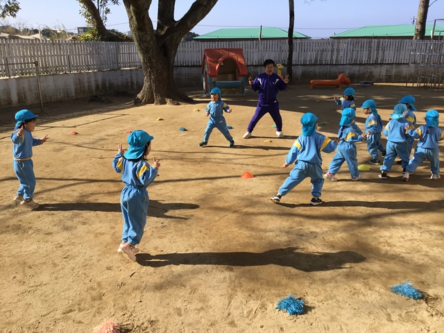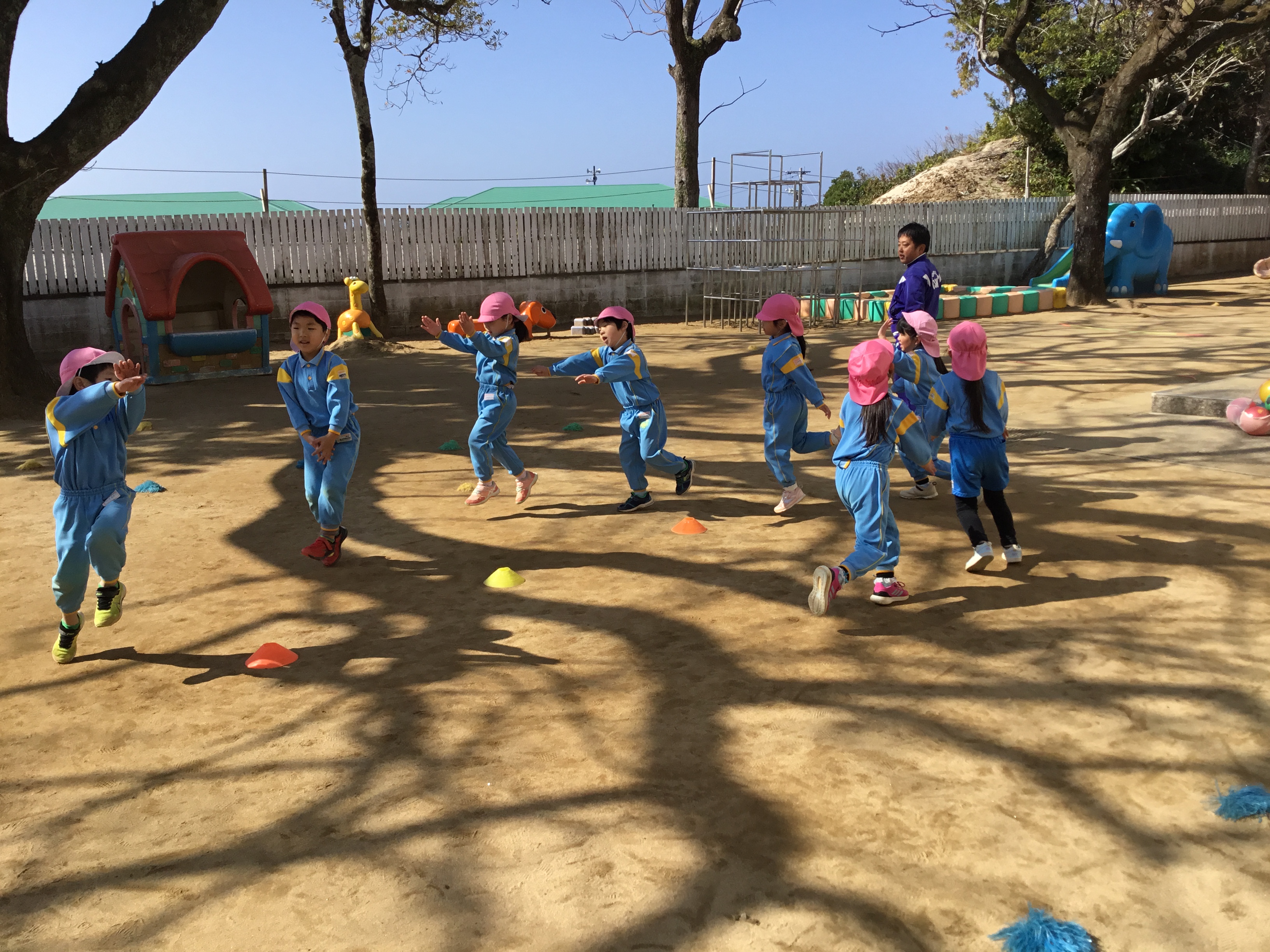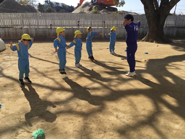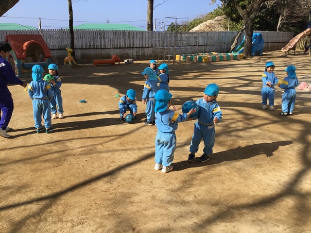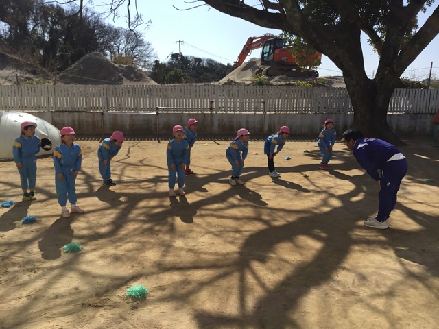 ぽかぽか陽気の園庭で元気いっぱいのスポーツタイムがありました。