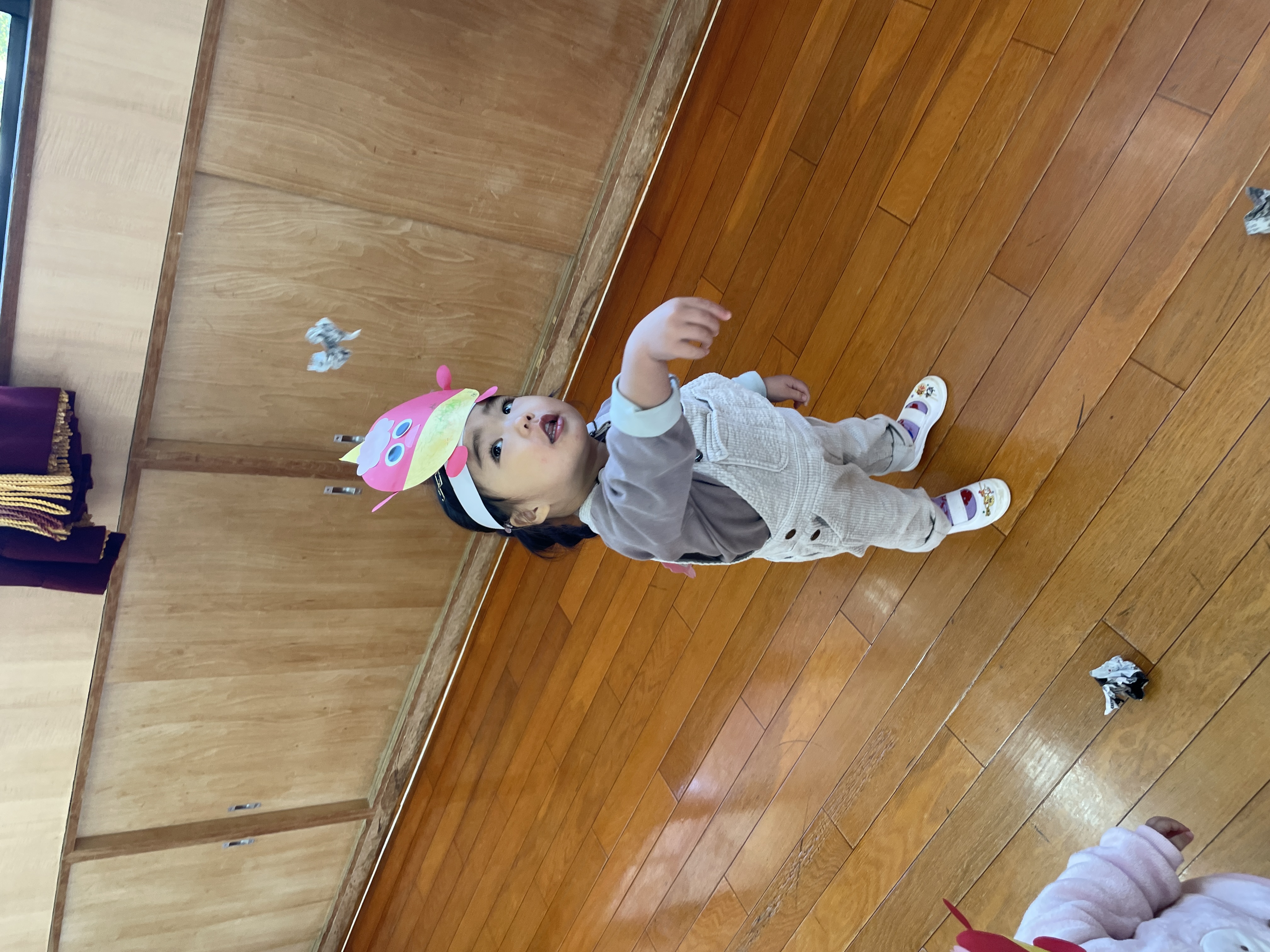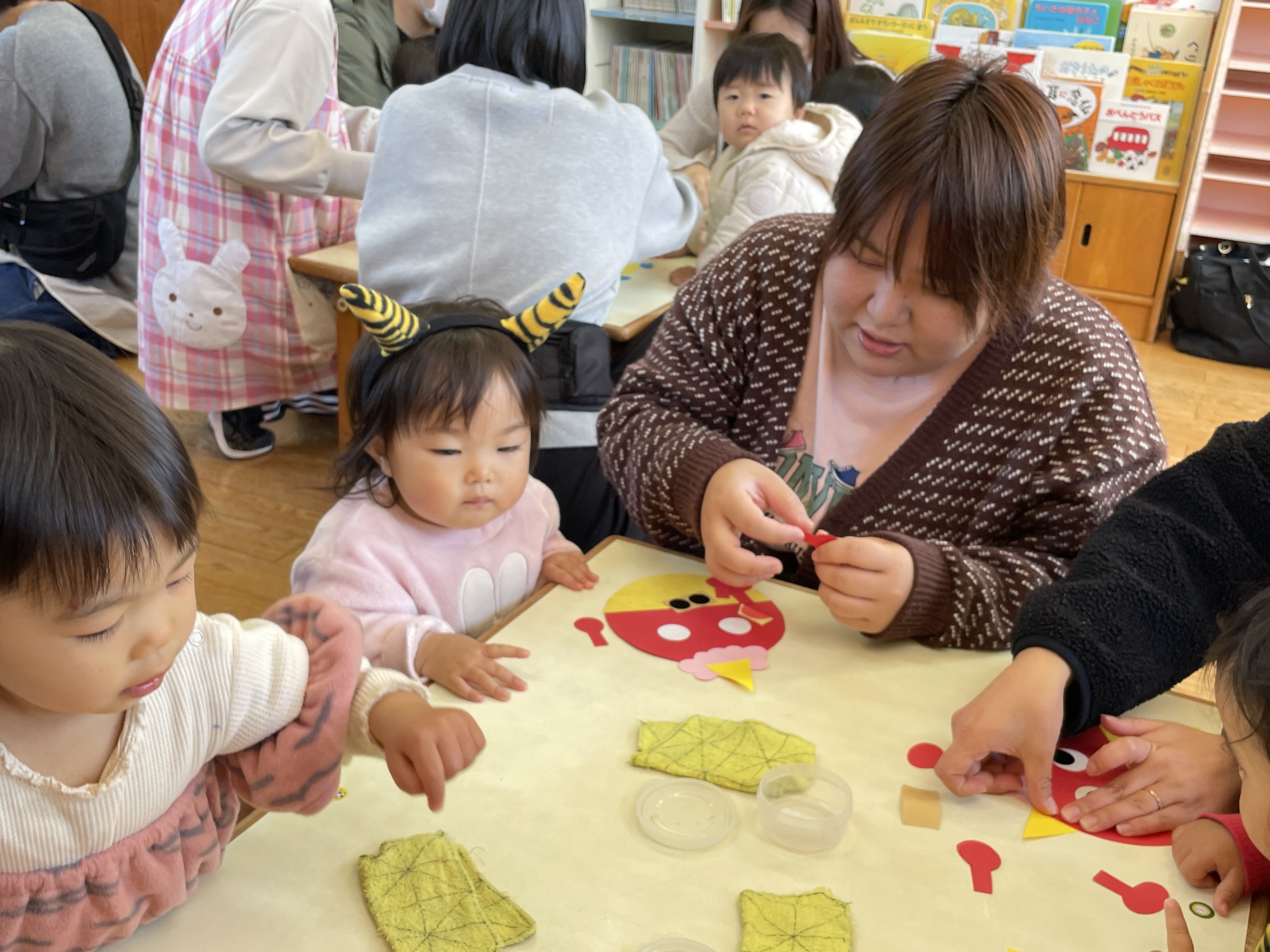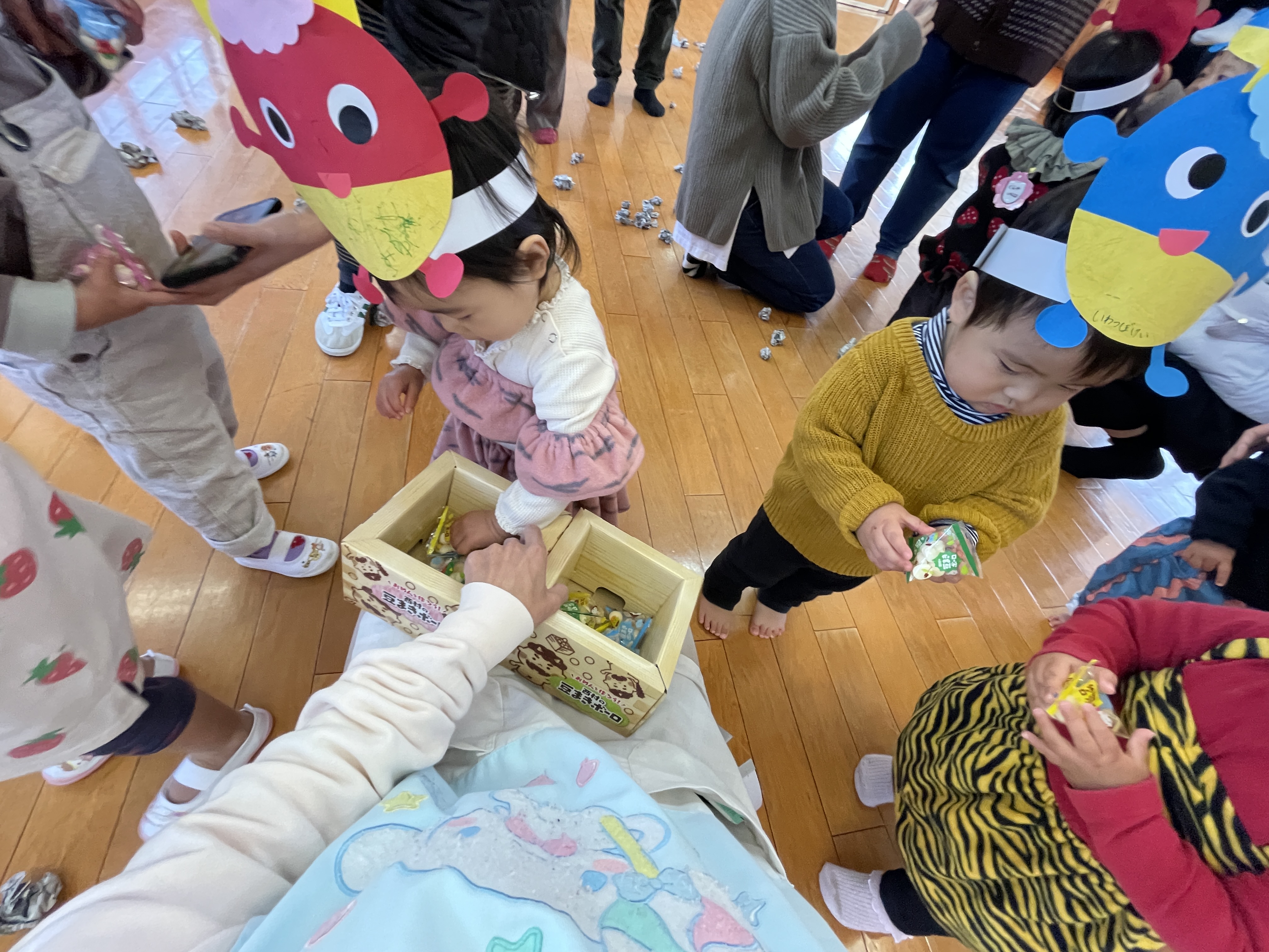 がんばったごほうびにおやつをもらって喜ぶかわいい鬼ちゃんたちでした。